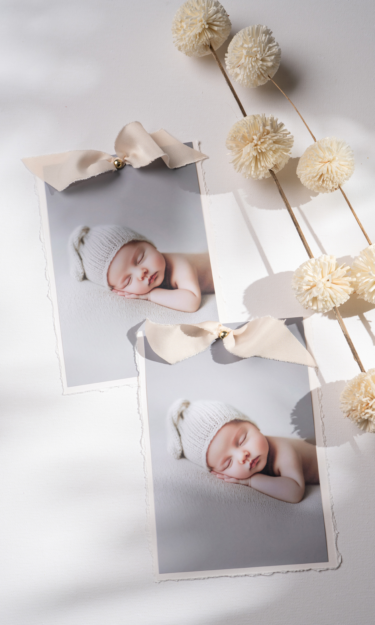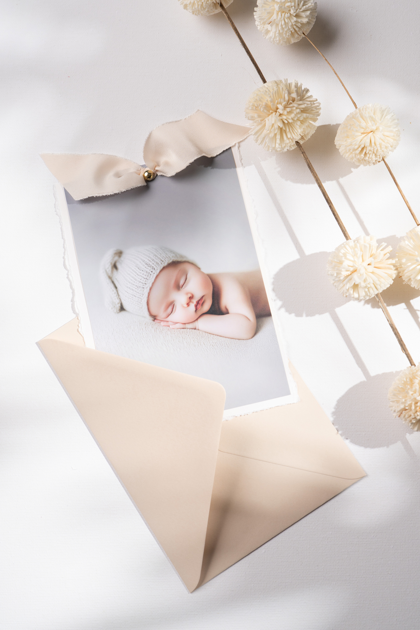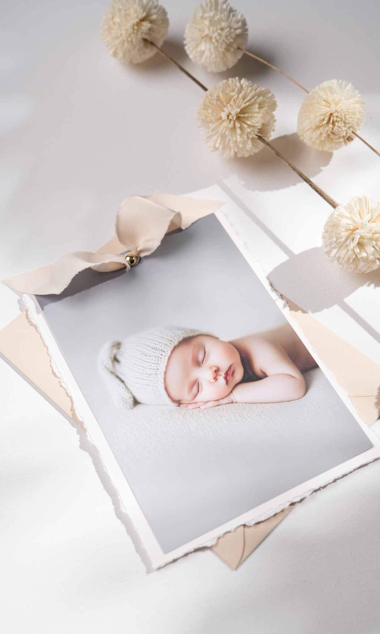 Elegancka forma zaproszenia w postaci dwóch kart – zaproszenia oraz uroczego zdjęcia dziecka, wydrukowanego na matowym papierze fotograficznym. Obie karty są połączone ozdobnym, złotym nitem, do którego przymocowana jest jedwabna tasiemka w delikatnym, beżowym odcieniu.