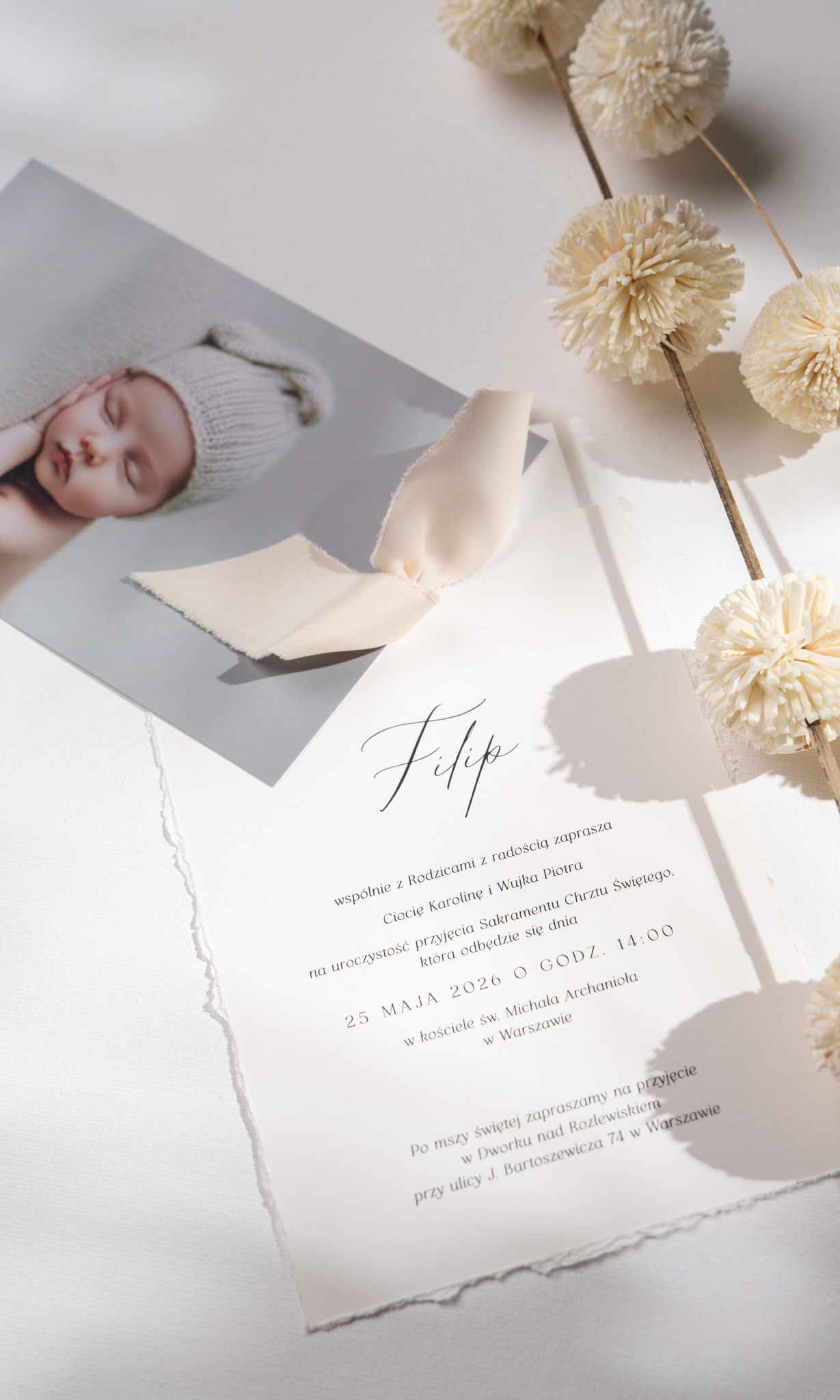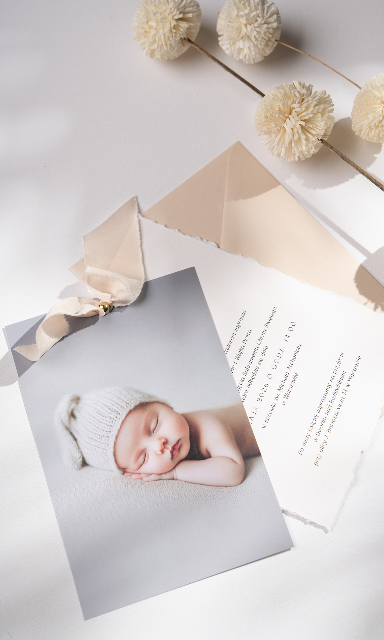 Delikatne zaproszenia na Chrzest ze zdjęciem i wstążką – beżowe
