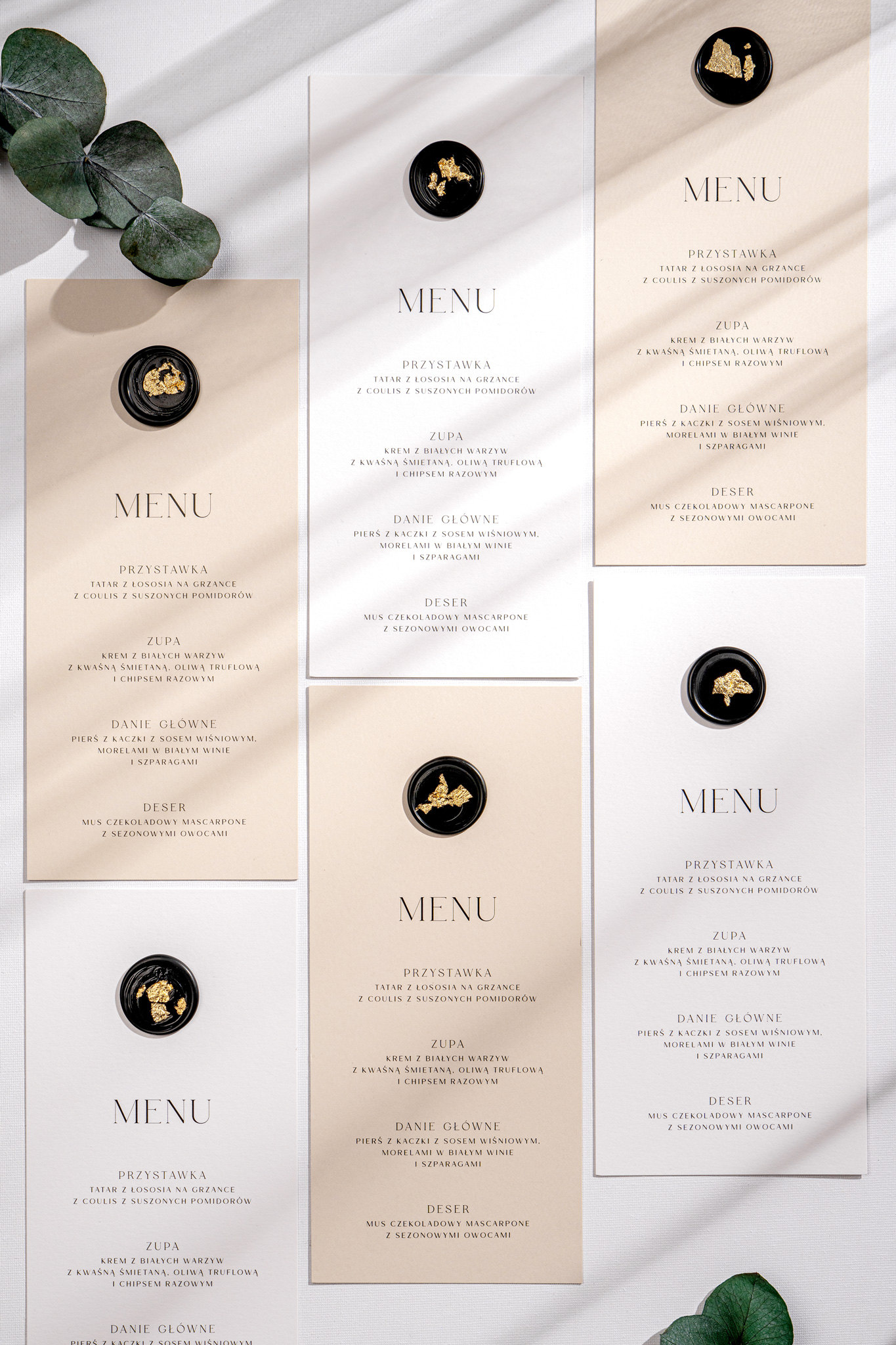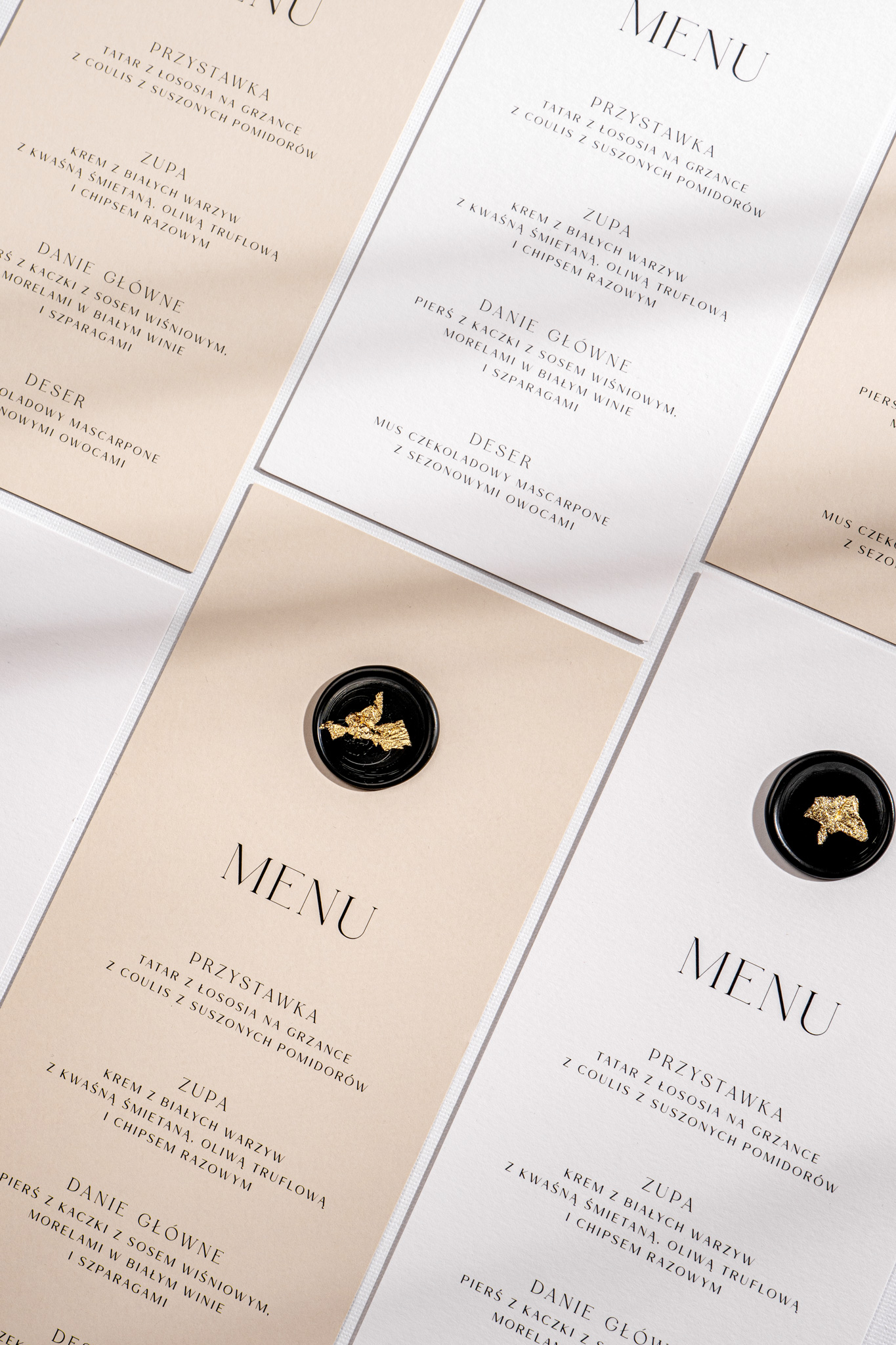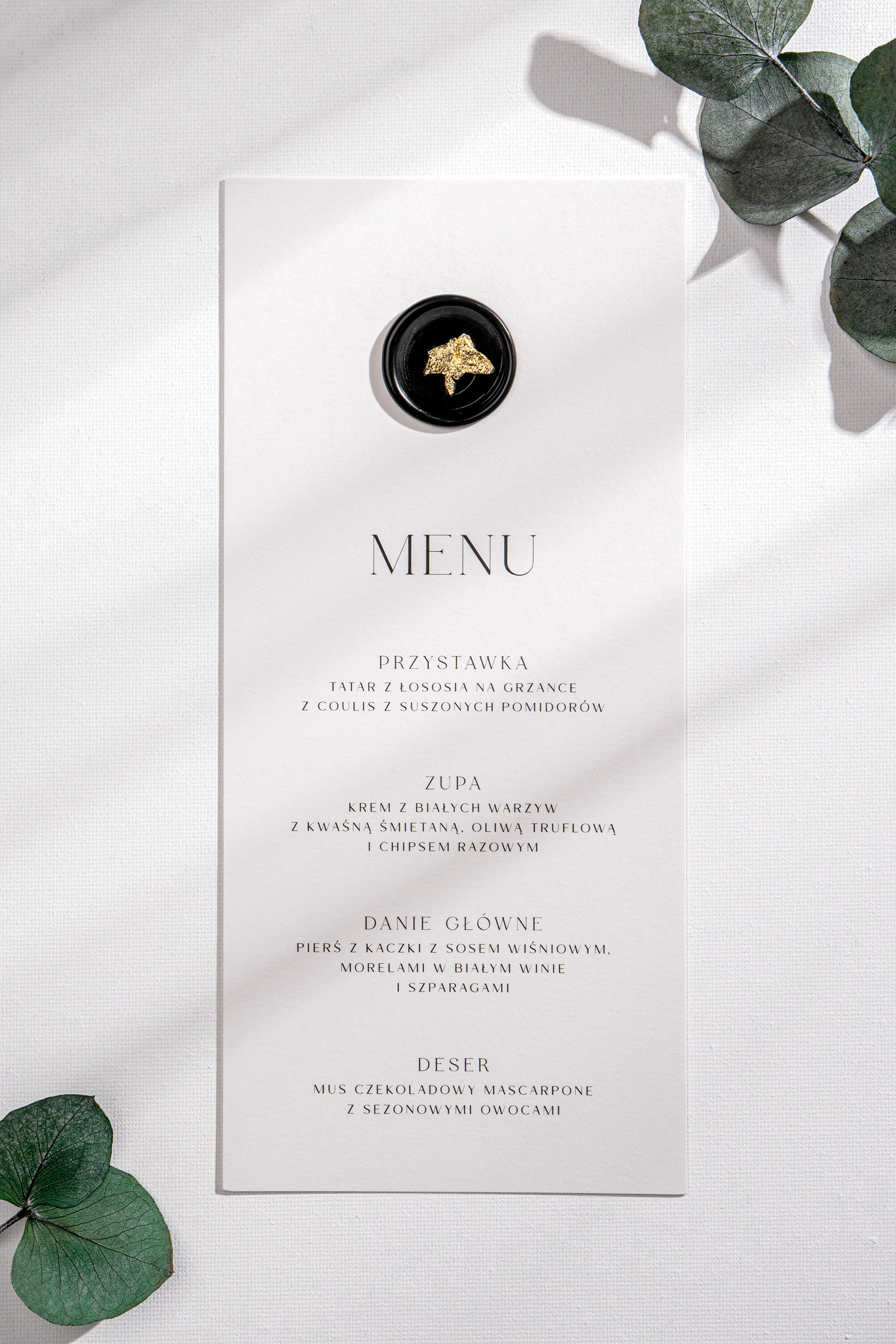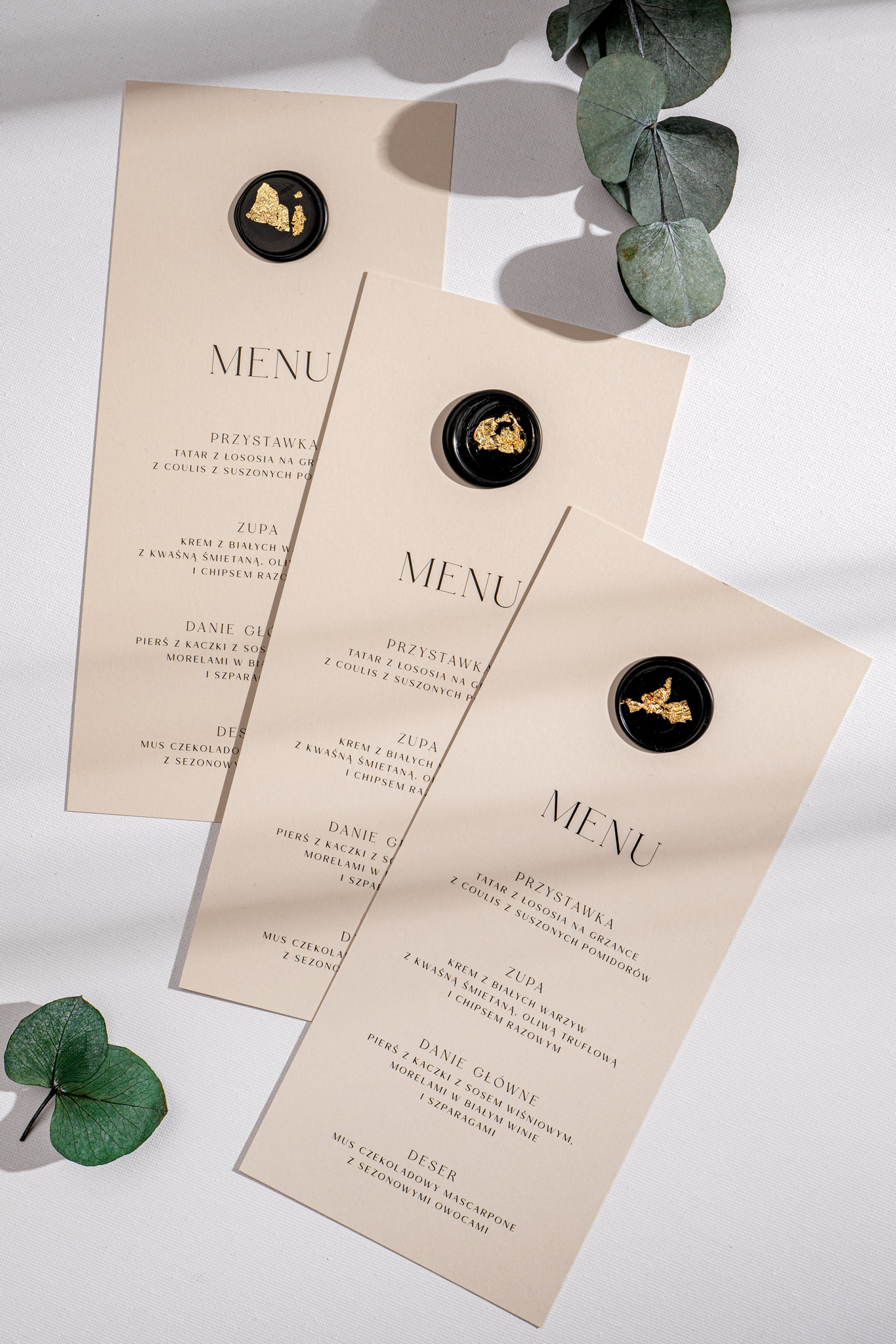 Opcjonalnie menu może zostać ozdobione czarnym stemplem lakowym ze złoceniem – detalem, który nadaje całości wyrafinowanego charakteru.