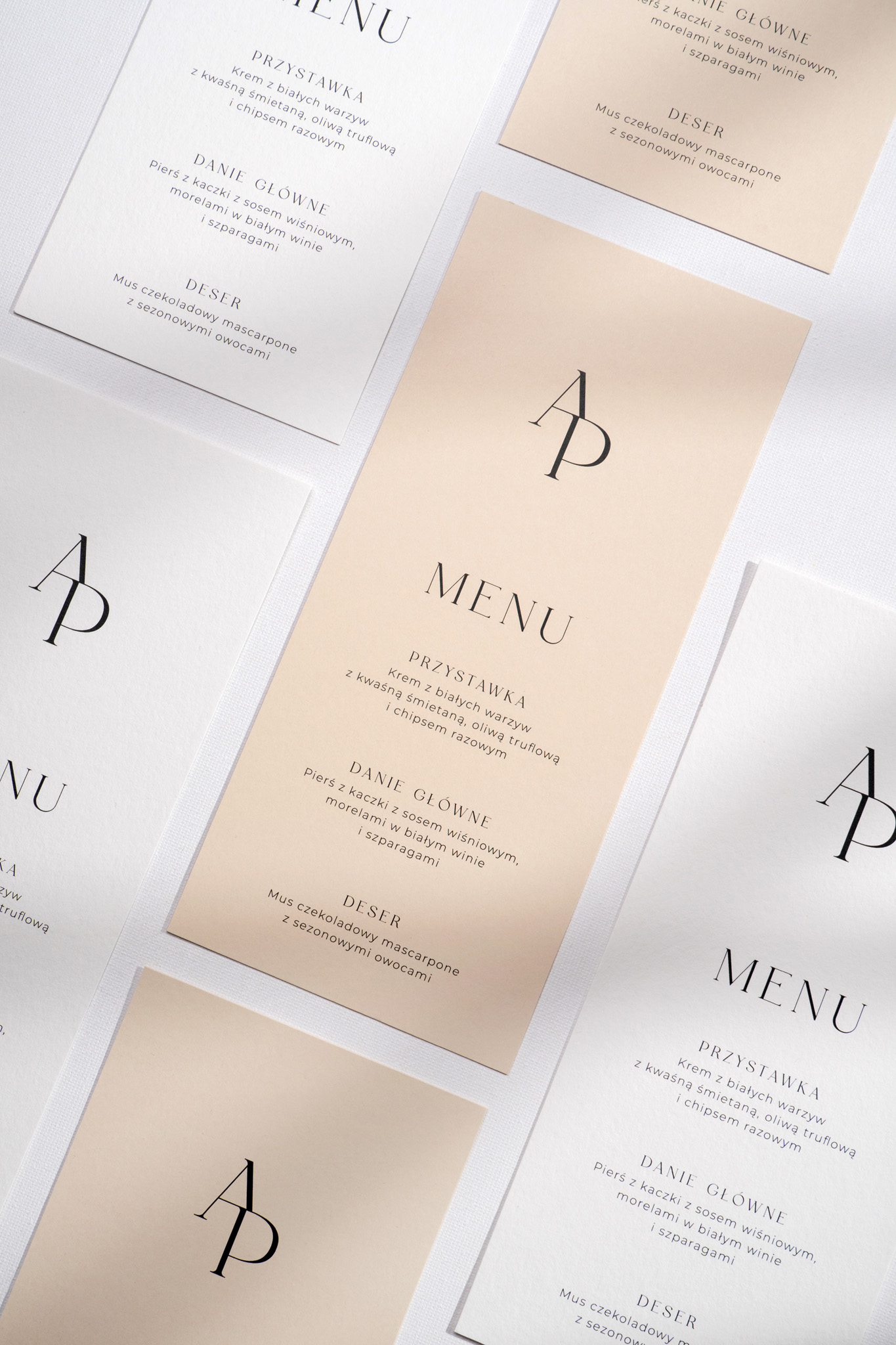 Subtelne zdobienie w postaci monogramu Pary Młodej nadaje karcie (jak i całej uroczystości) indywidualny charakter, podkreślając wyjątkowość tego dnia. Prosty, minimalistyczny design idealnie komponuje się z resztą kolekcji, tworząc harmonijną i stylową aranżację stołu.