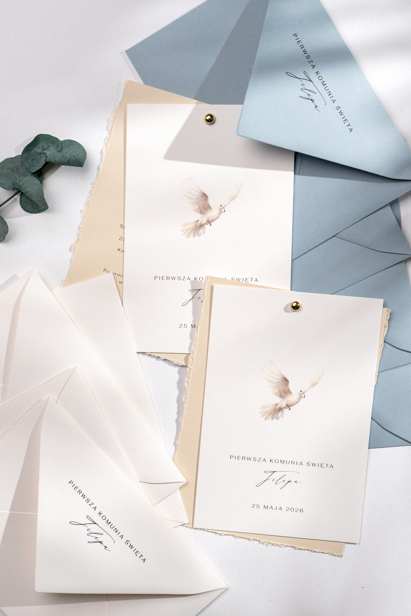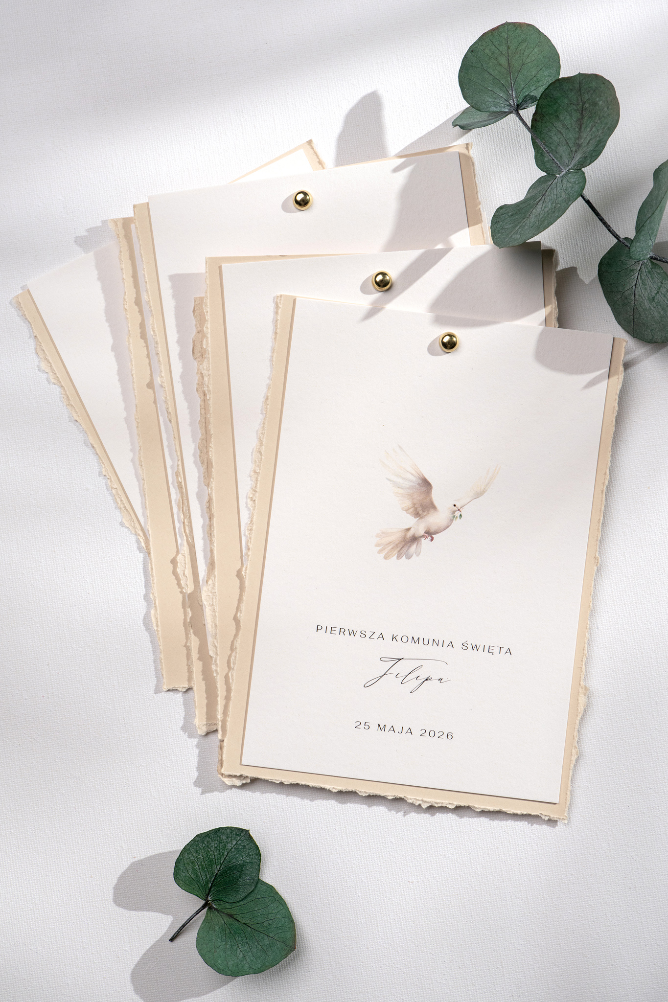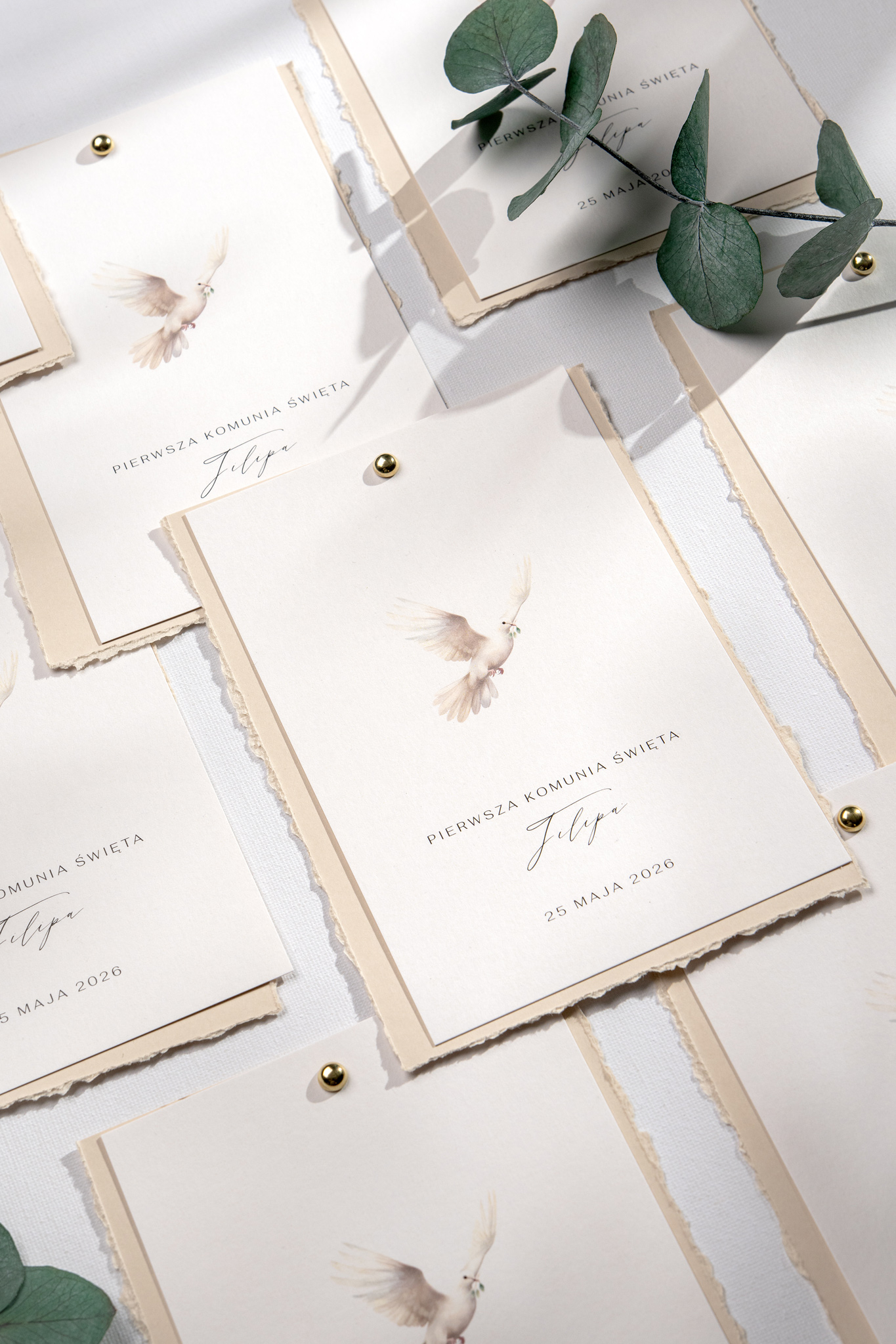 Komplet tworzą dwie karty, połączone ozdobnym, złotym nitem. Pierwsza z nich wykonana jest z bawełnianego papieru w odcieniu złamanej bieli i ozdobiona delikatnym, akwarelowym motywem gołąbka – subtelnym symbolem Ducha Świętego. Druga karta, w ciepłym odcieniu beżu, może zostać wykończona ręcznie rwanymi brzegami, które dodają projektowi naturalności i wyjątkowego charakteru.