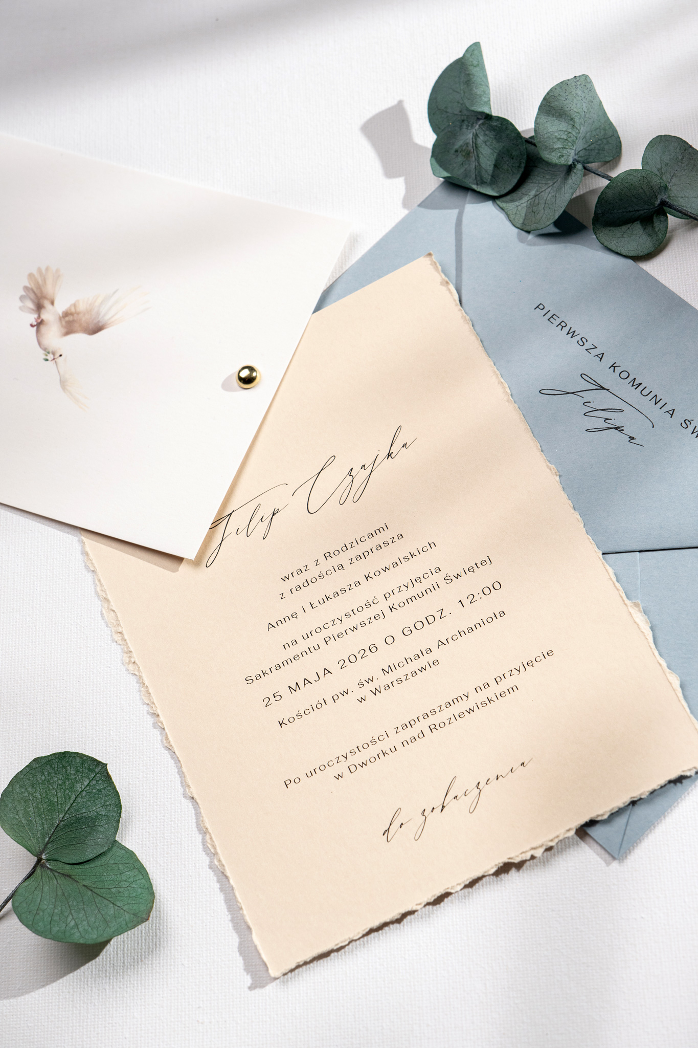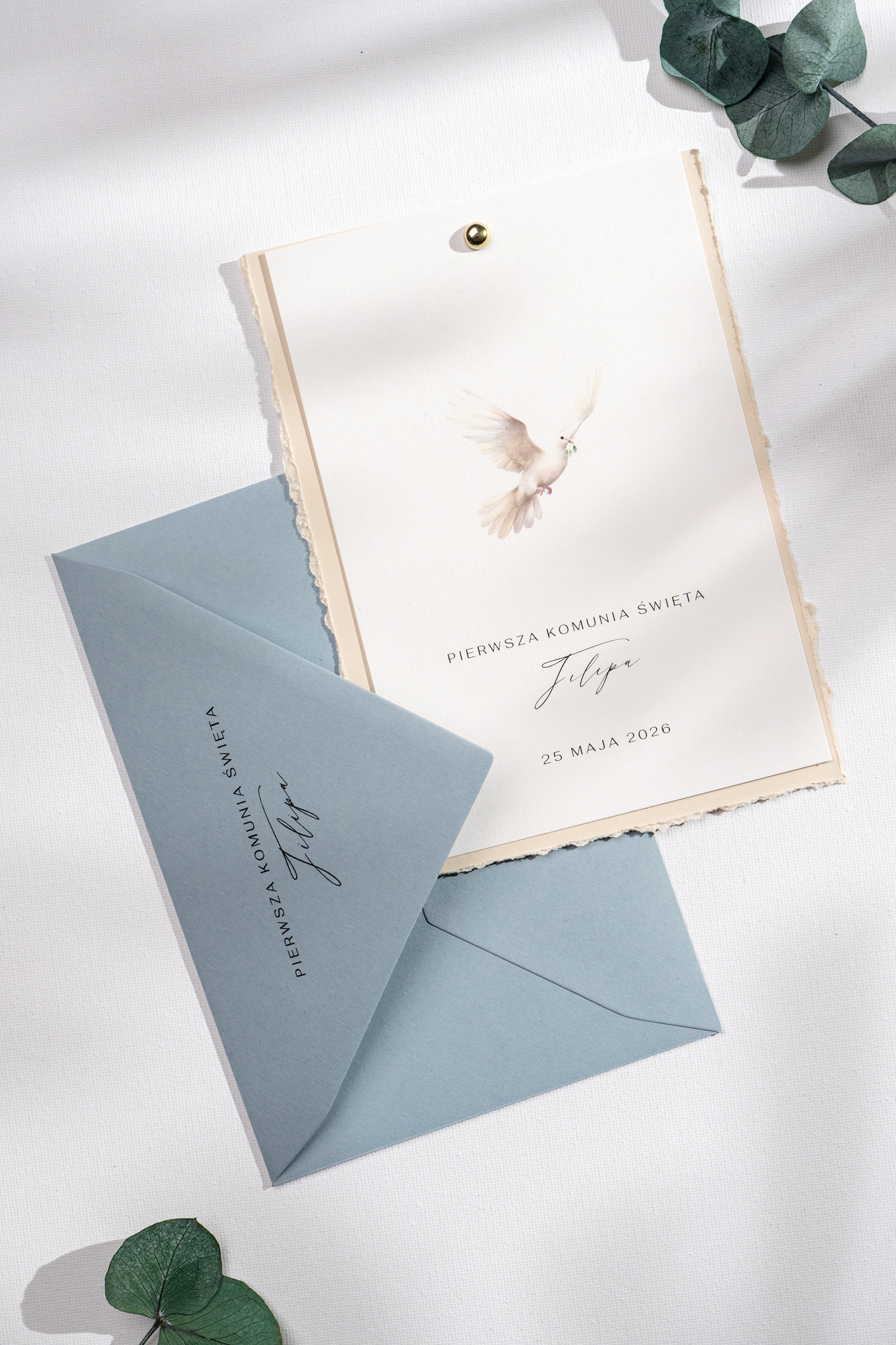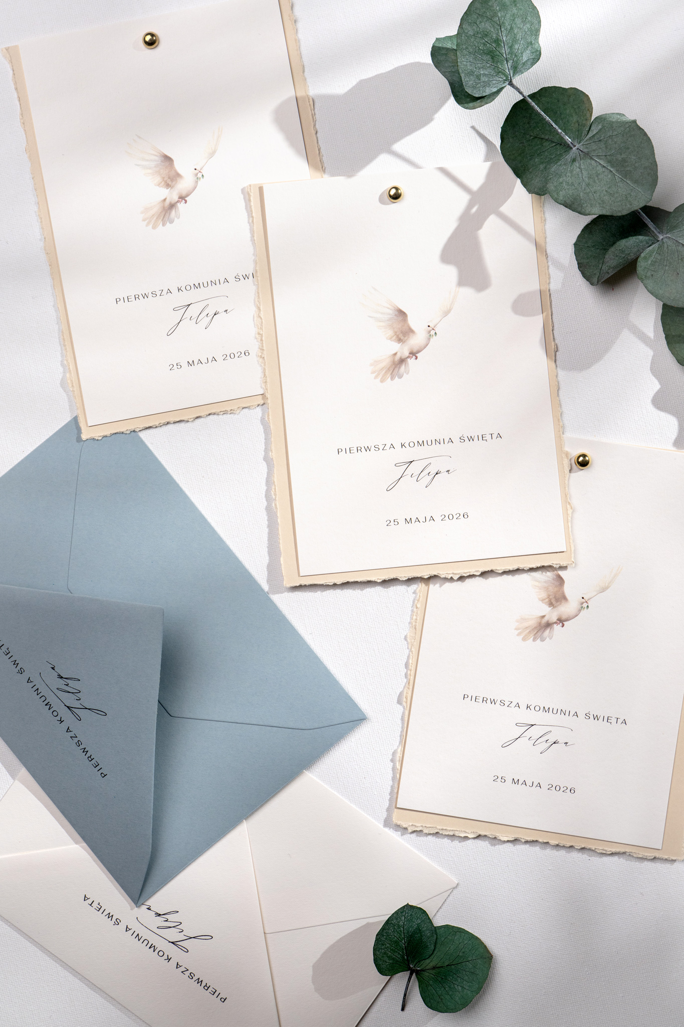 Komplet tworzą dwie karty, połączone ozdobnym, złotym nitem. Pierwsza z nich wykonana jest z bawełnianego papieru w odcieniu złamanej bieli i ozdobiona delikatnym, akwarelowym motywem gołąbka – subtelnym symbolem Ducha Świętego. Druga karta, w ciepłym odcieniu beżu, może zostać wykończona ręcznie rwanymi brzegami, które dodają projektowi naturalności i wyjątkowego charakteru.