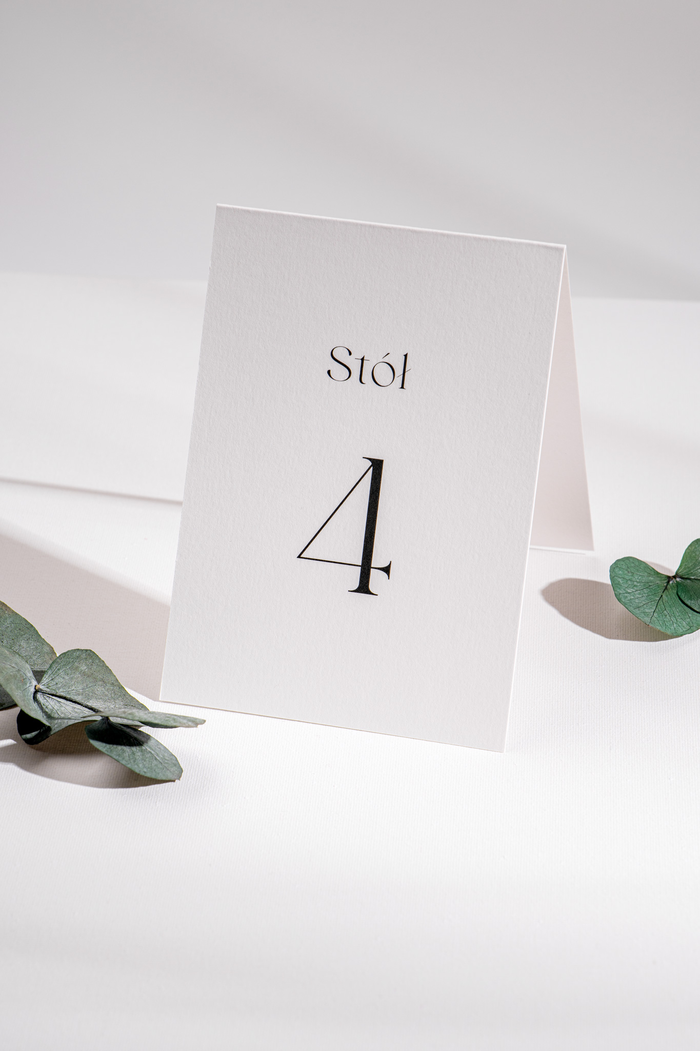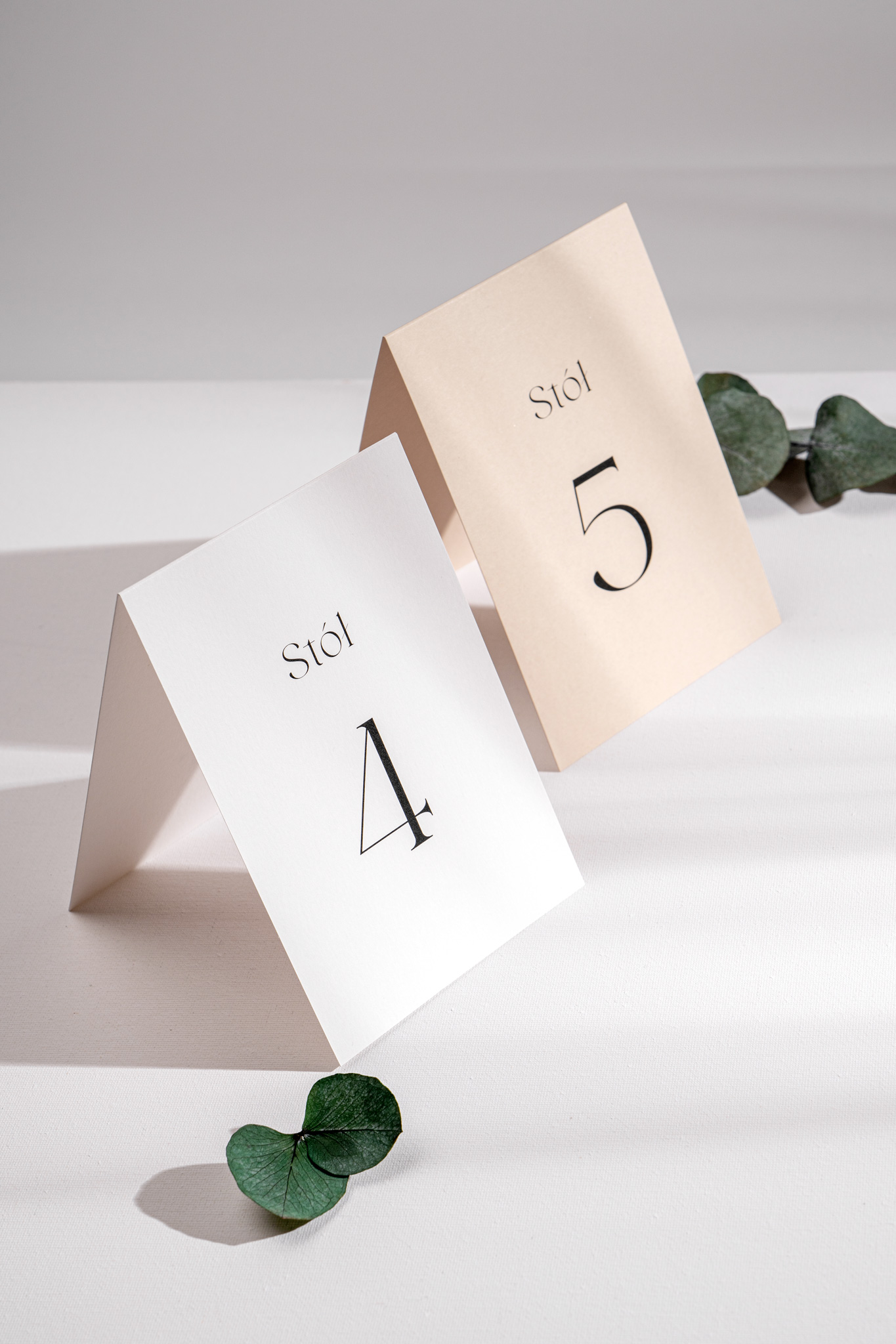Wykonane z papieru w kolorze śmietankowej bieli lub ciepłego beżu, nie wymagają dodatkowych stojaków – można je po prostu postawić na stole. Minimalistyczna forma i spójna typografia sprawiają, że doskonale komponują się z pozostałymi elementami kolekcji.