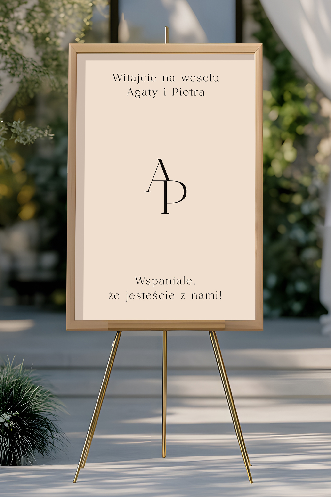 Na górze plakatu pięknie prezentuje się monogram Pary Młodej, który dodaje całości osobistego, a zarazem eleganckiego charakteru.