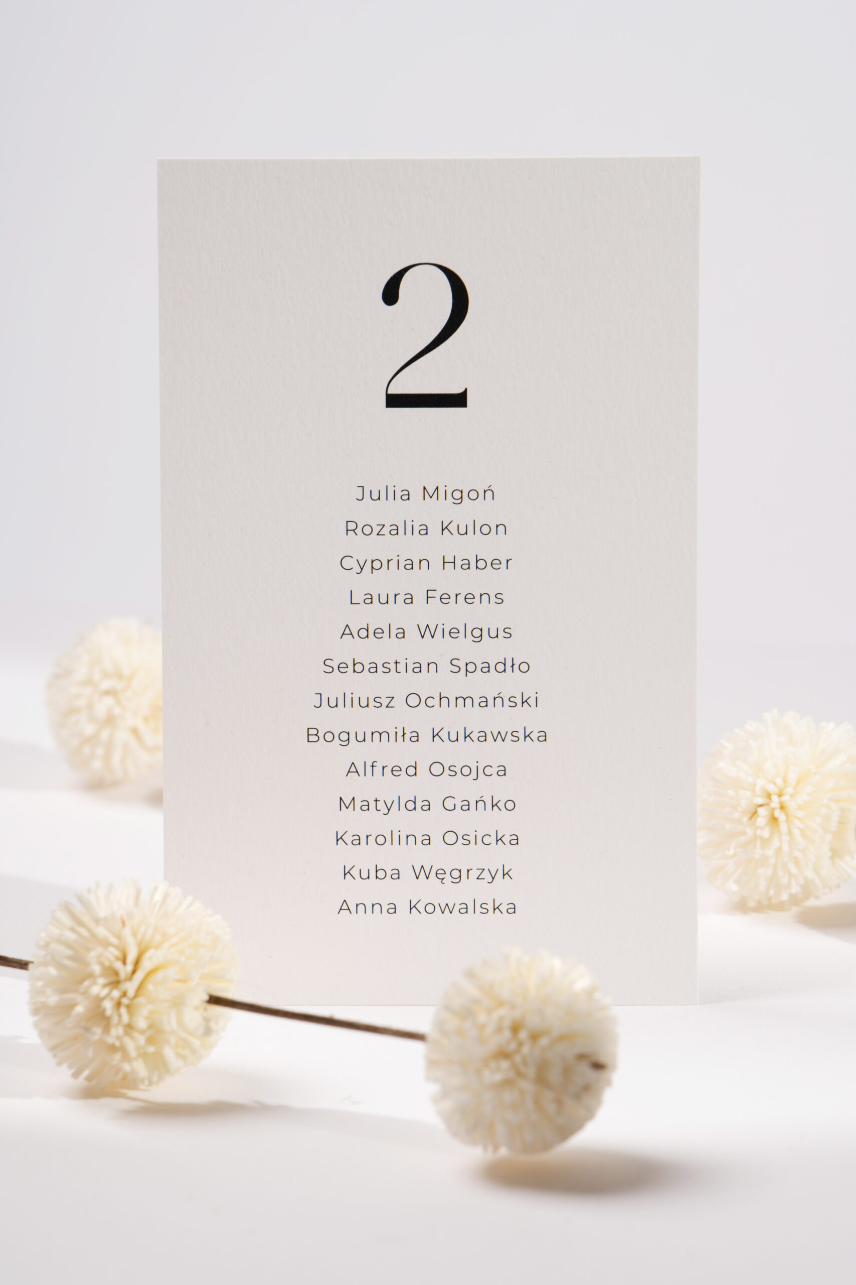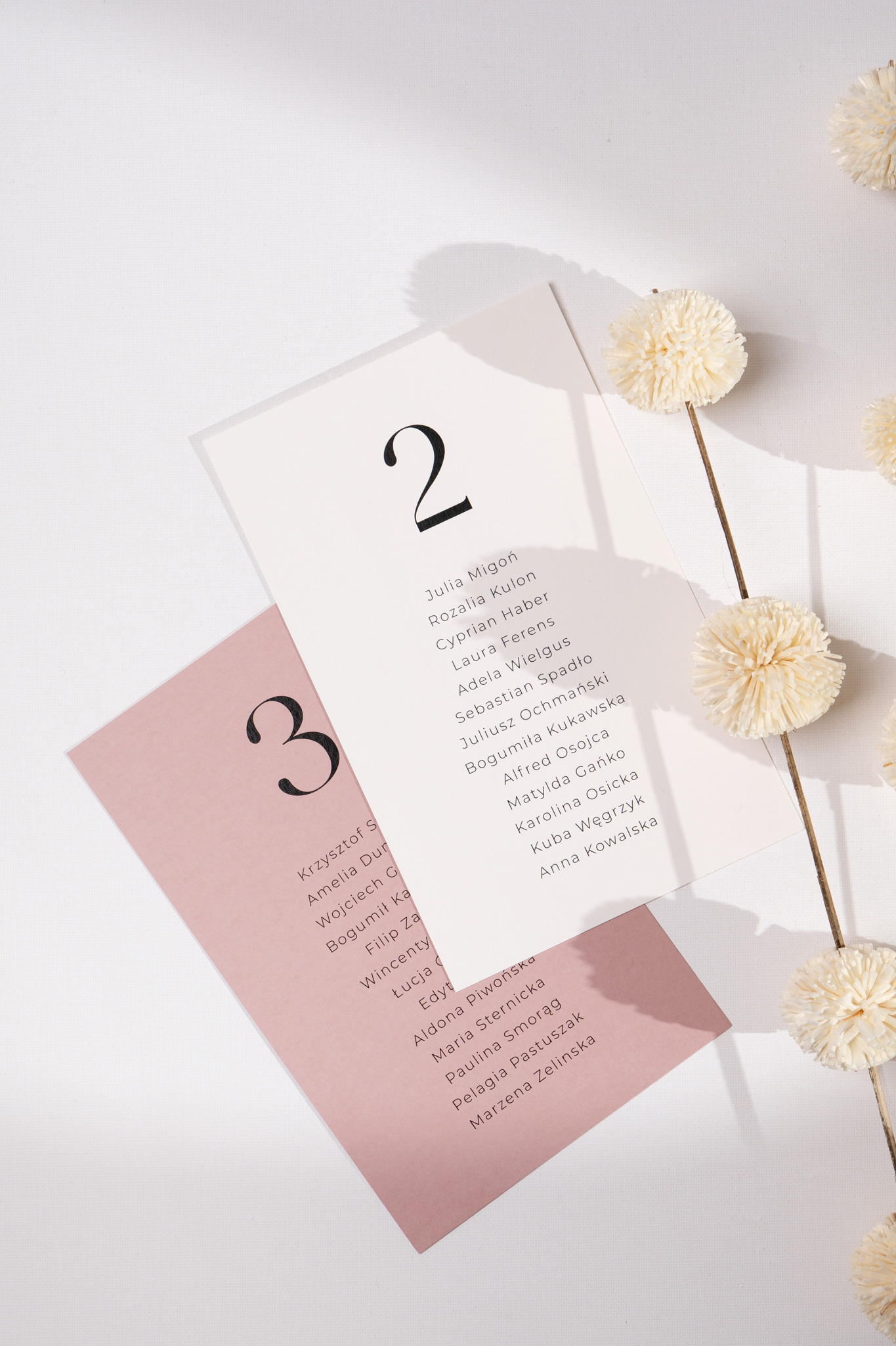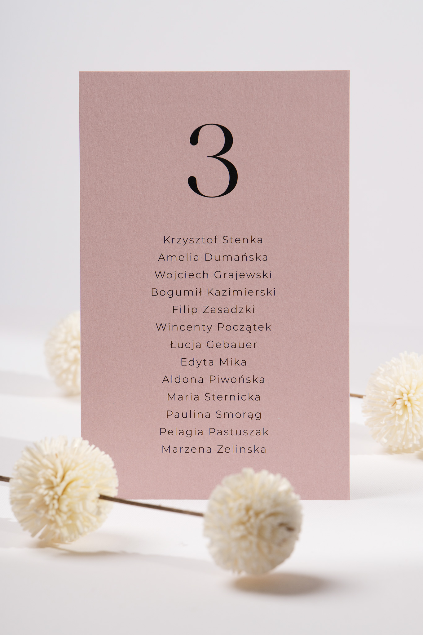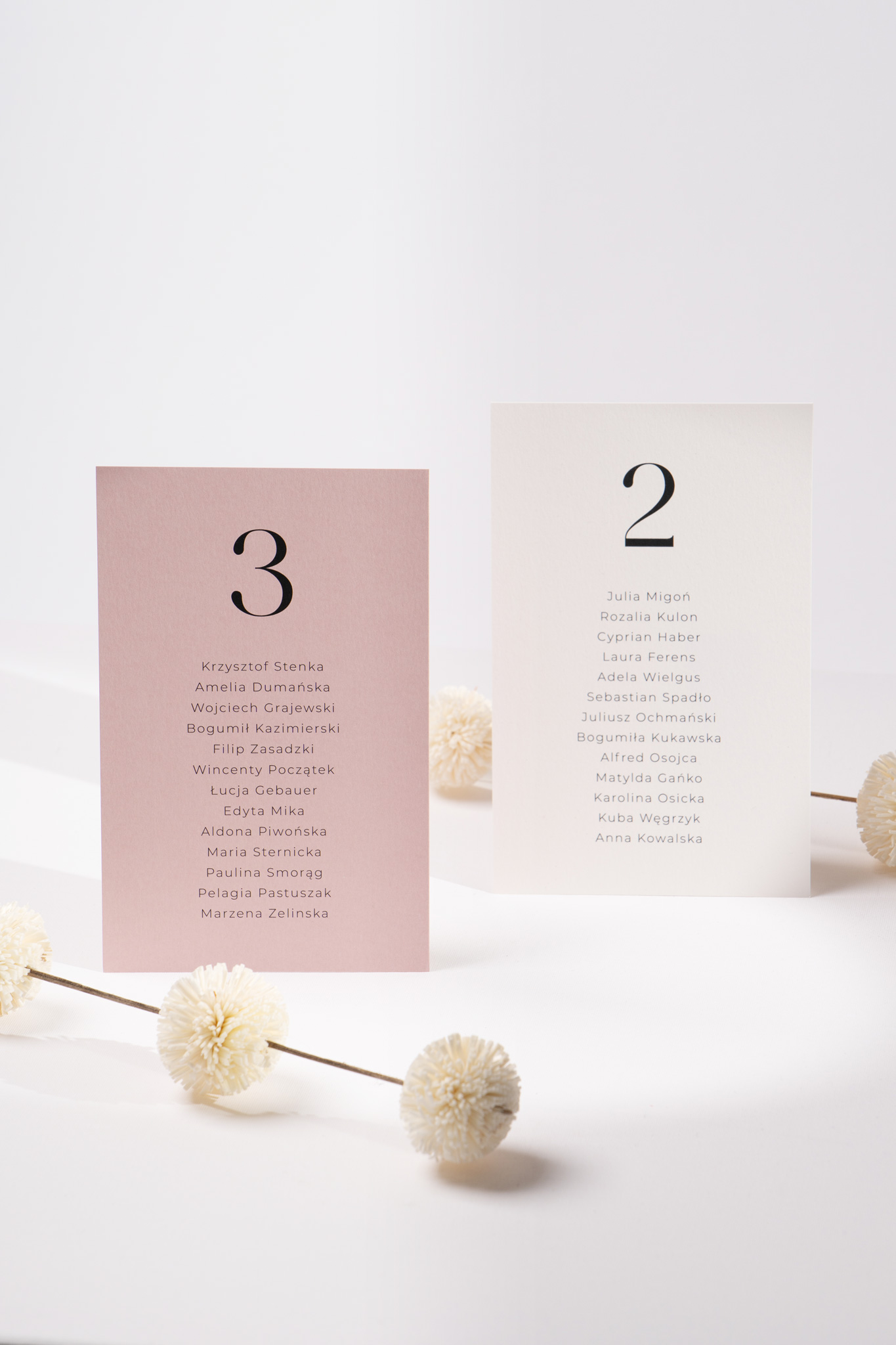 Karty wykonane są na papierze w kolorze złamanej bieli lub brudnego różu, z zaokrąglonymi rogami i typografią spójną z całą kolekcją. Dzięki osobnym kartom z nazwiskami gości zyskujesz pełną swobodę ich rozmieszczenia i dopasowania do układu sali. Istnieje także możliwość przygotowania karty tytułowej z nagłówkiem – w tej samej, eleganckiej estetyce.