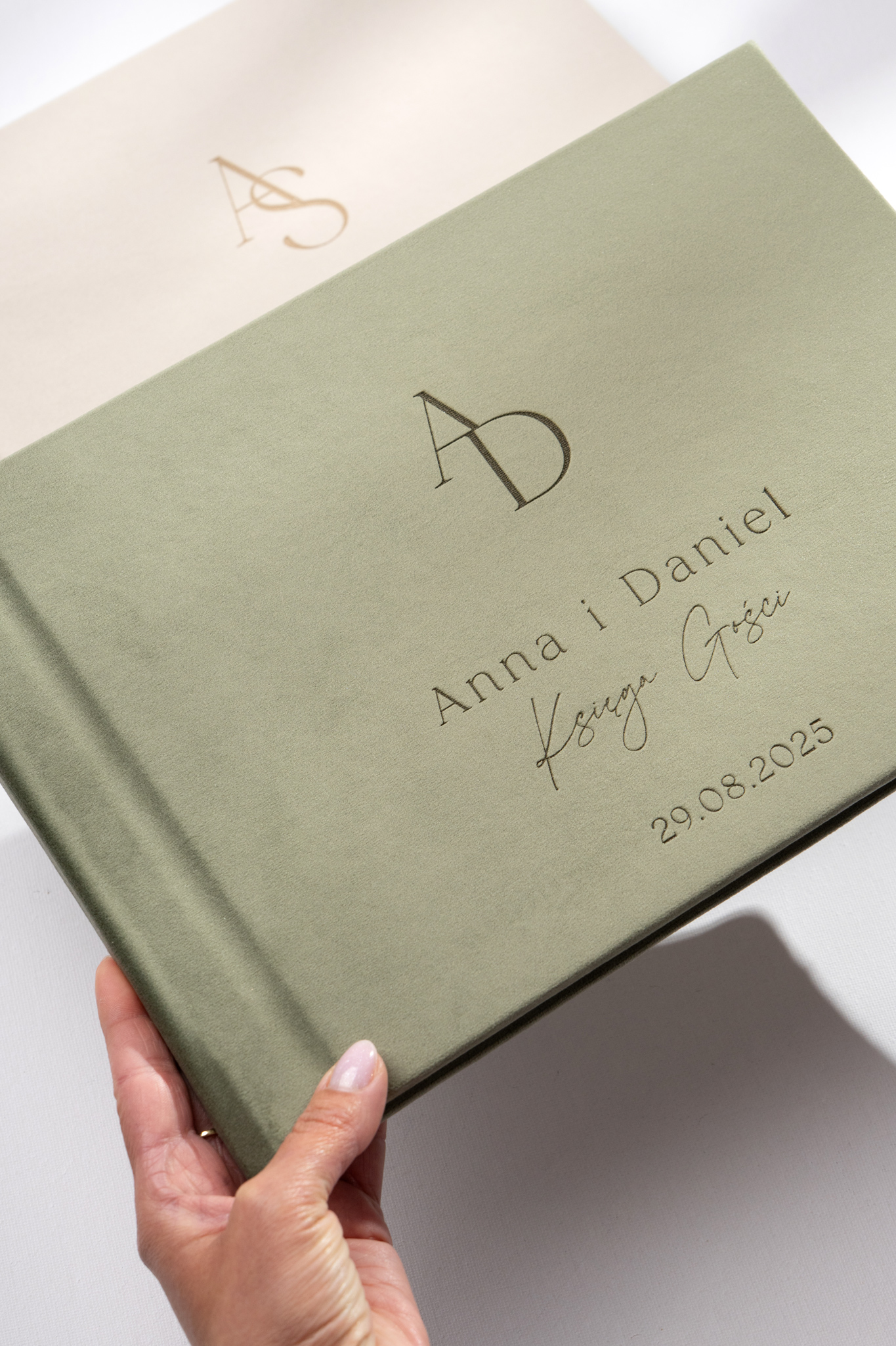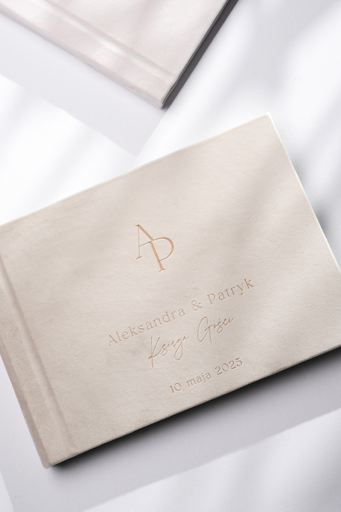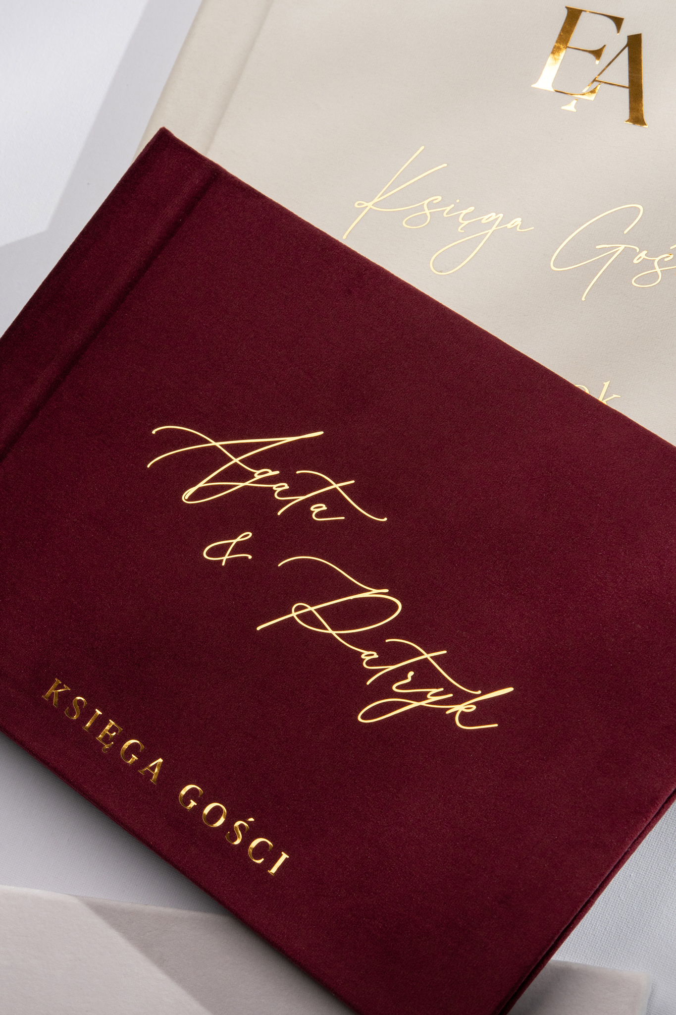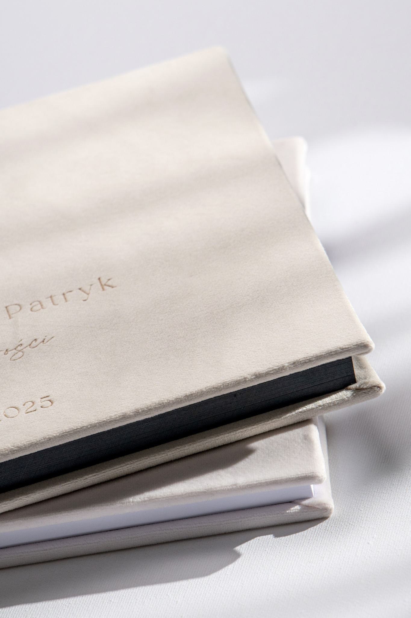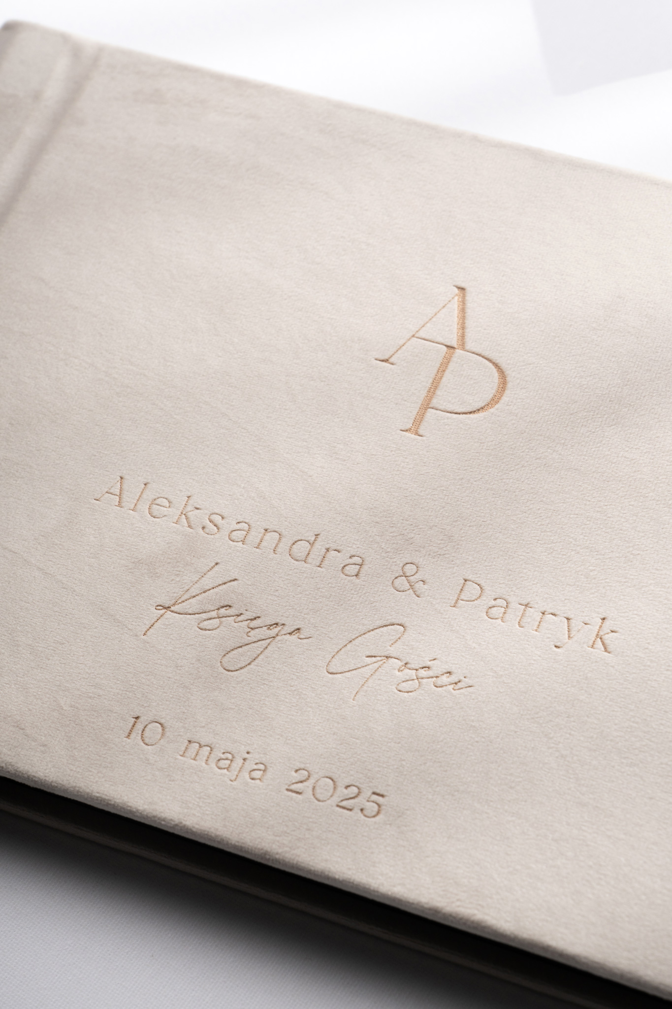 Grawerunek zawsze wyjdzie w tym kolorze co welur, ale ciemniejszym. W przypadku bardzo ciemnych kolorów może być mniej widoczny, co warto mieć na uwadze przy wyborze tkaniny. Opcja złocenia świetnie sprawdzi się zwłaszcza na ciemnych odcieniach okładek, dodając księdze wyjątkowego blasku i elegancji.