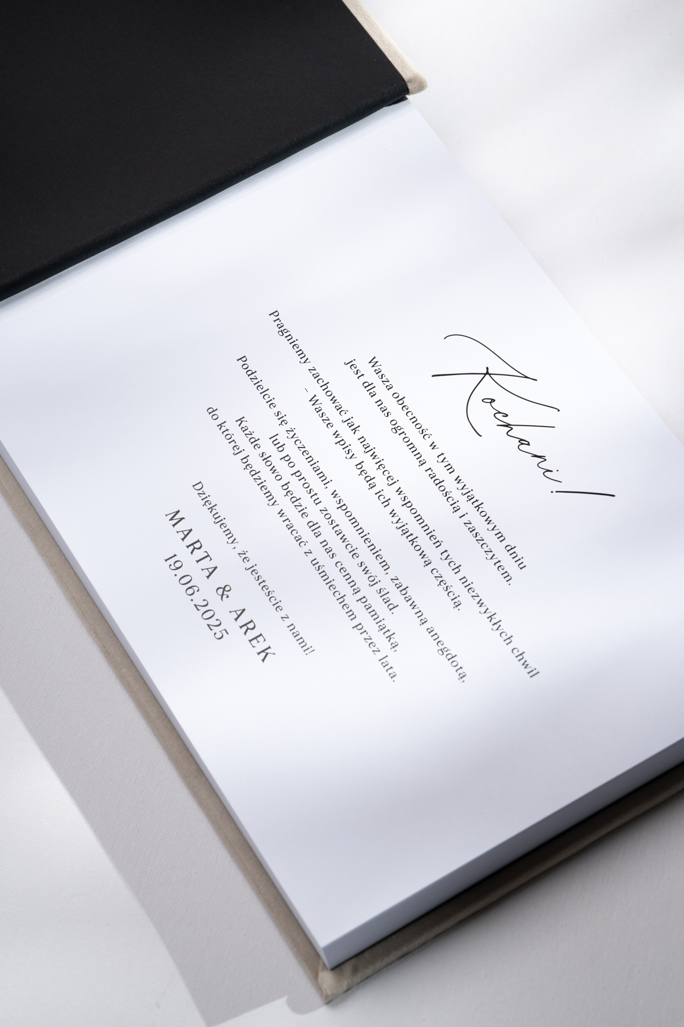 Dzięki szytym kartom i wielokrotnemu bigowaniu, księga doskonale się rozkłada, co ułatwia jej wygodne użytkowanie podczas wpisywania życzeń przez gości.