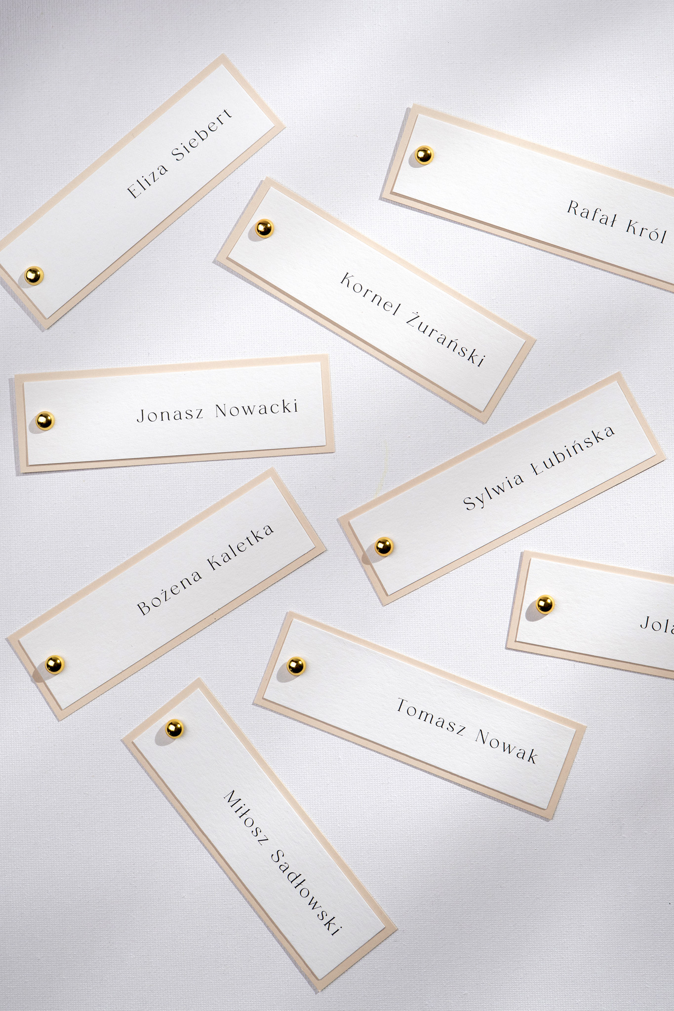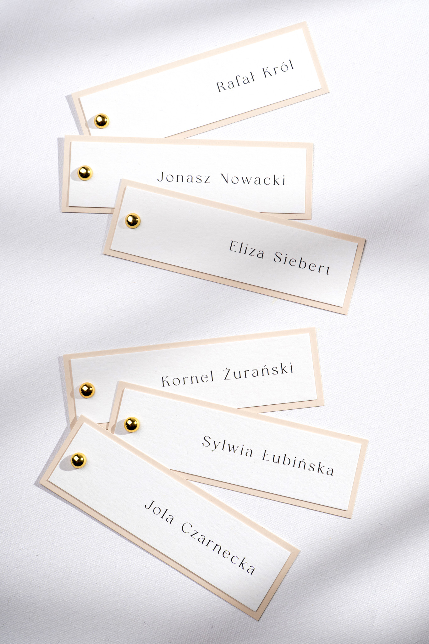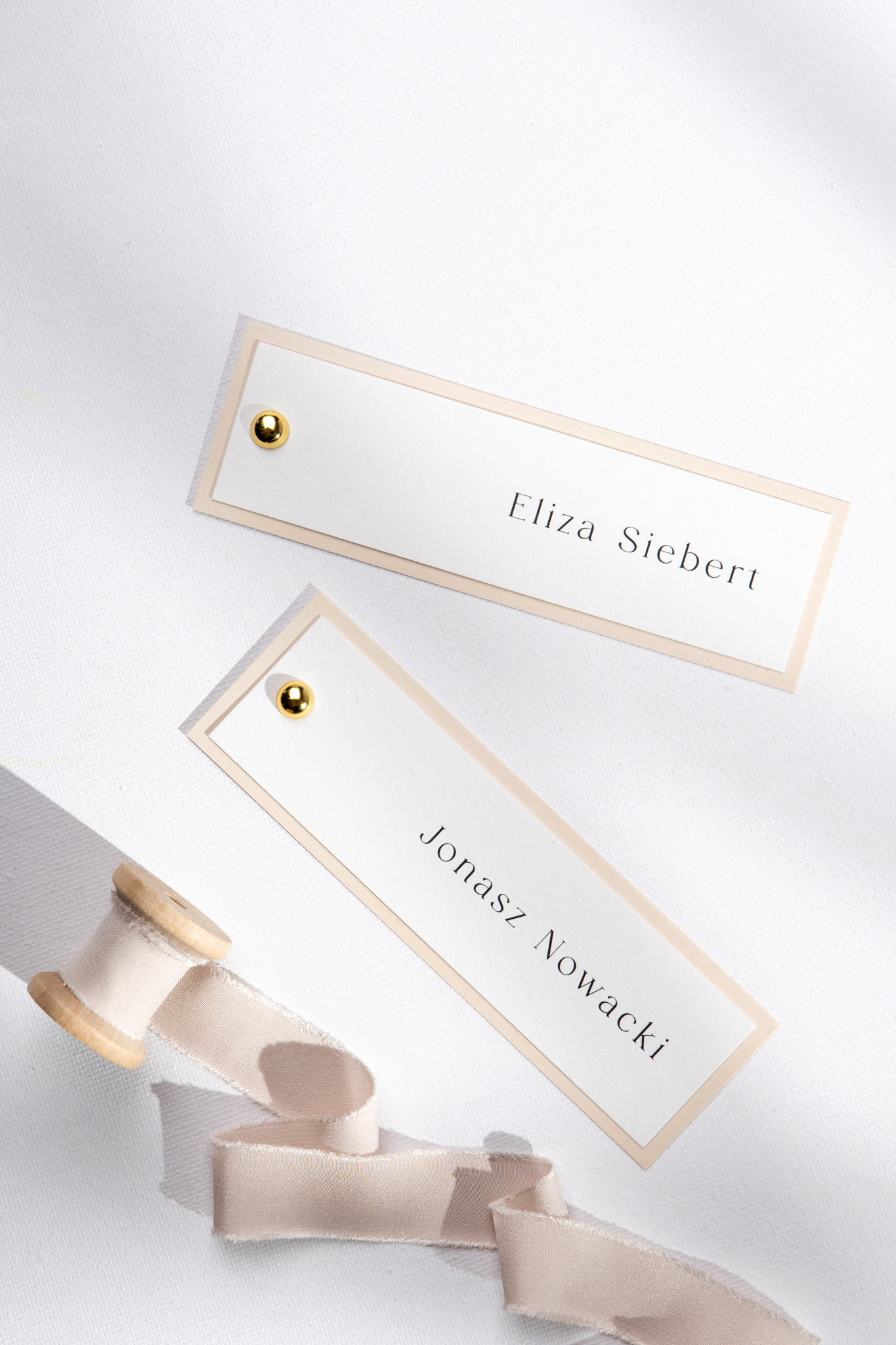 Winietki kładzione Lovely Letters to elegancki i praktyczny dodatek na ślubny stół, który łączy funkcjonalność z wyjątkowym stylem. Wykonane z dwóch papierów — spodnia warstwa w ciepłym beżowym odcieniu, wierzchnia w delikatnej śmietankowej bieli — połączone ozdobnym, złotym nitem w formie kuleczki.