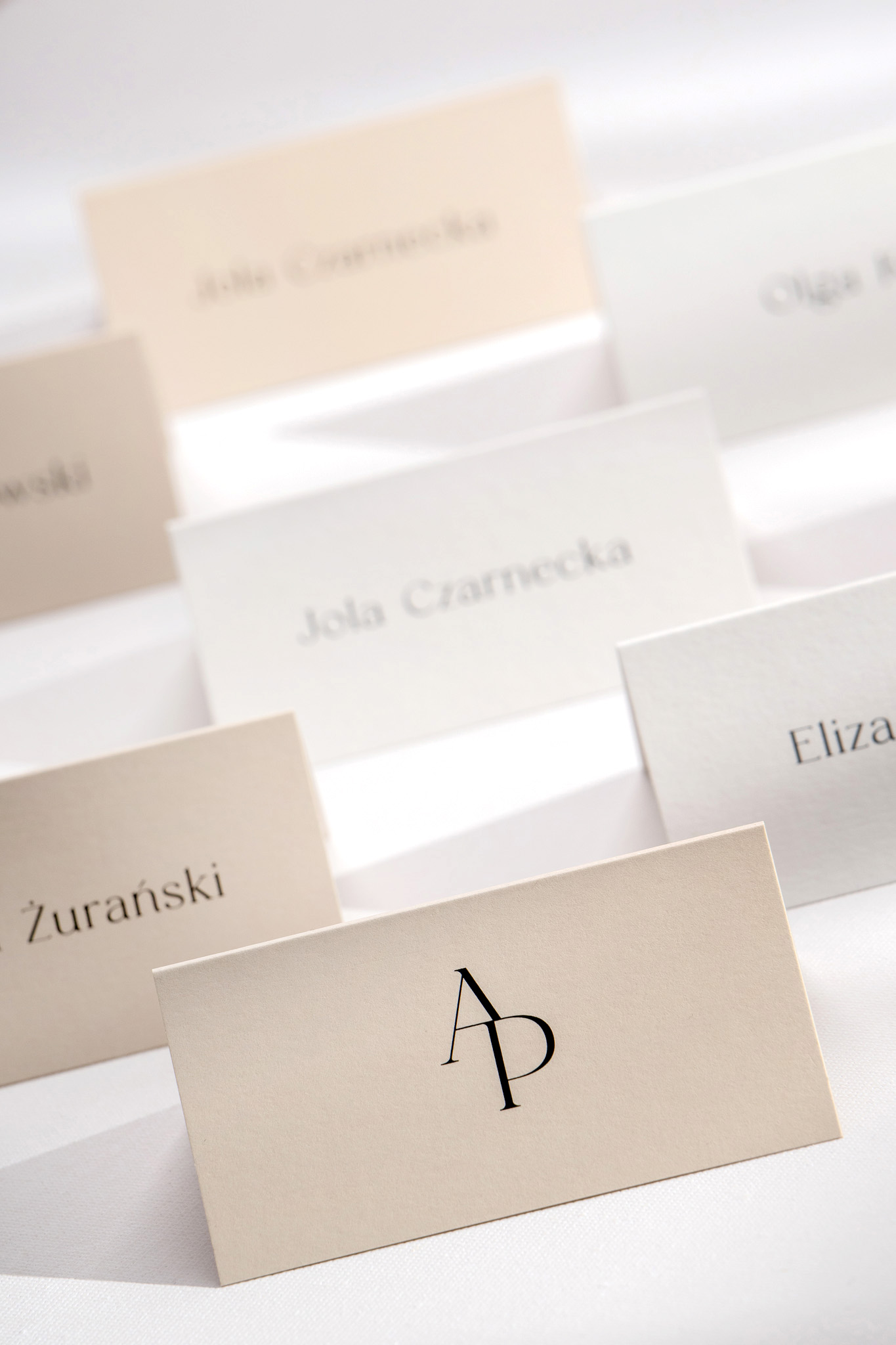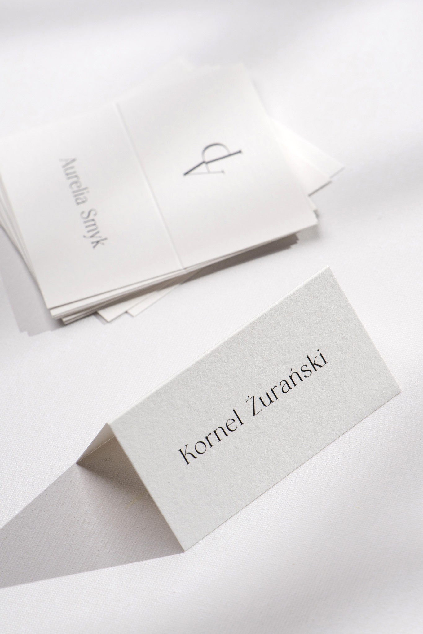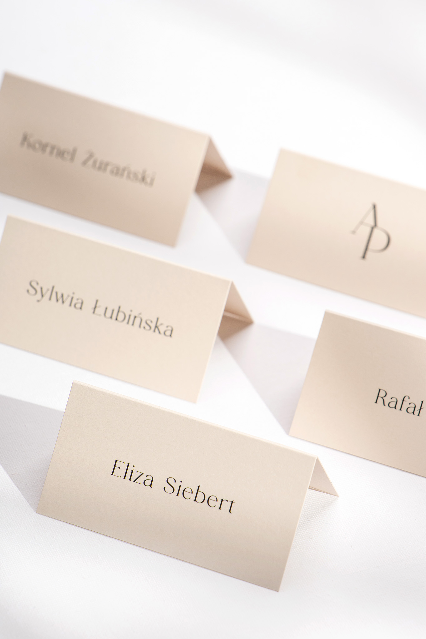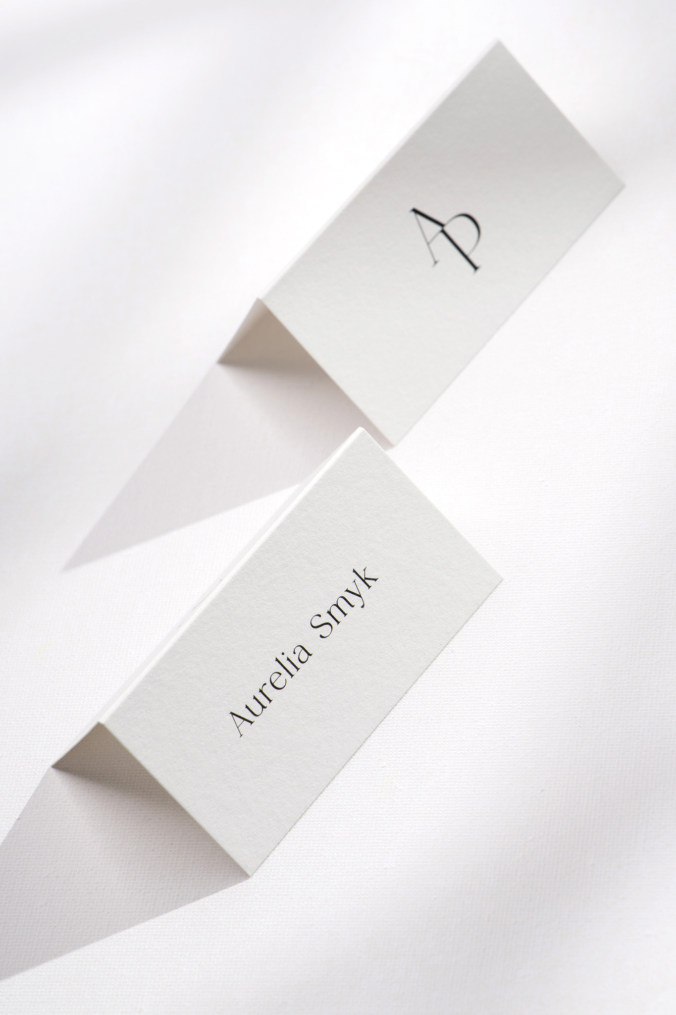 Wizytówki w składanej formie, wykonane z wysokiej jakości papieru w odcieniu śmietankowej bieli lub beżu, z matowym wykończeniem, które dodaje im subtelnej szlachetności.