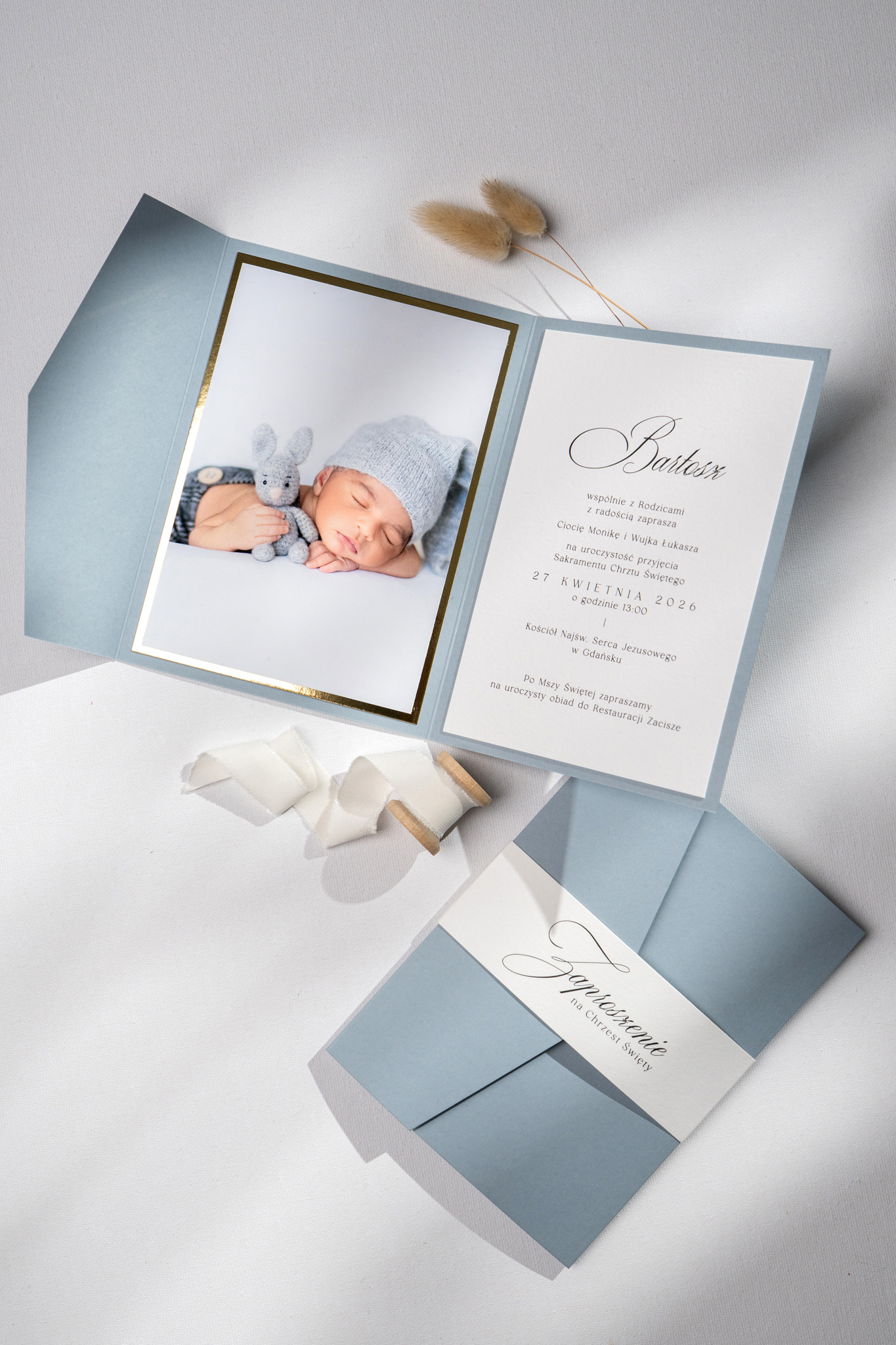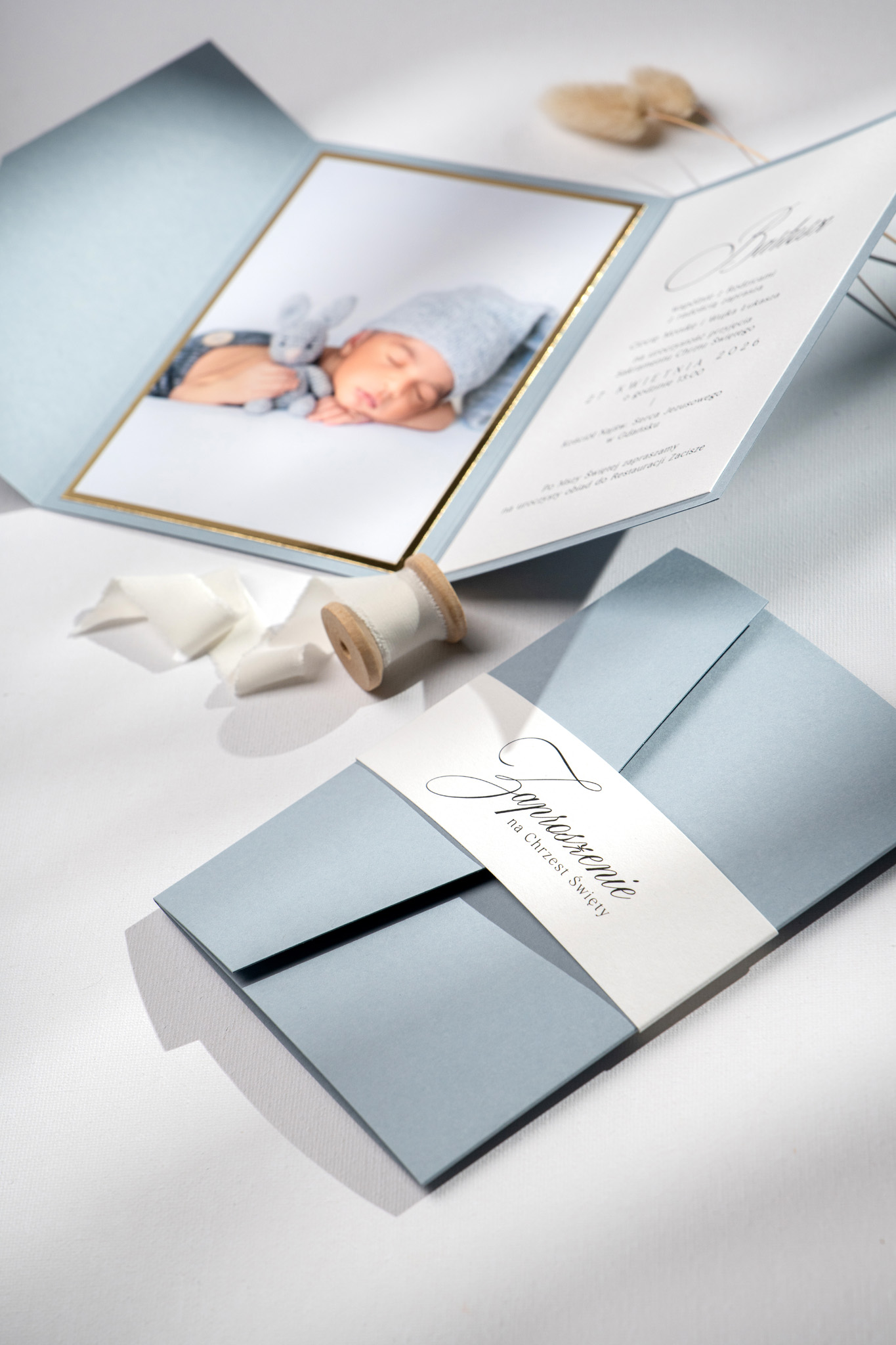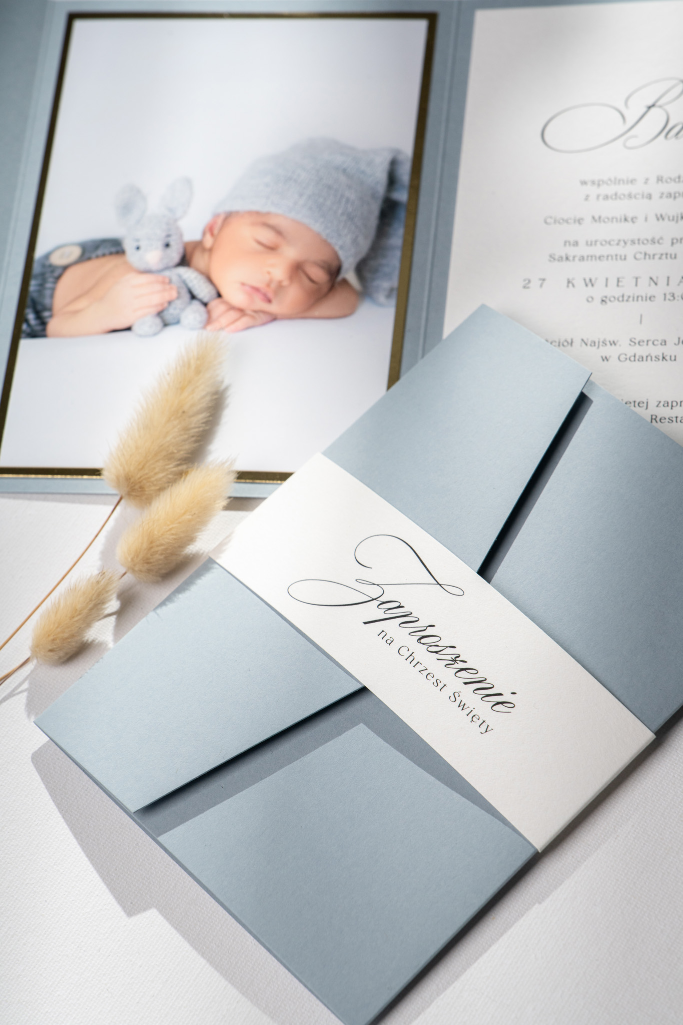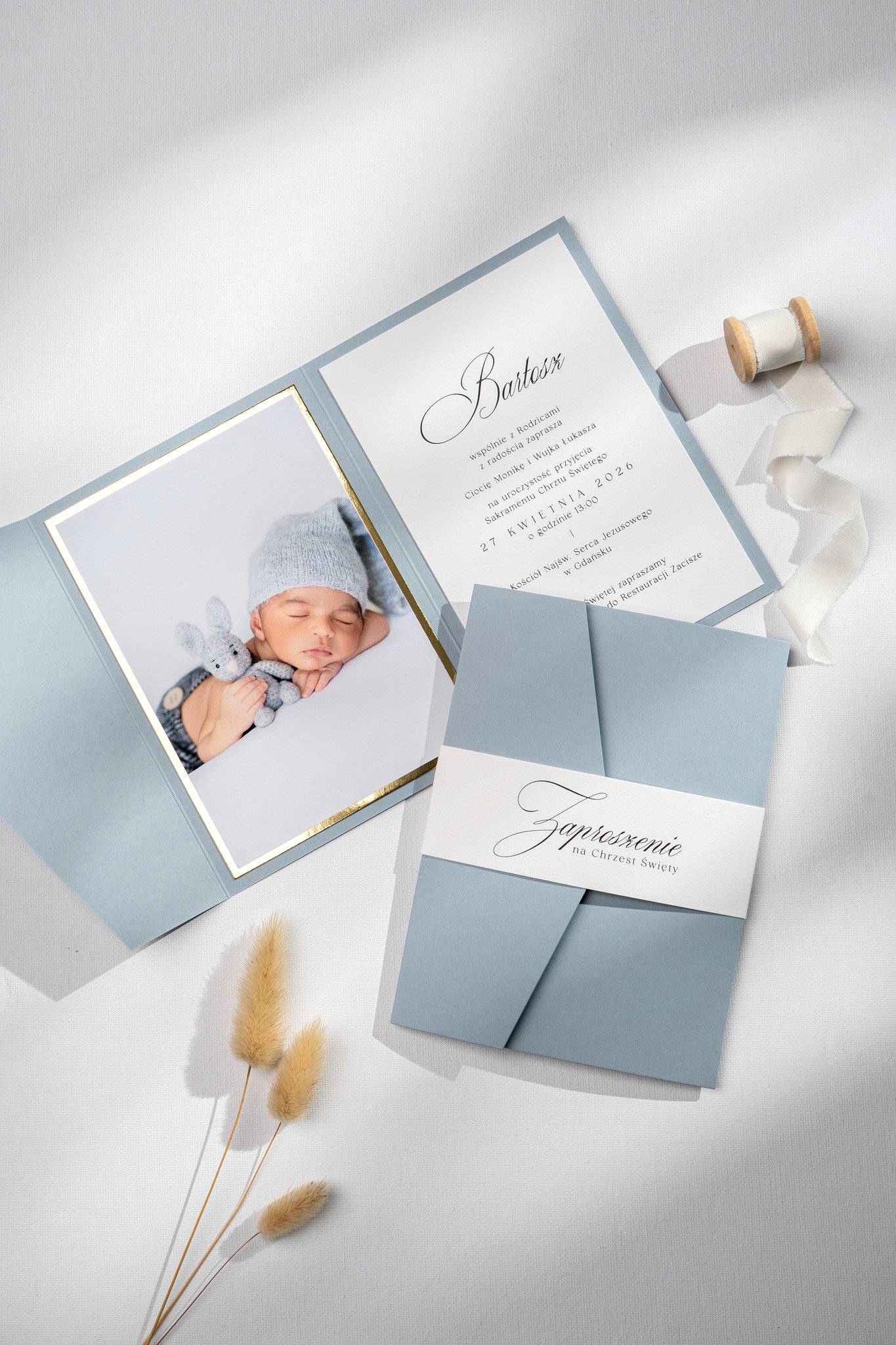 Delikatny błękit w odcieniu dusty blue sprawia, że to zaproszenie urzeka świeżością i spokojem – idealne na wyjątkowe, rodzinne uroczystości.