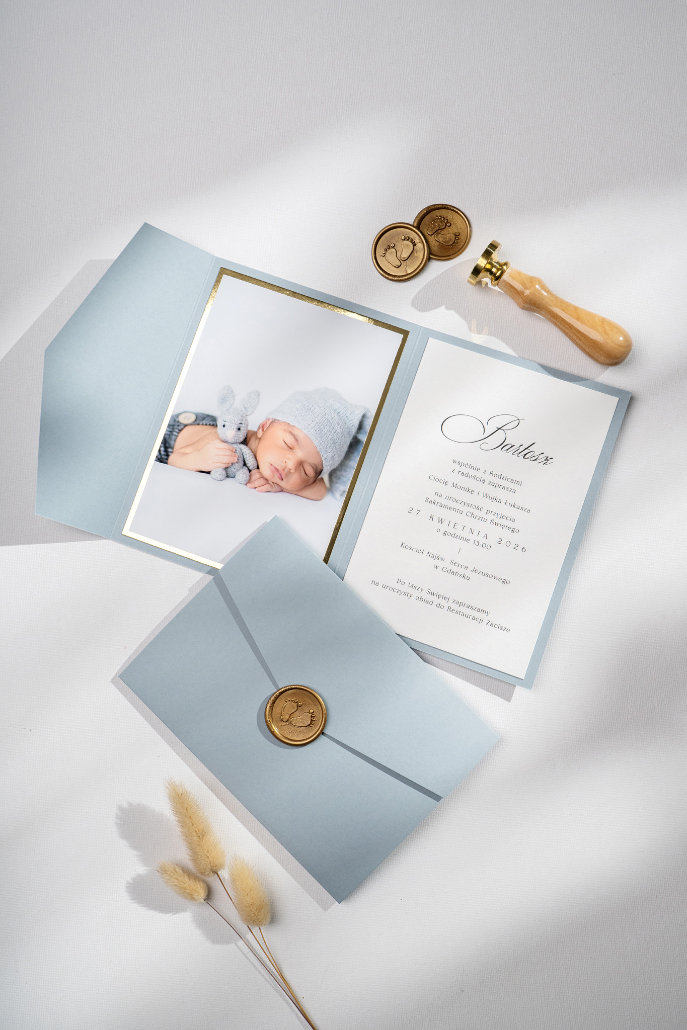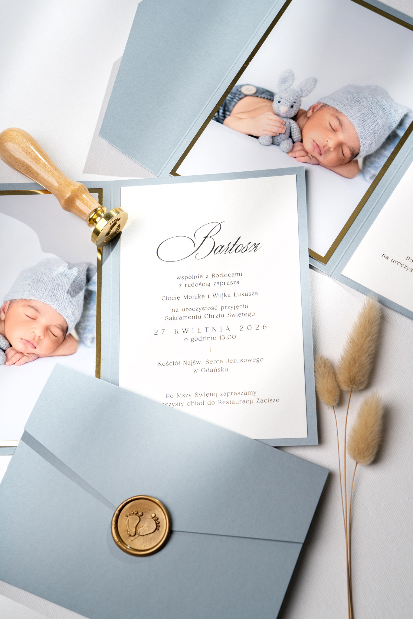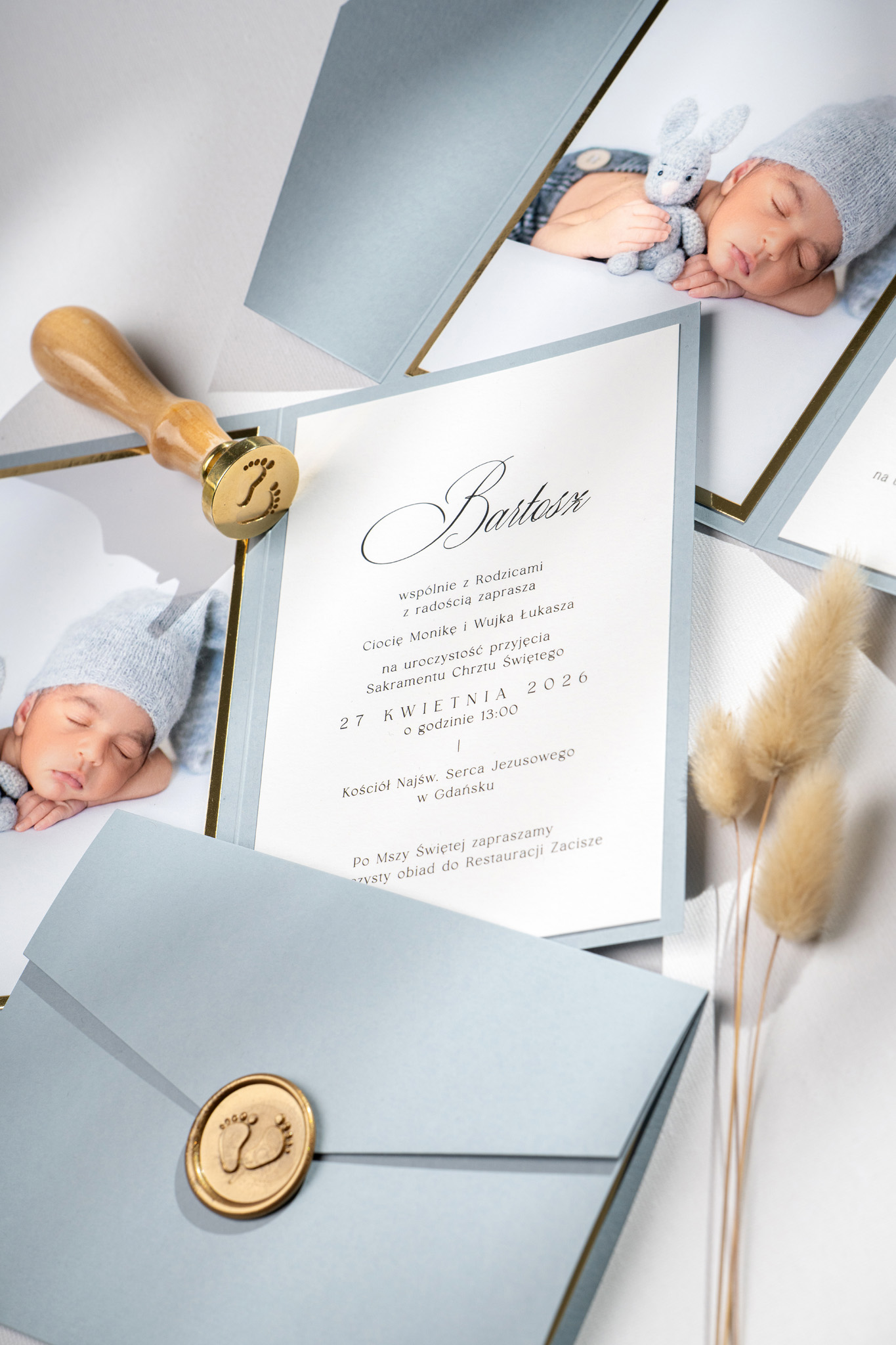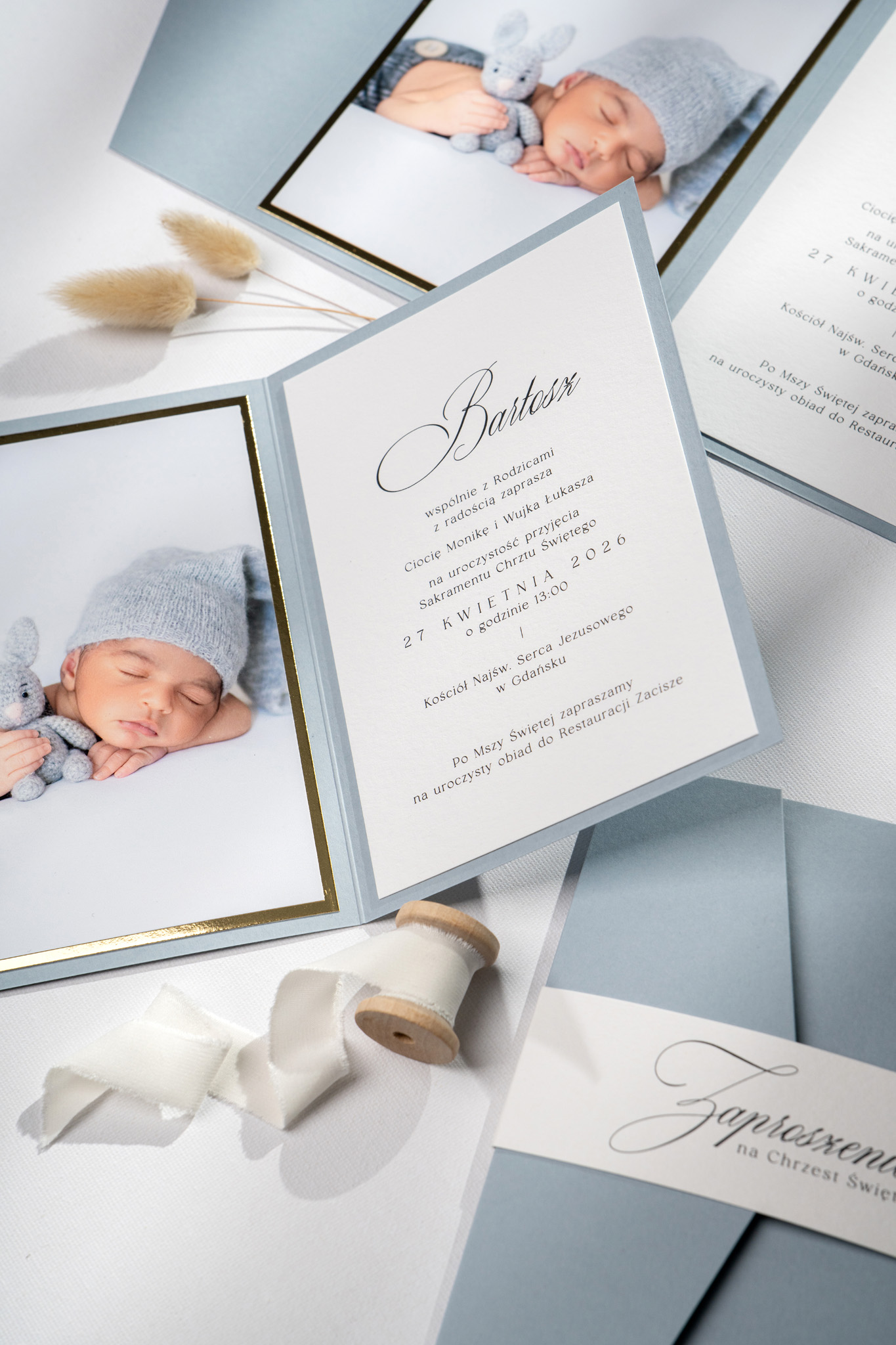 Delikatny błękit w odcieniu dusty blue sprawia, że to zaproszenie urzeka świeżością i spokojem – idealne na wyjątkowe, rodzinne uroczystości.