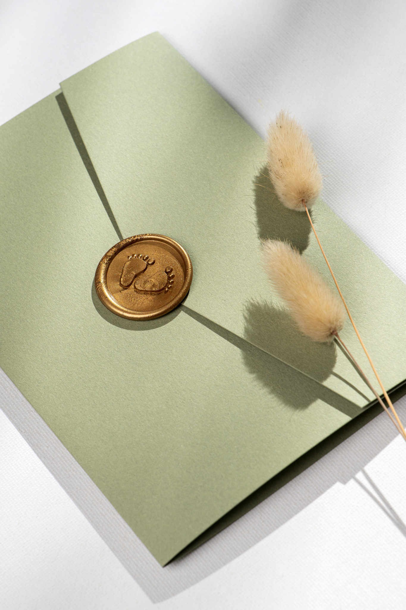 Stemple lakowe dołączamy osobno – każdy ma pod spodem dwustronnie klejące kółeczko, dzięki czemu łatwo go samodzielnie przykleić do zaproszenia.
