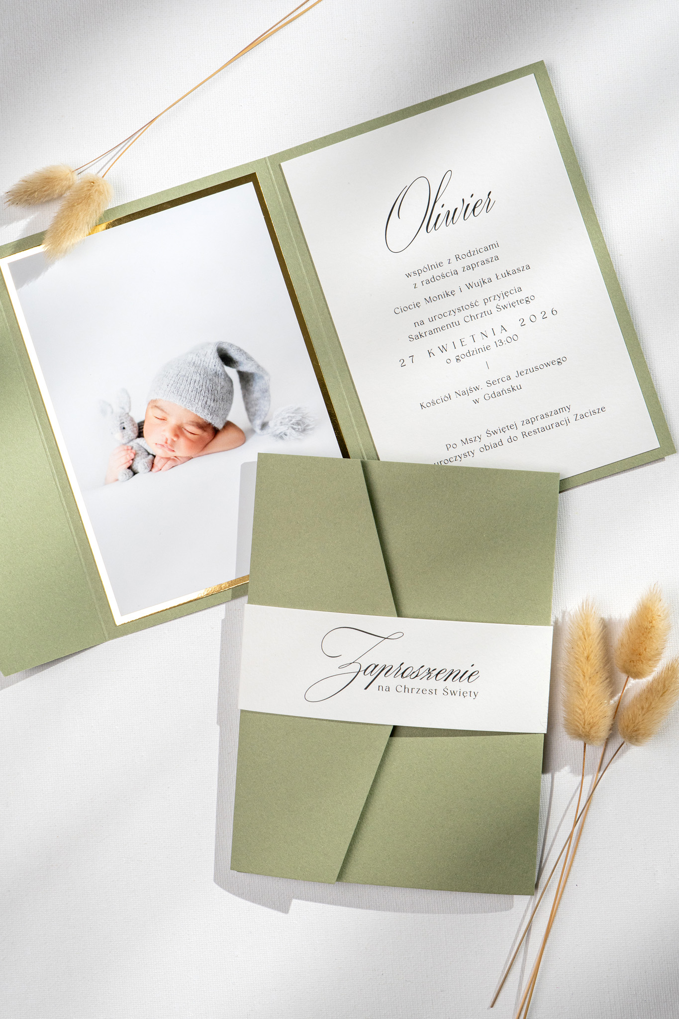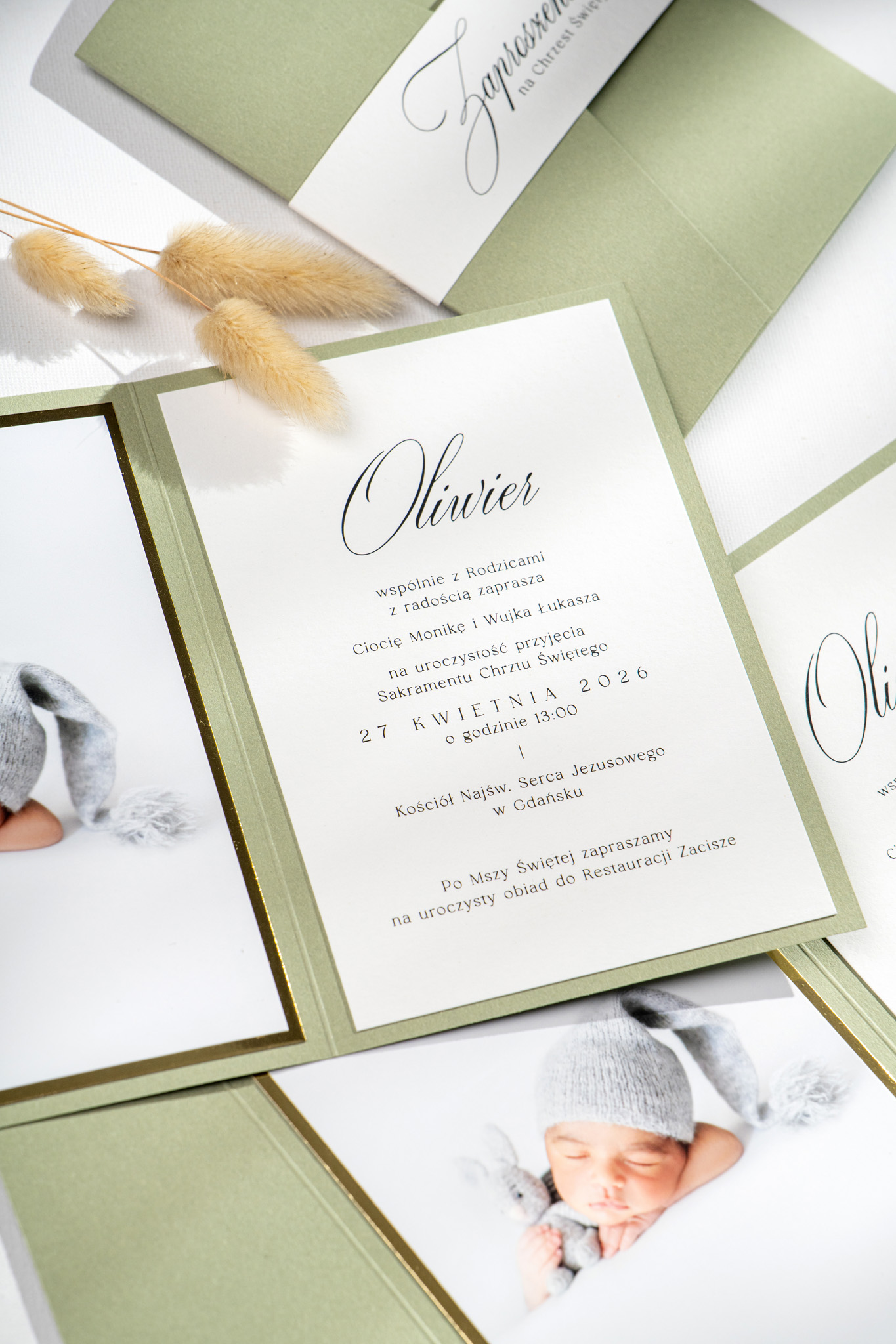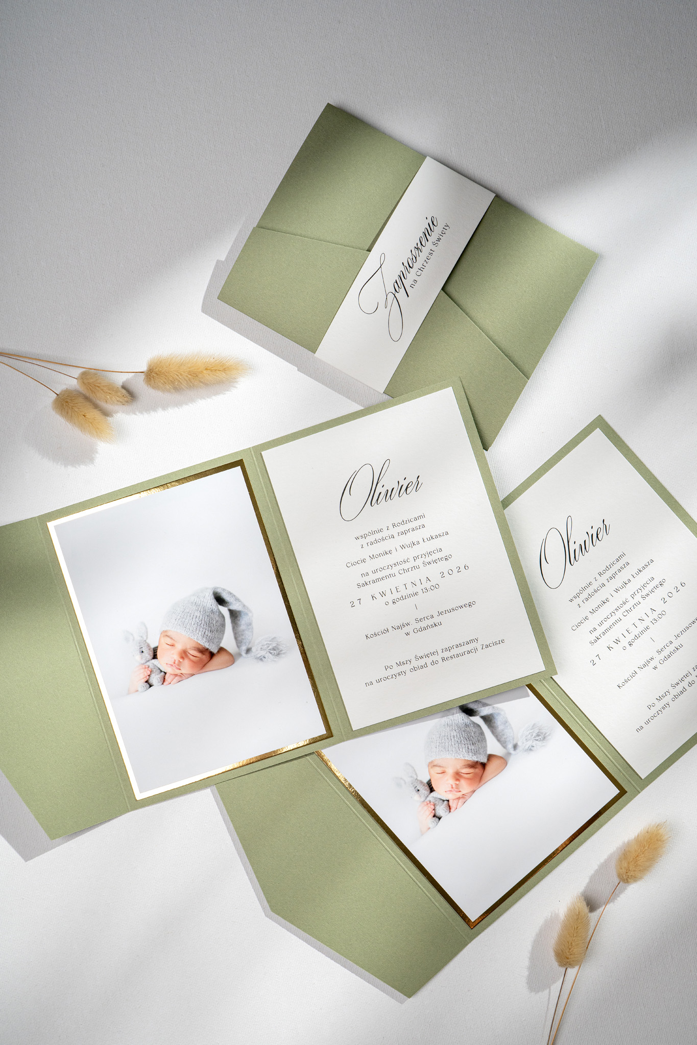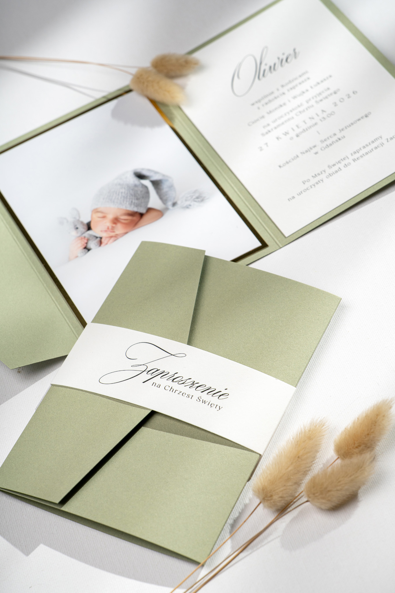 Zaproszenia na Chrzest ze zdjęciem – zielone, minimalistyczne boho