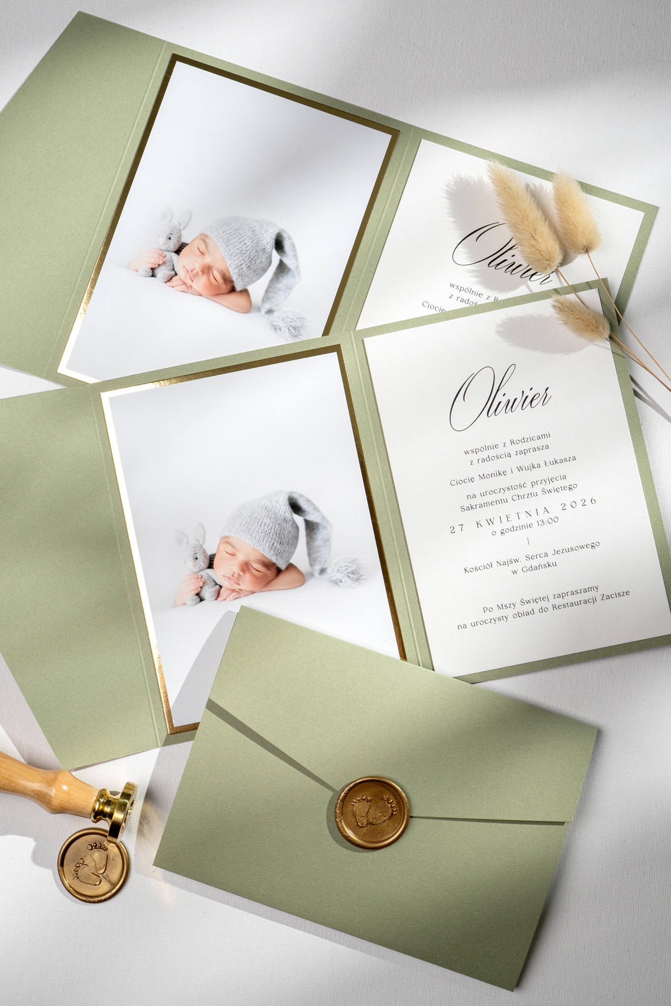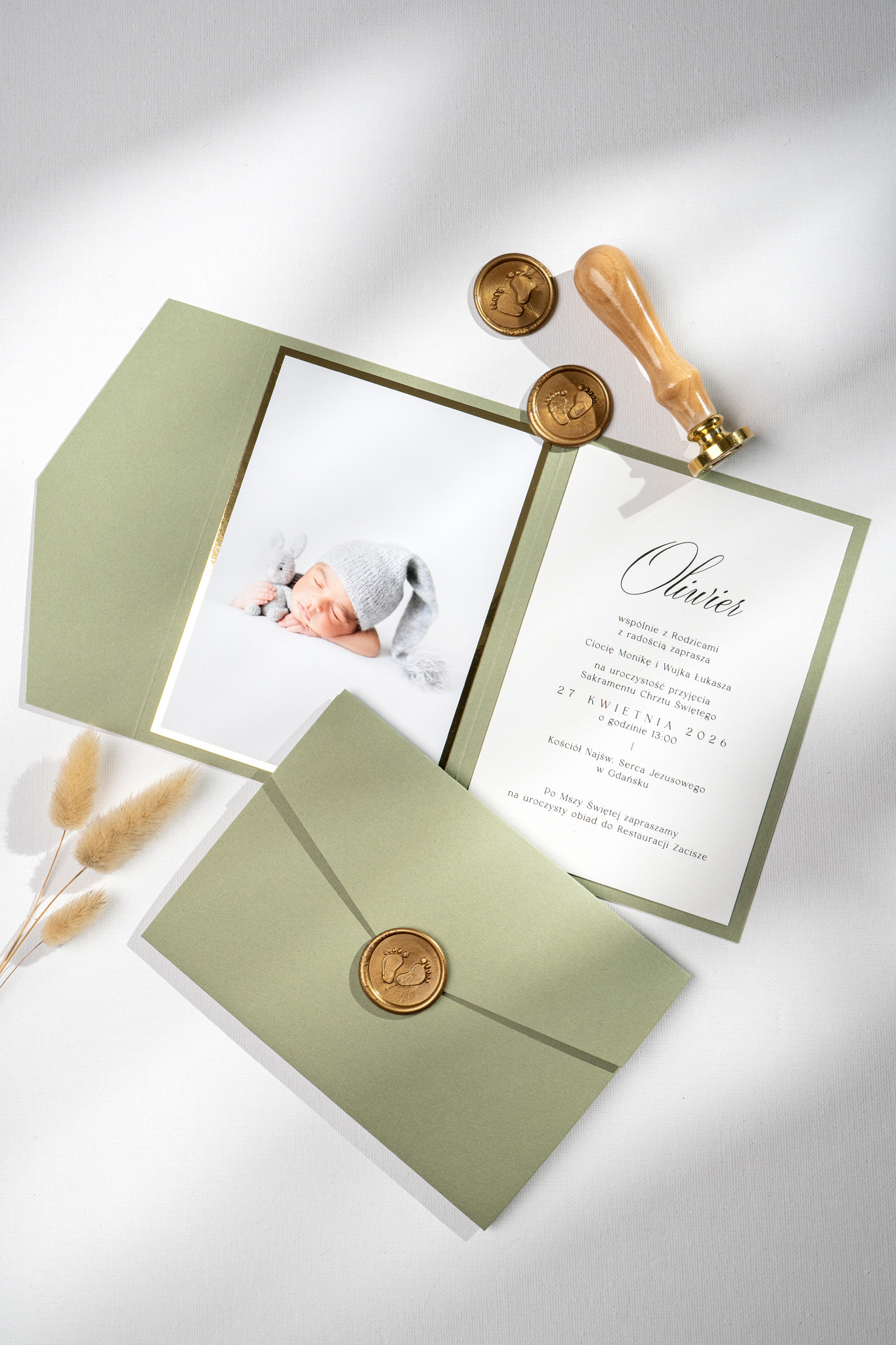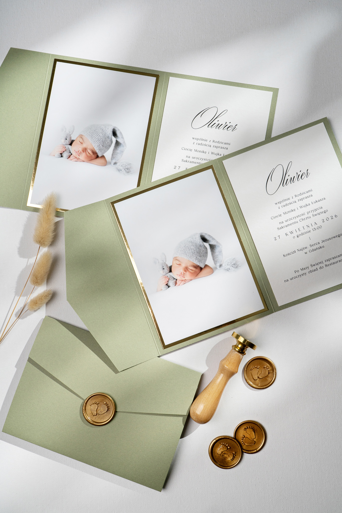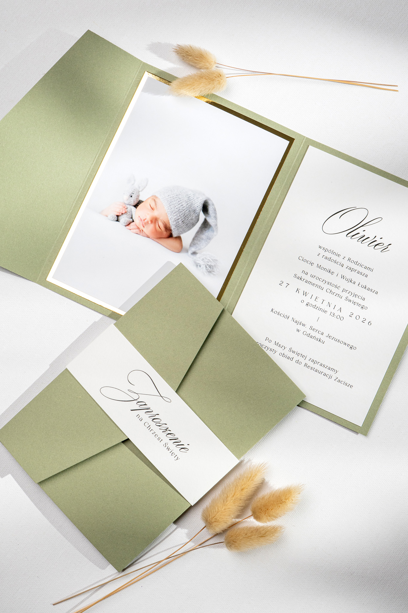 Zaproszenia na Chrzest ze zdjęciem – zielone, minimalistyczne boho