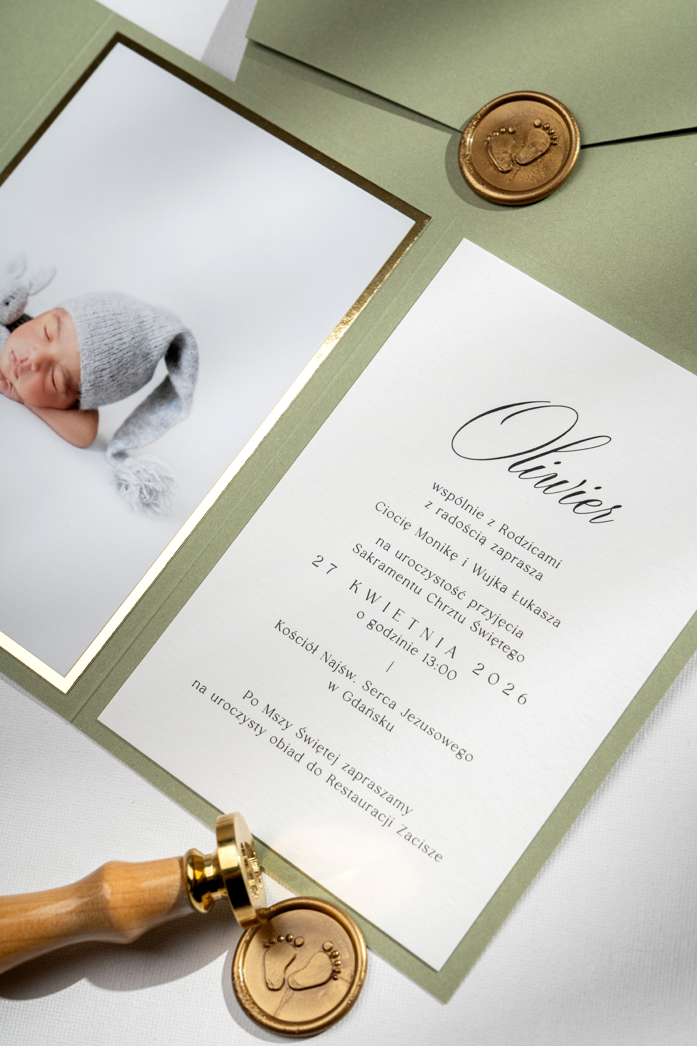 Wewnątrz folderu znajduje się zdjęcie dziecka, wydrukowane na papierze fotograficznym i ozdobione złotą ramką z lustrzanego papieru. Obok – główna karta zaproszenia wykonana z bawełnianego papieru w odcieniu śmietanki, o delikatnej, aczkolwiek wyczuwalnej strukturze.