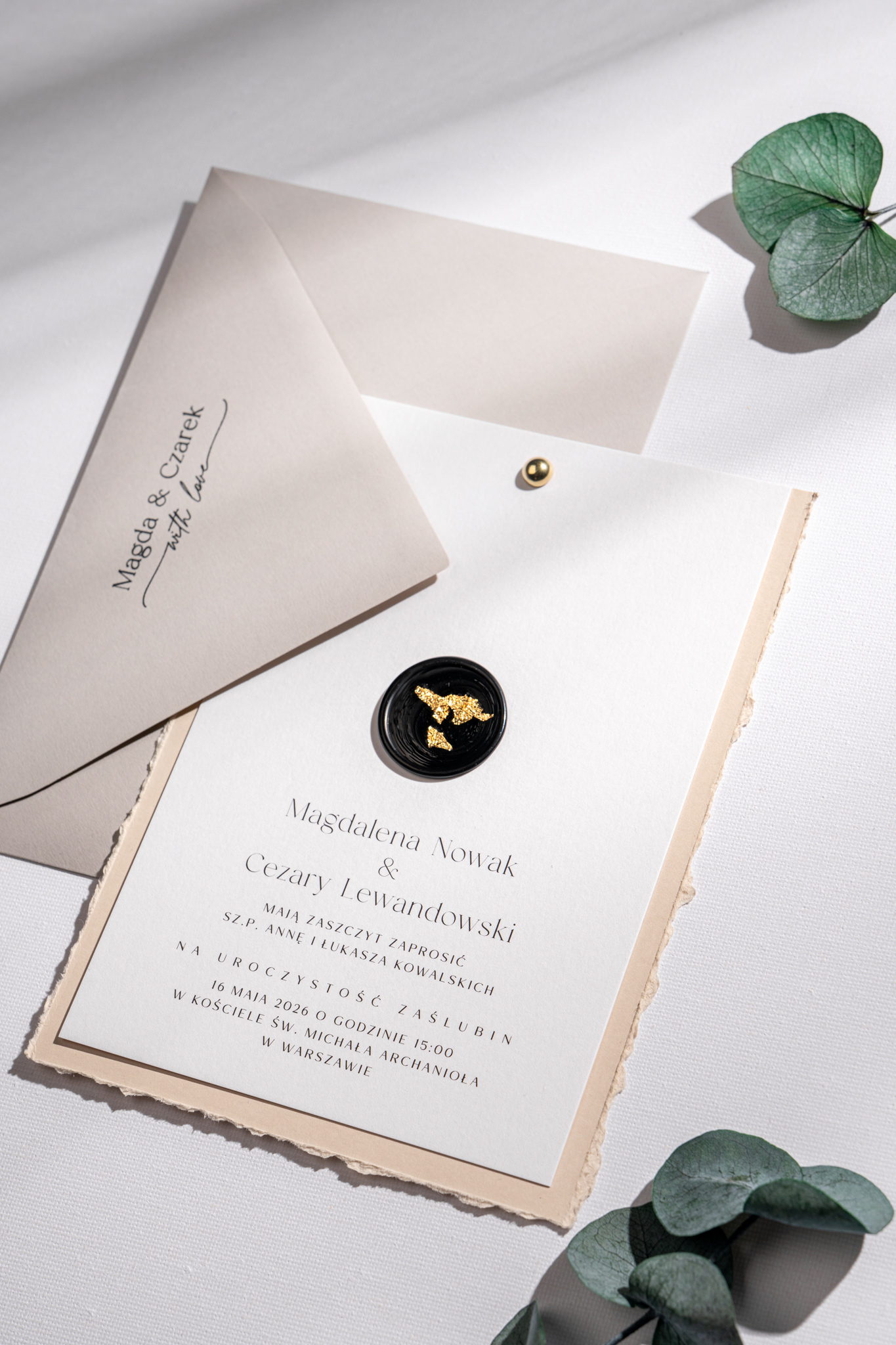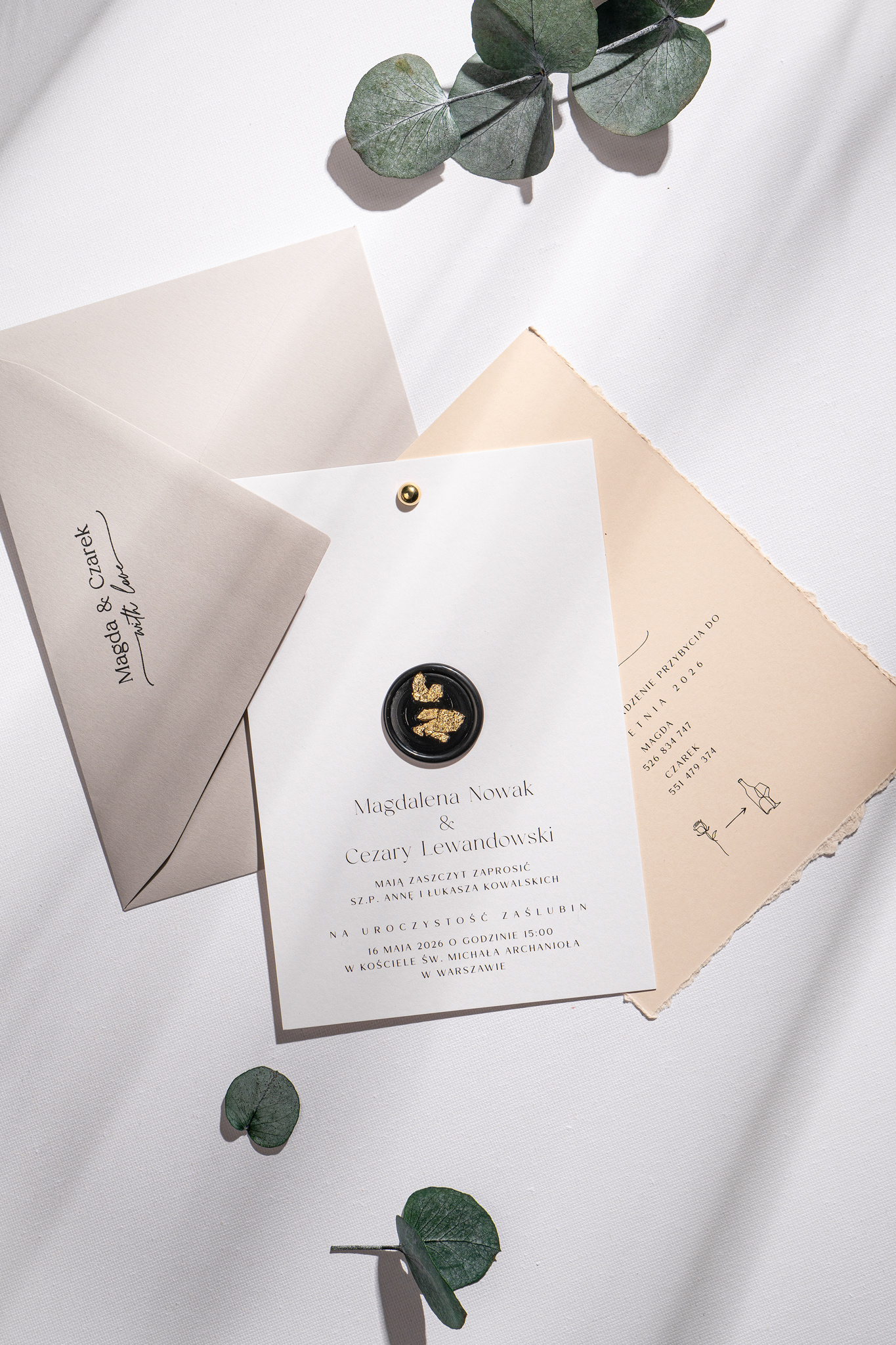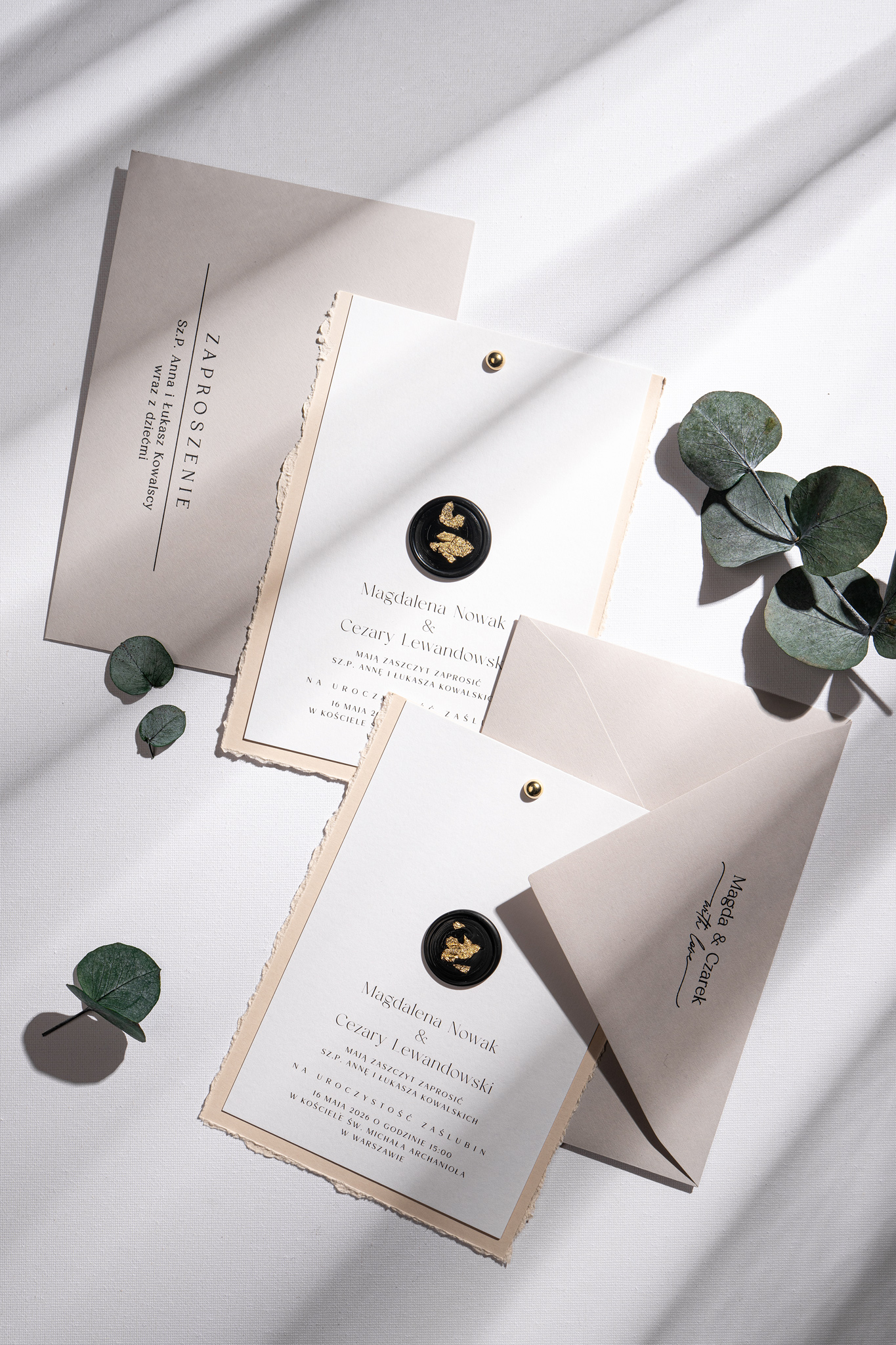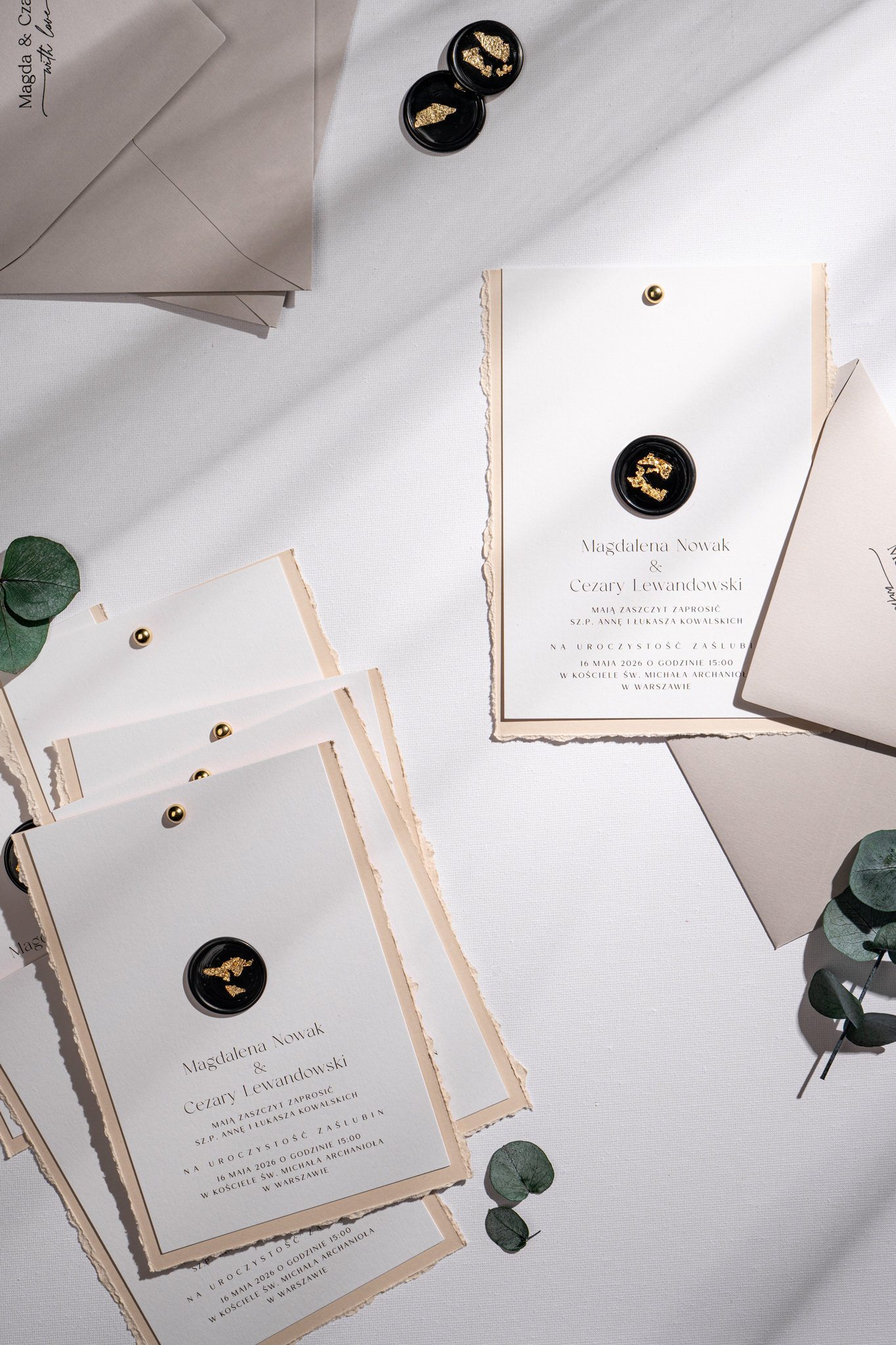 Obie karty spięte są złotym nitem w formie subtelnej kuleczki, a całość zdobi czarny stempel lakowy ze złoceniem, nadający wyjątkowego charakteru. Kompozycję dopełnia jasnoszara koperta, która podkreśla stonowany i harmonijny styl zaproszeń.