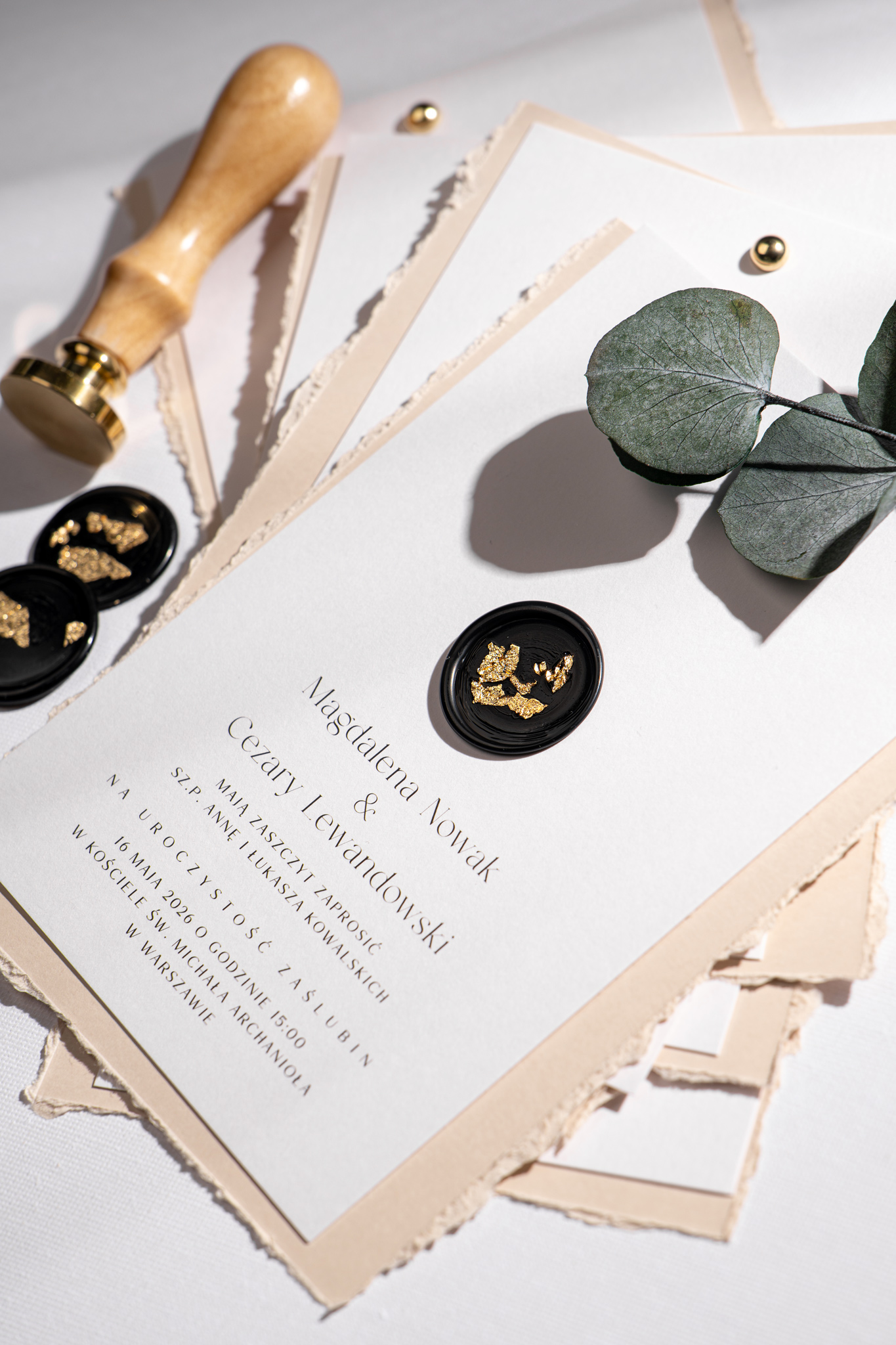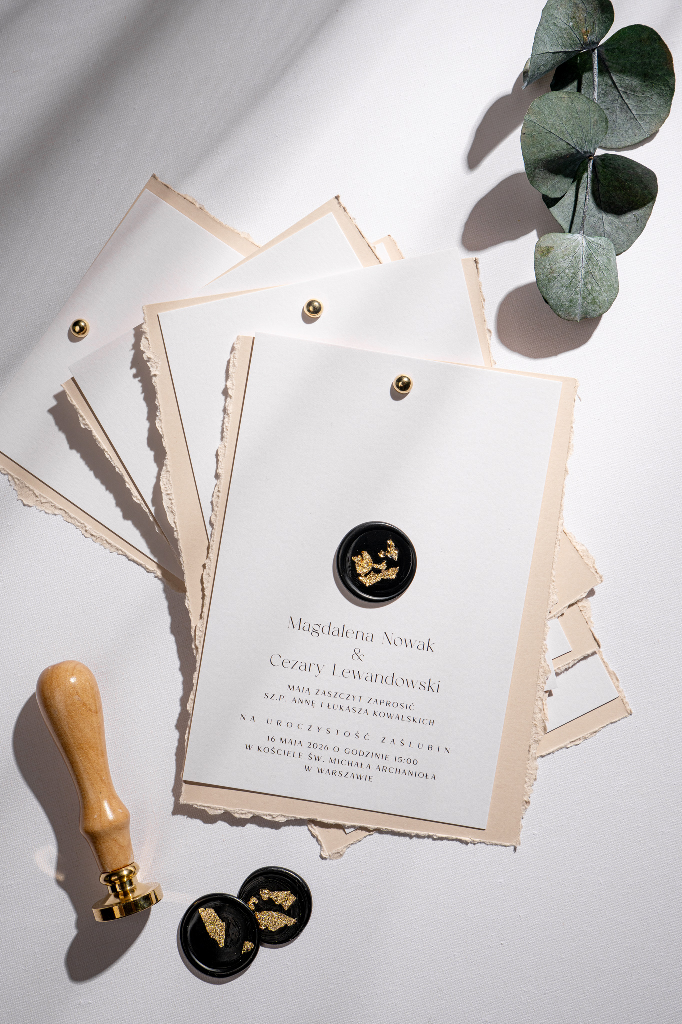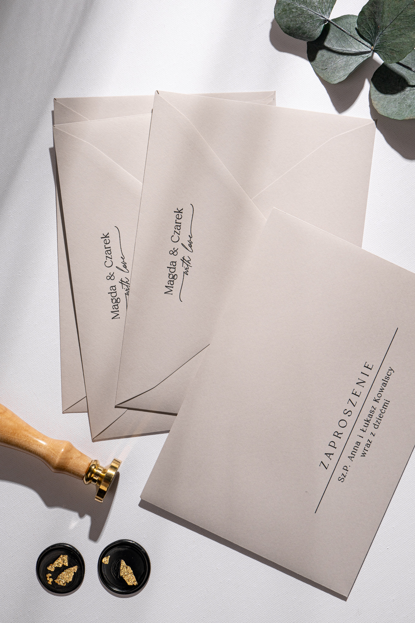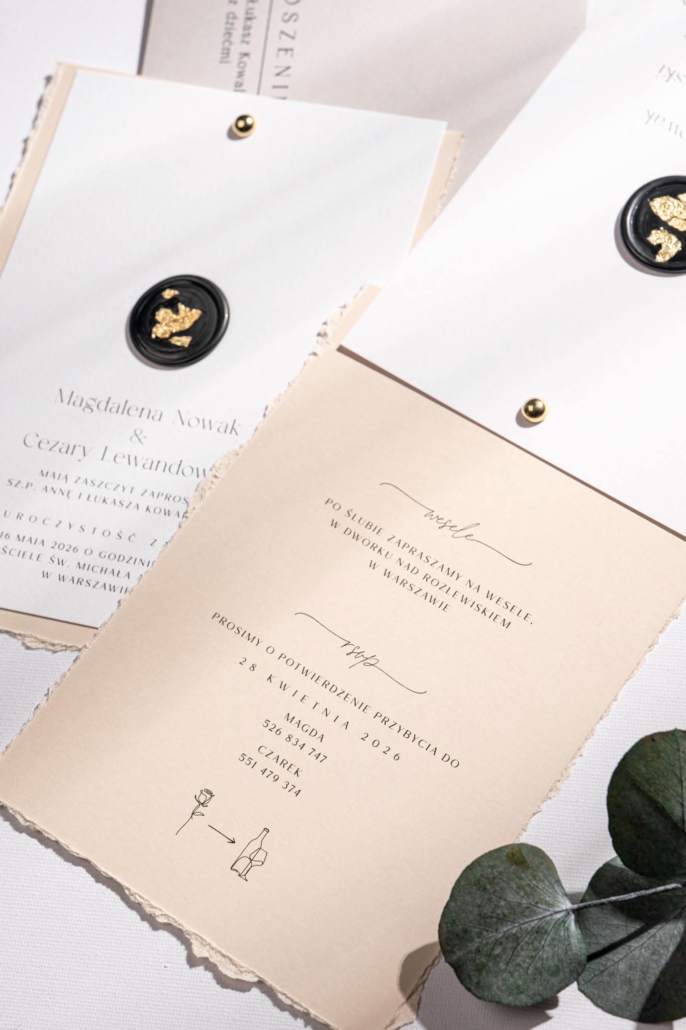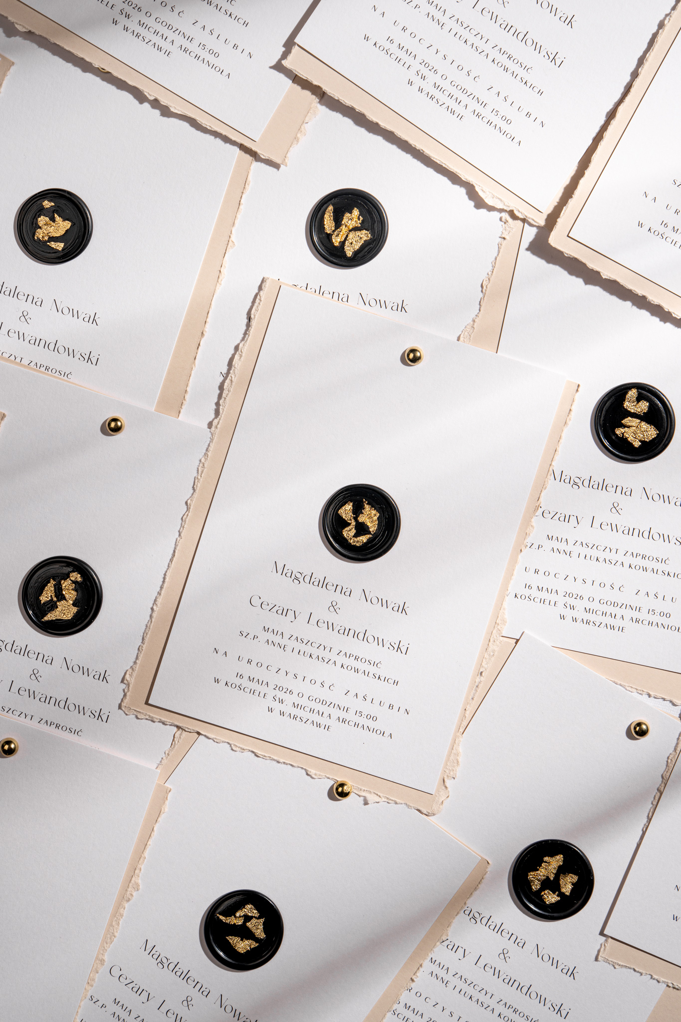 Obie karty spięte są złotym nitem w formie subtelnej kuleczki, a całość zdobi czarny stempel lakowy ze złoceniem, nadający wyjątkowego charakteru. Kompozycję dopełnia jasnoszara koperta, która podkreśla stonowany i harmonijny styl zaproszeń.
