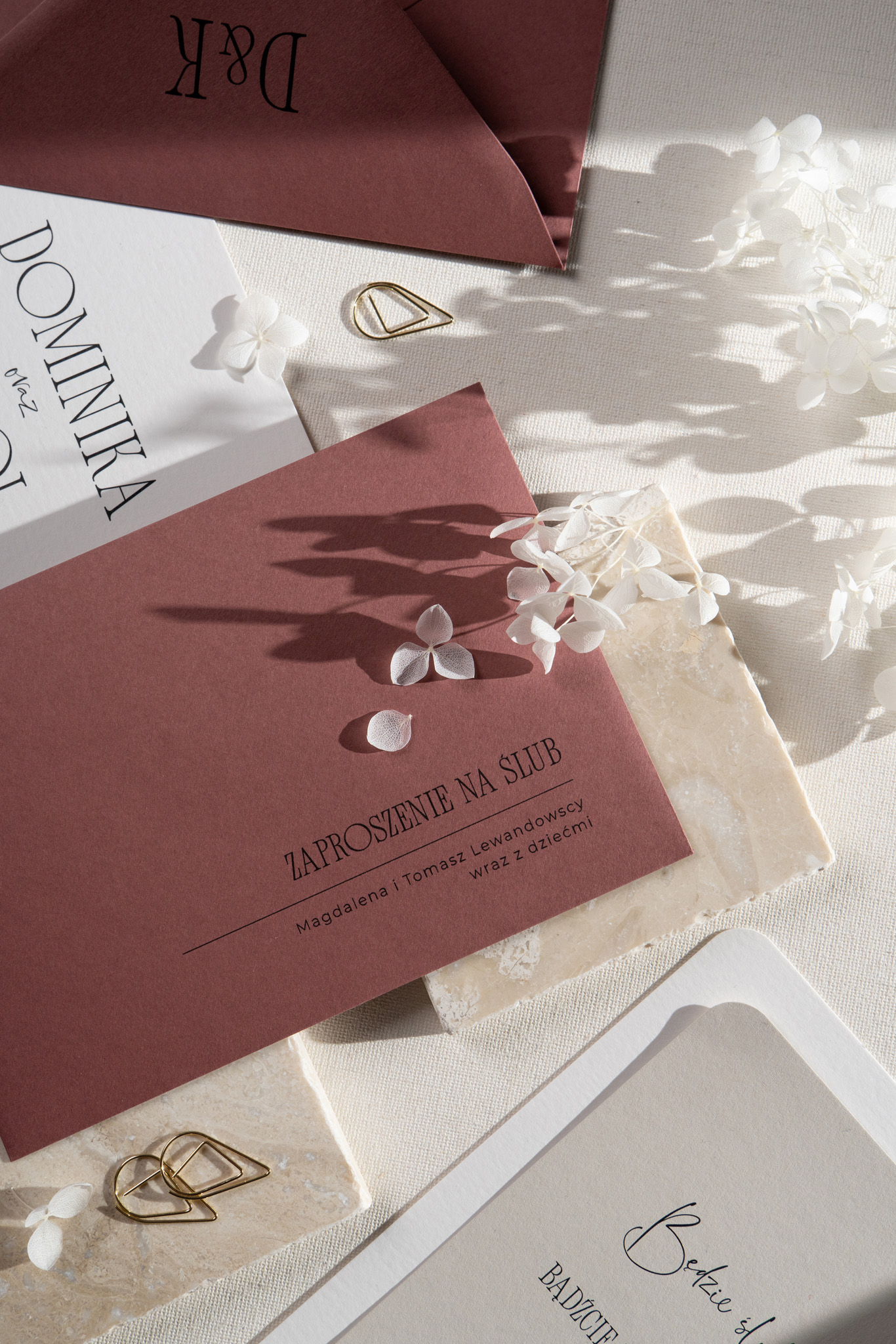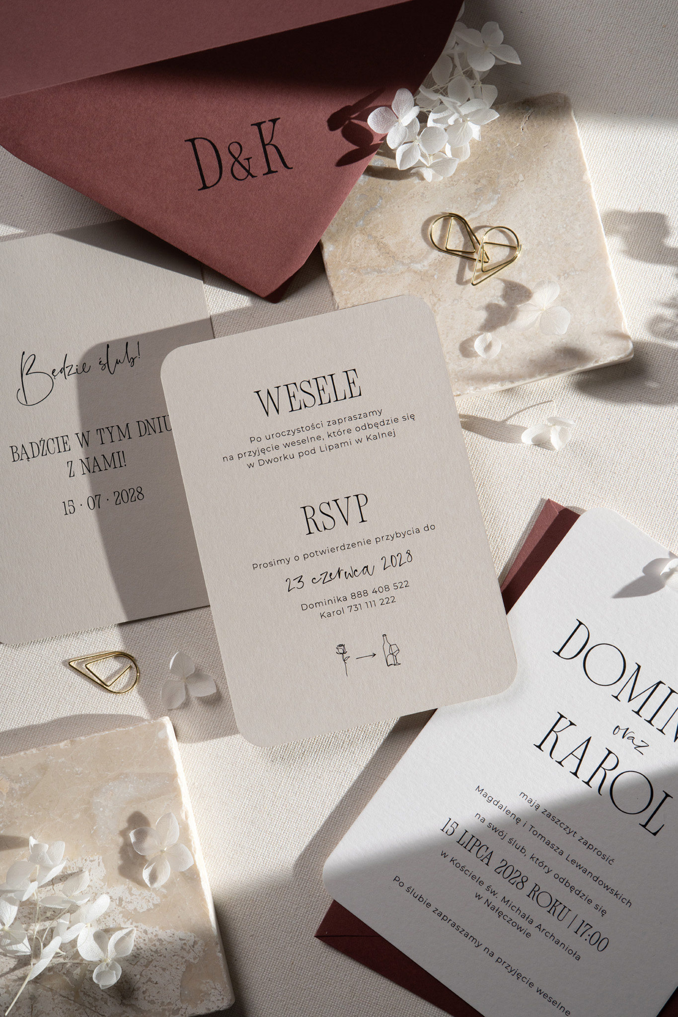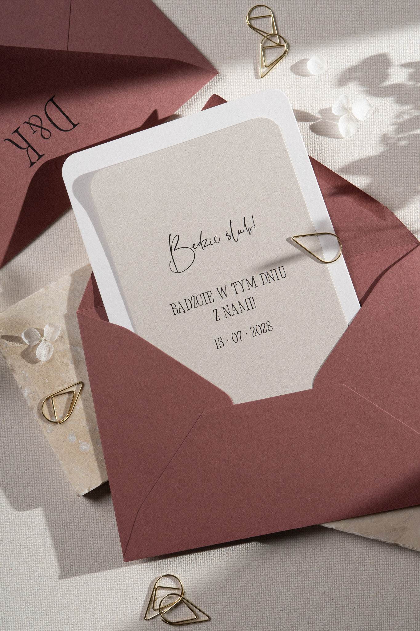 Druga karta, zadrukowana dwustronnie, występuje w eleganckim kolorze grey beige. To idealne tło dla dodatkowych informacji lub szczegółów przyjęcia; oczywiście treści są dowolne – dopasujemy je do Waszych potrzeb. Karty spięte są złotym, ozdobnym spinaczem, który stanowi nieco biżuteryjny akcent i subtelnie podkreśla luksusowy charakter. Całość dopełnia koperta w odcieniu ciemnego, przygaszonego różu – nietuzinkowa, a jednocześnie niezwykle elegancka.