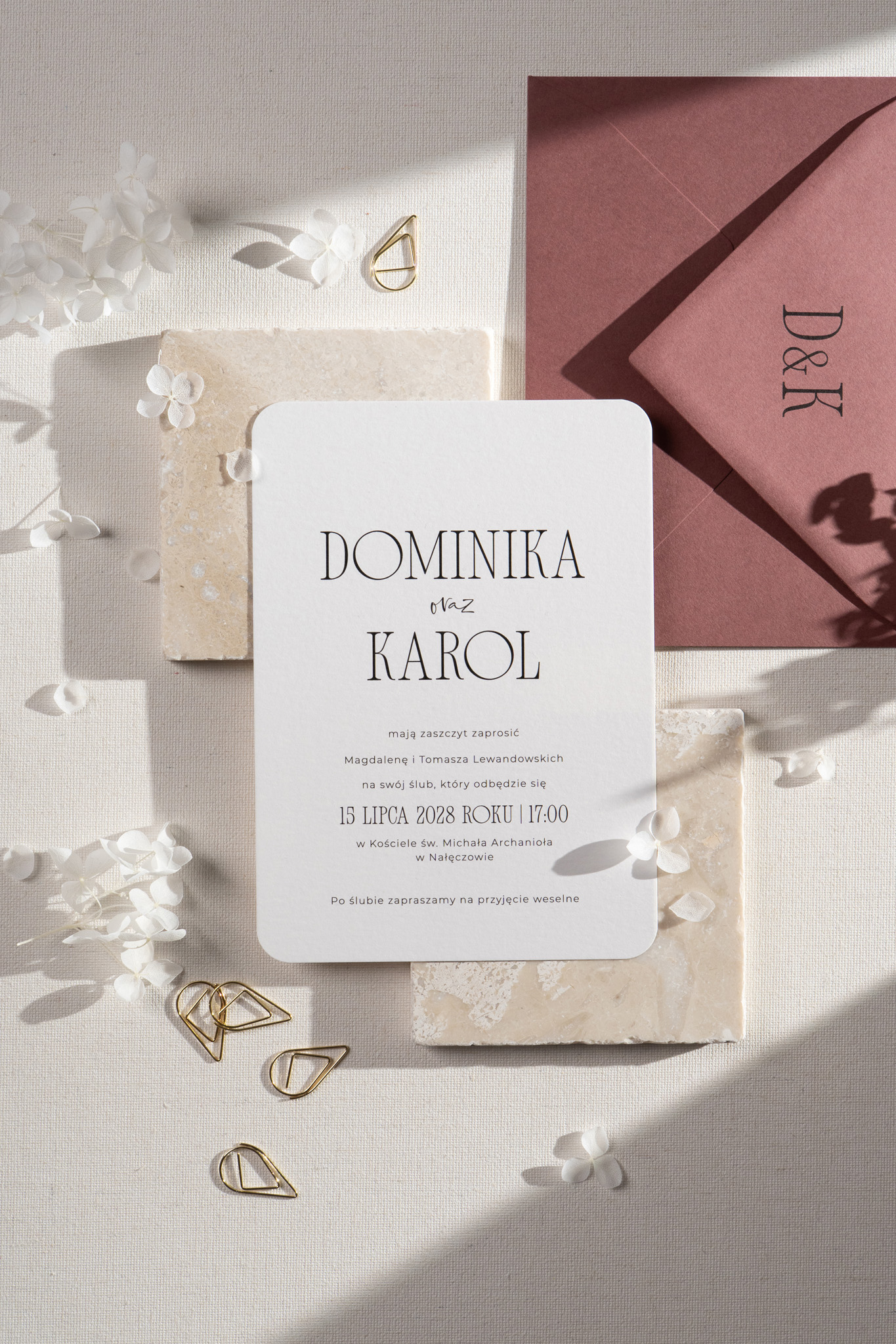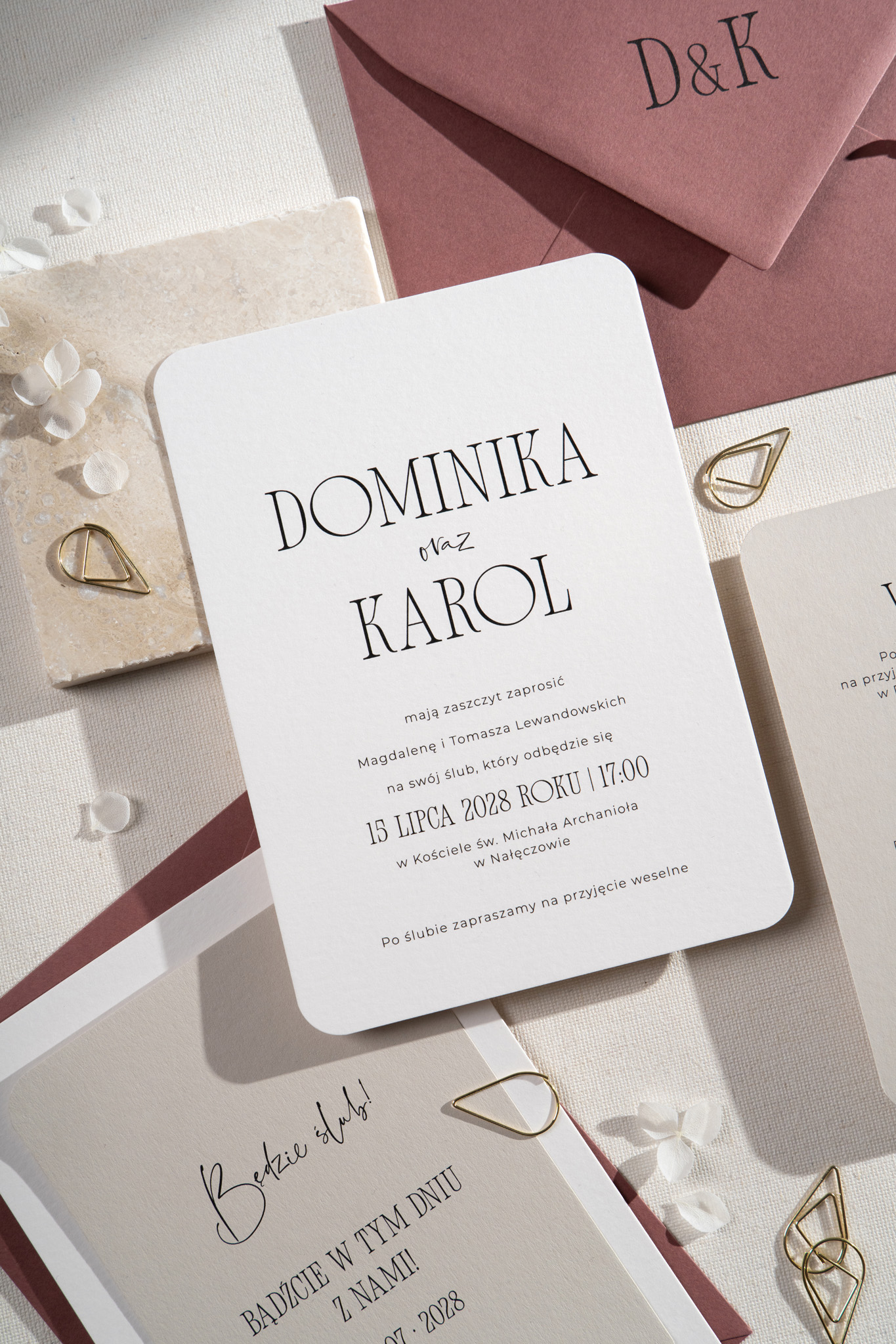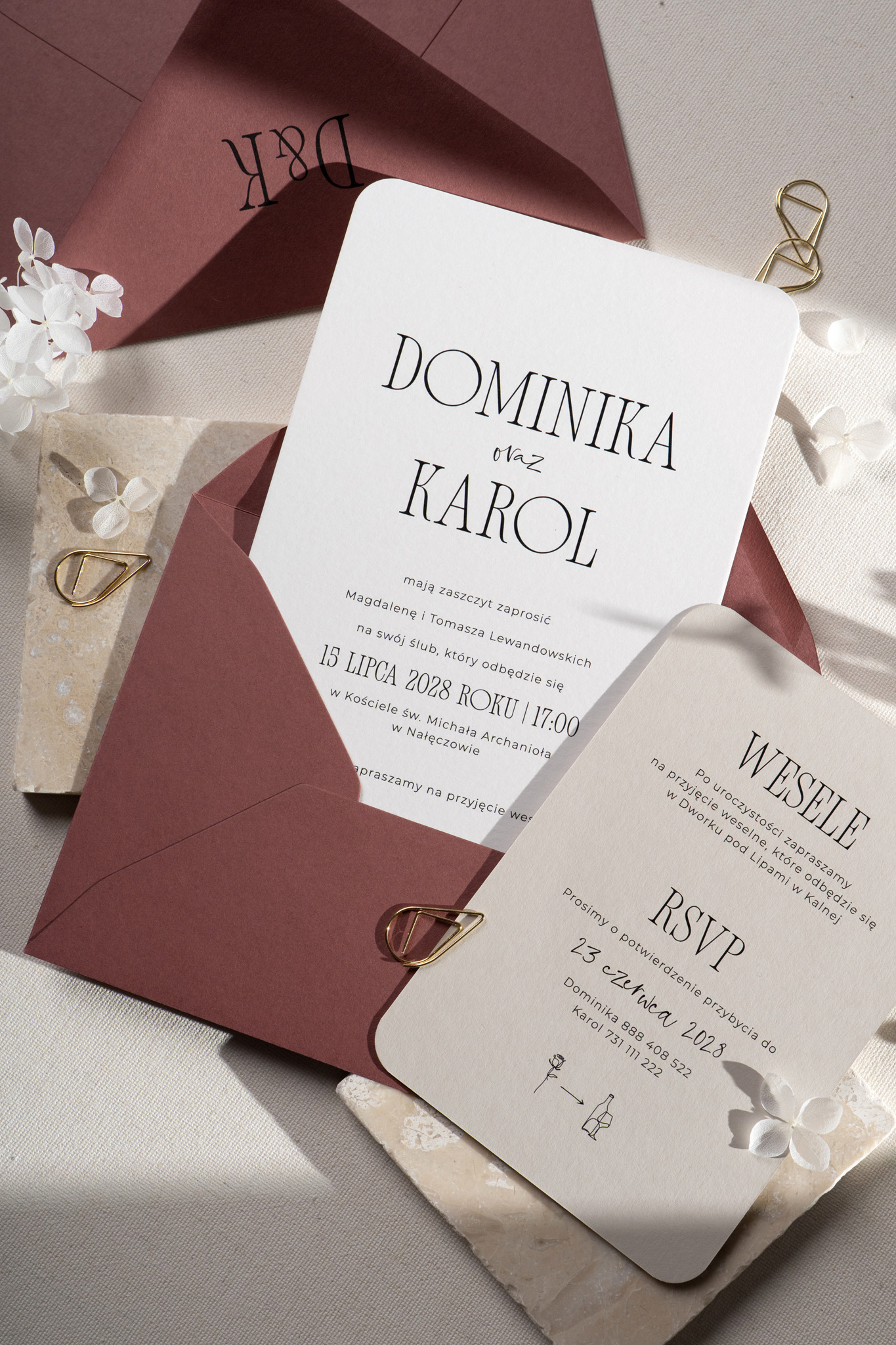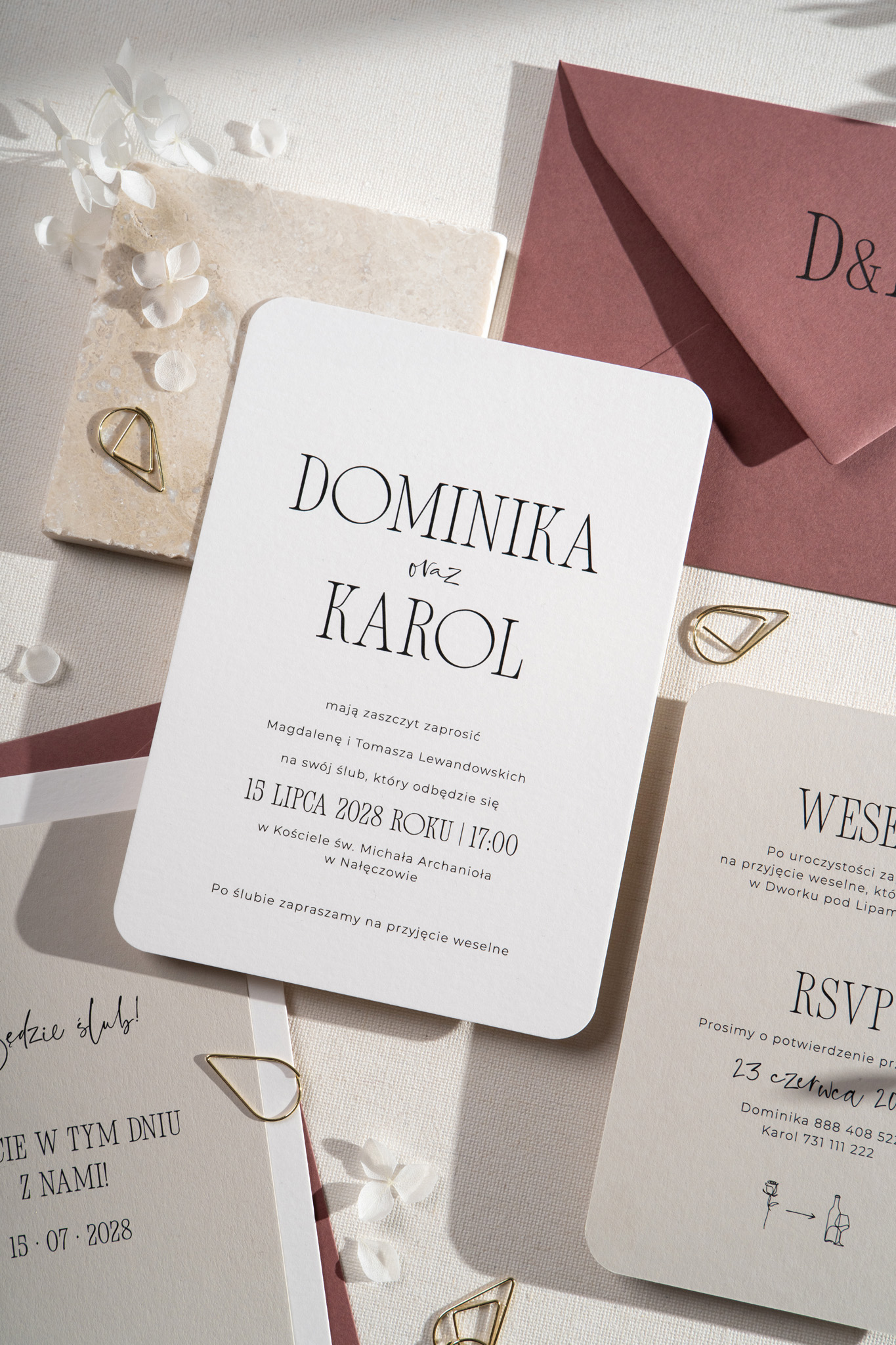 Druga karta, zadrukowana dwustronnie, występuje w eleganckim kolorze grey beige. To idealne tło dla dodatkowych informacji lub szczegółów przyjęcia; oczywiście treści są dowolne – dopasujemy je do Waszych potrzeb. Karty spięte są złotym, ozdobnym spinaczem, który stanowi nieco biżuteryjny akcent i subtelnie podkreśla luksusowy charakter. Całość dopełnia koperta w odcieniu ciemnego, przygaszonego różu – nietuzinkowa, a jednocześnie niezwykle elegancka.