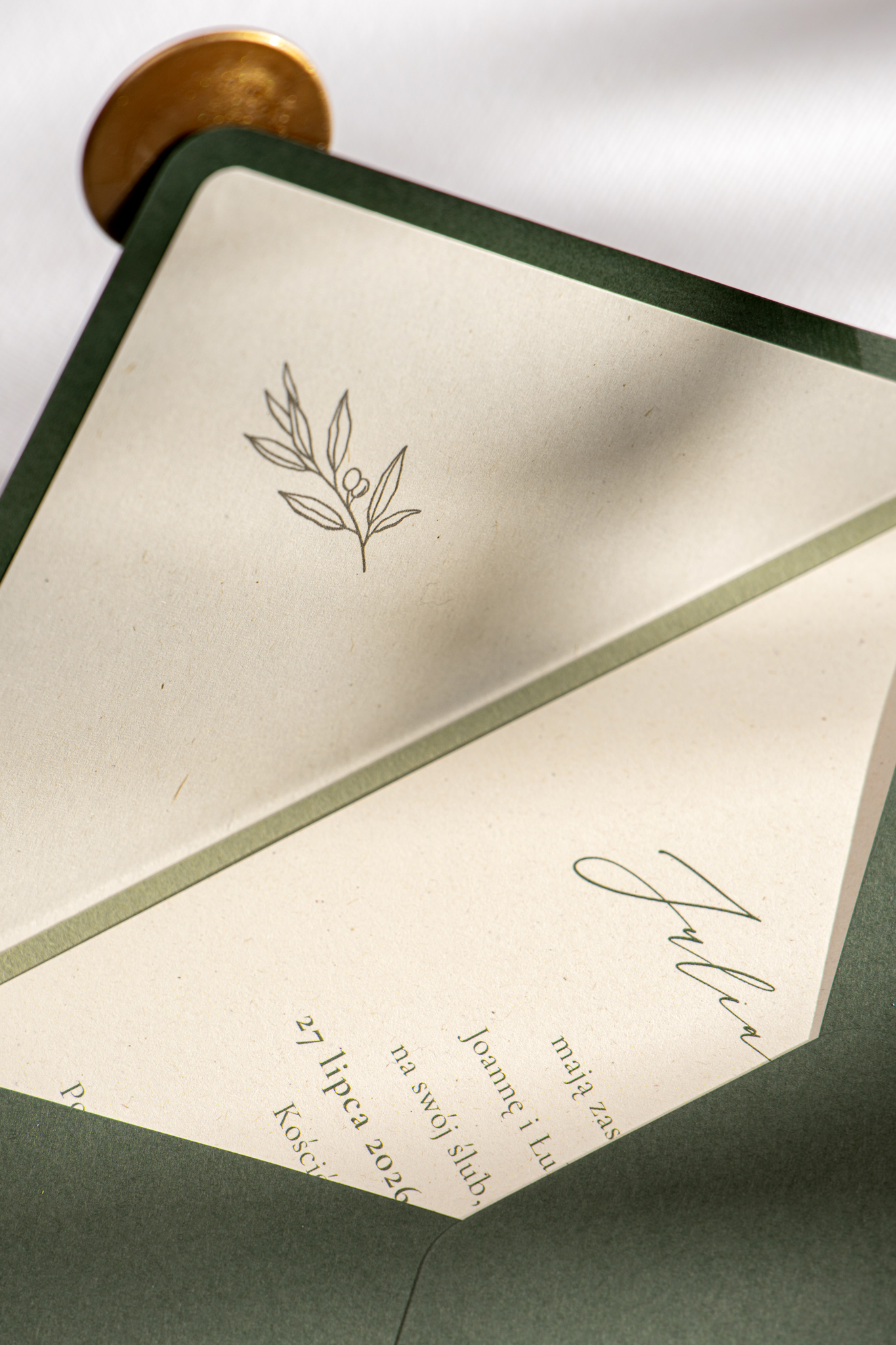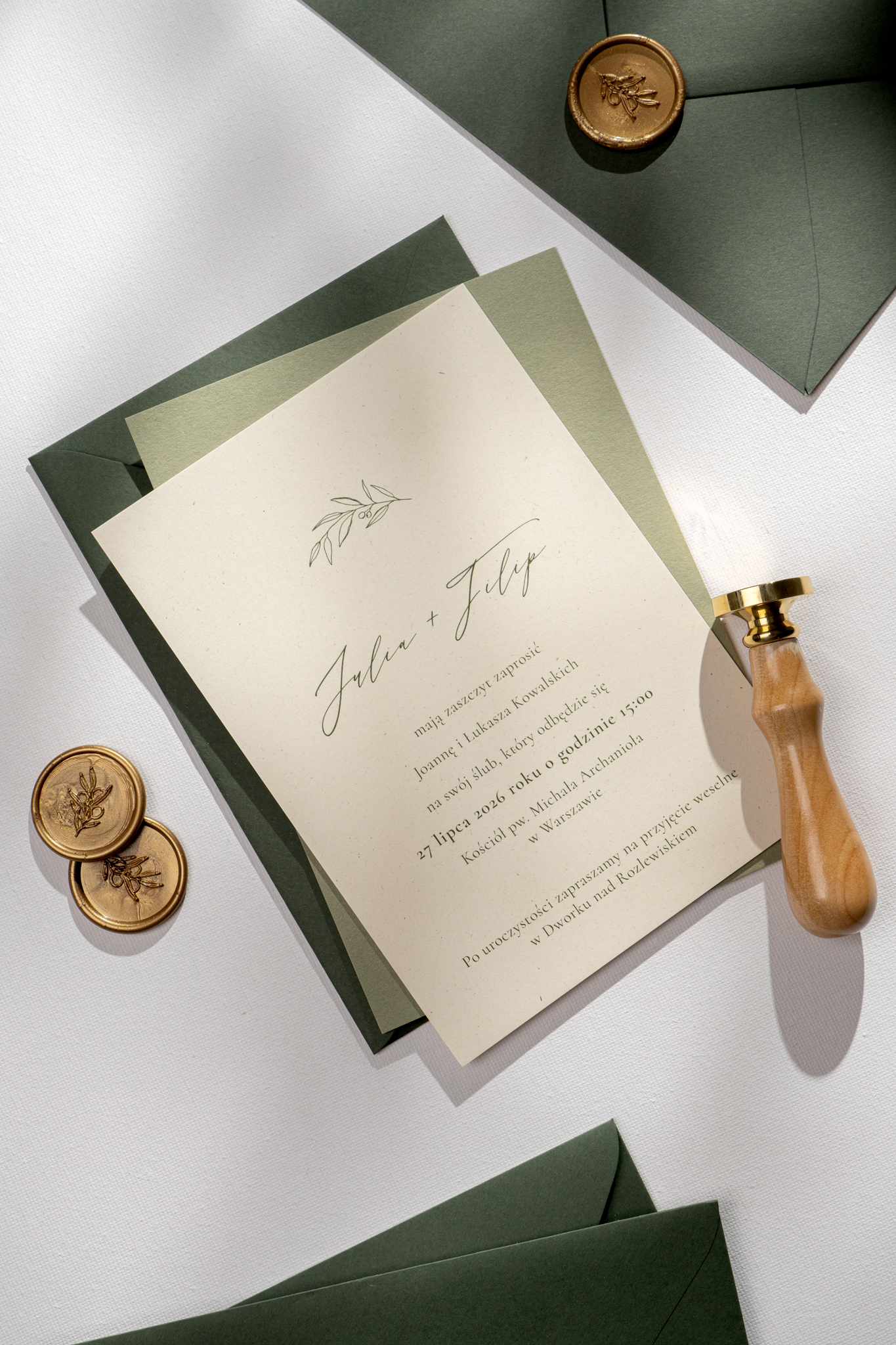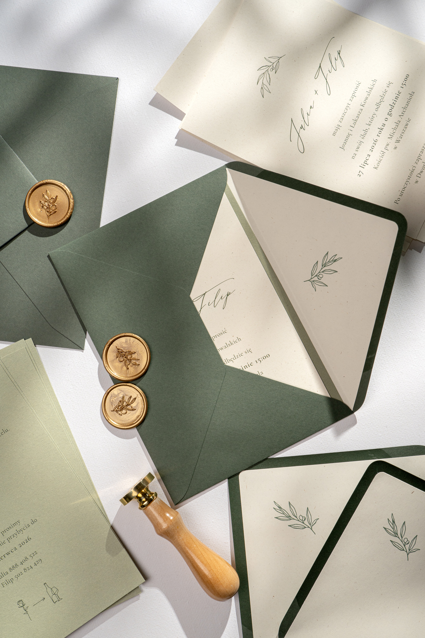 Dla Par, które pragną wzbogacić zaproszenie o wyjątkowe detale, dostępne są opcjonalne wklejki do wnętrza koperty (z papieru ecru) oraz złote stemple lakowe z motywem gałązki oliwnej.