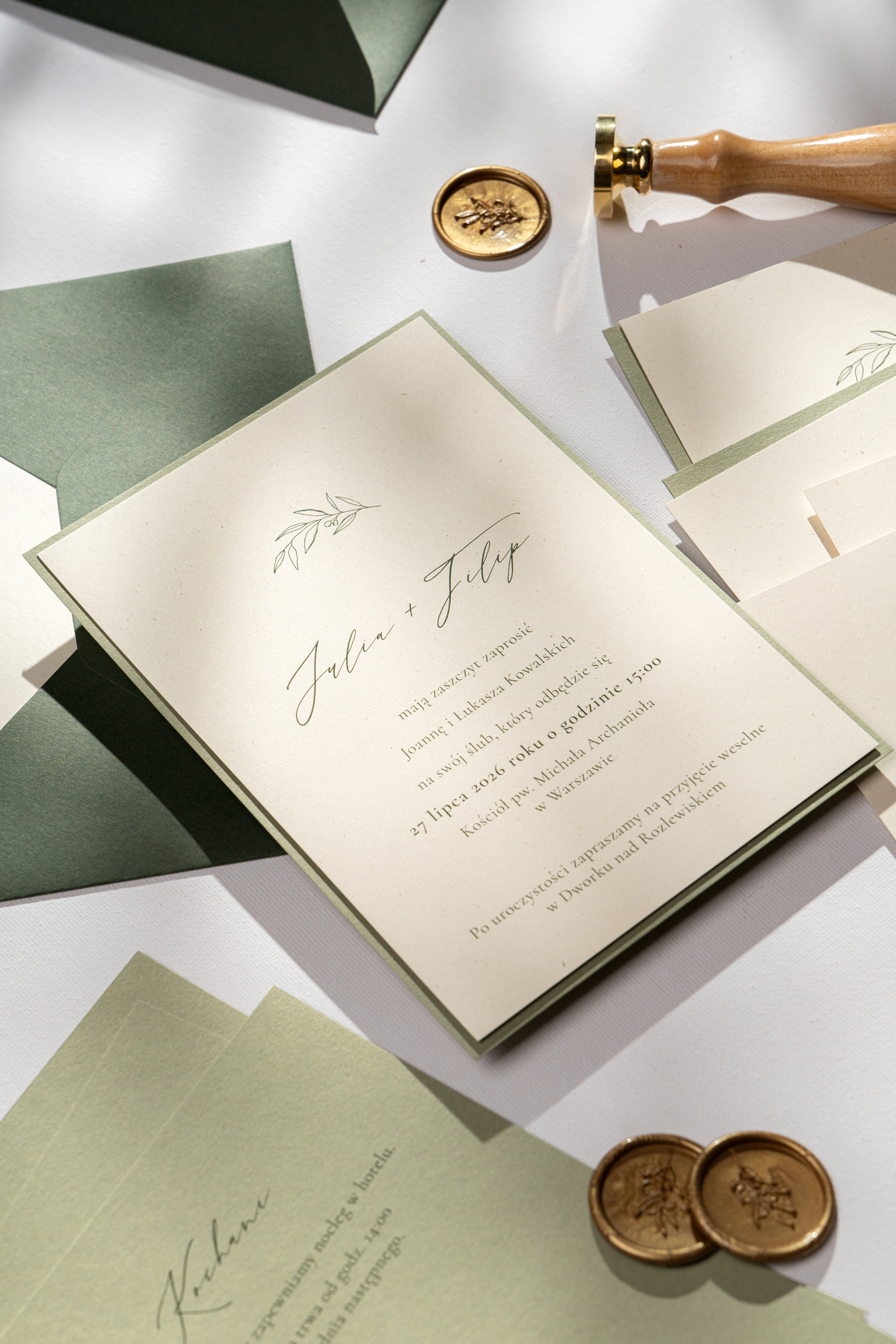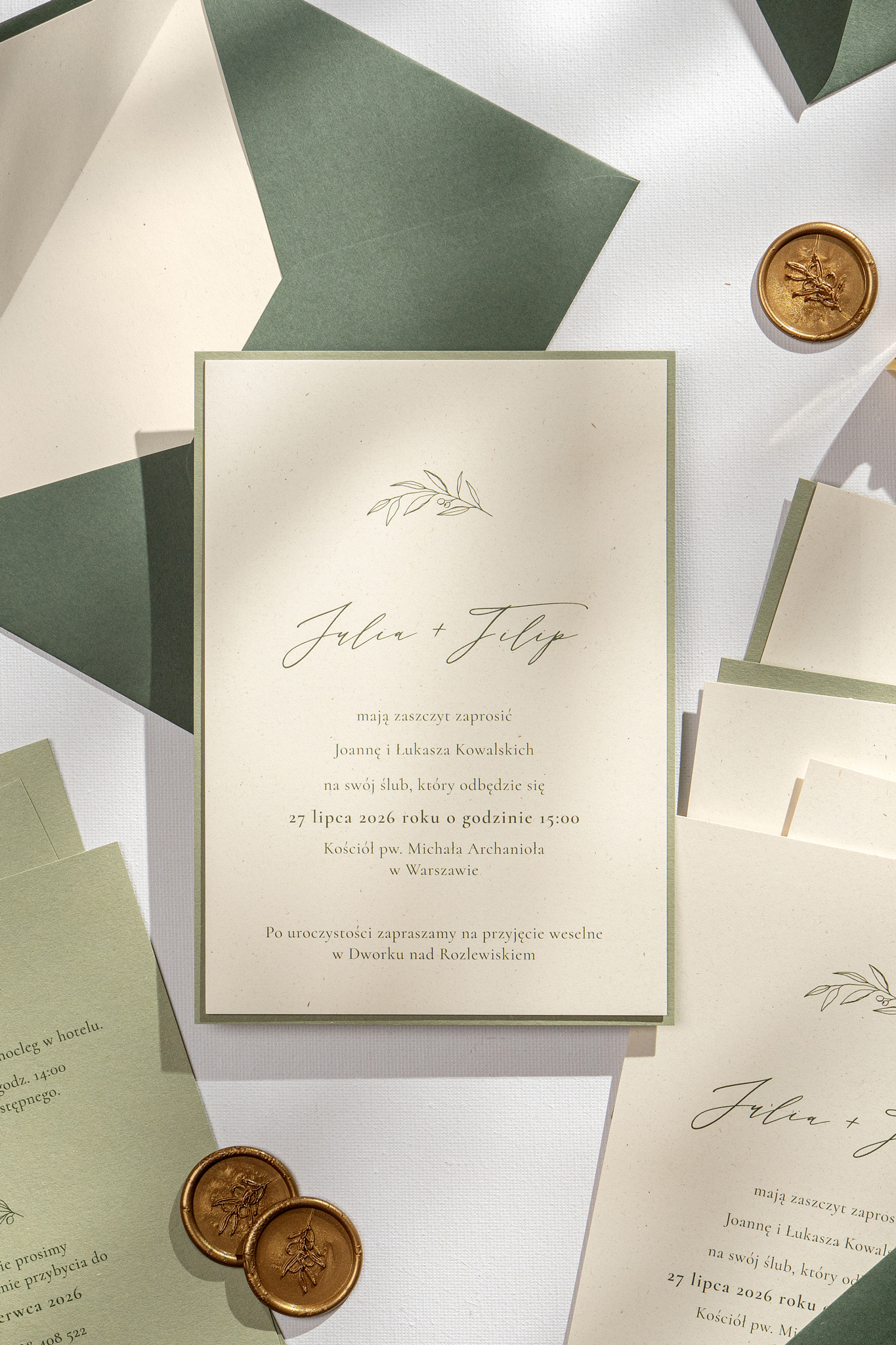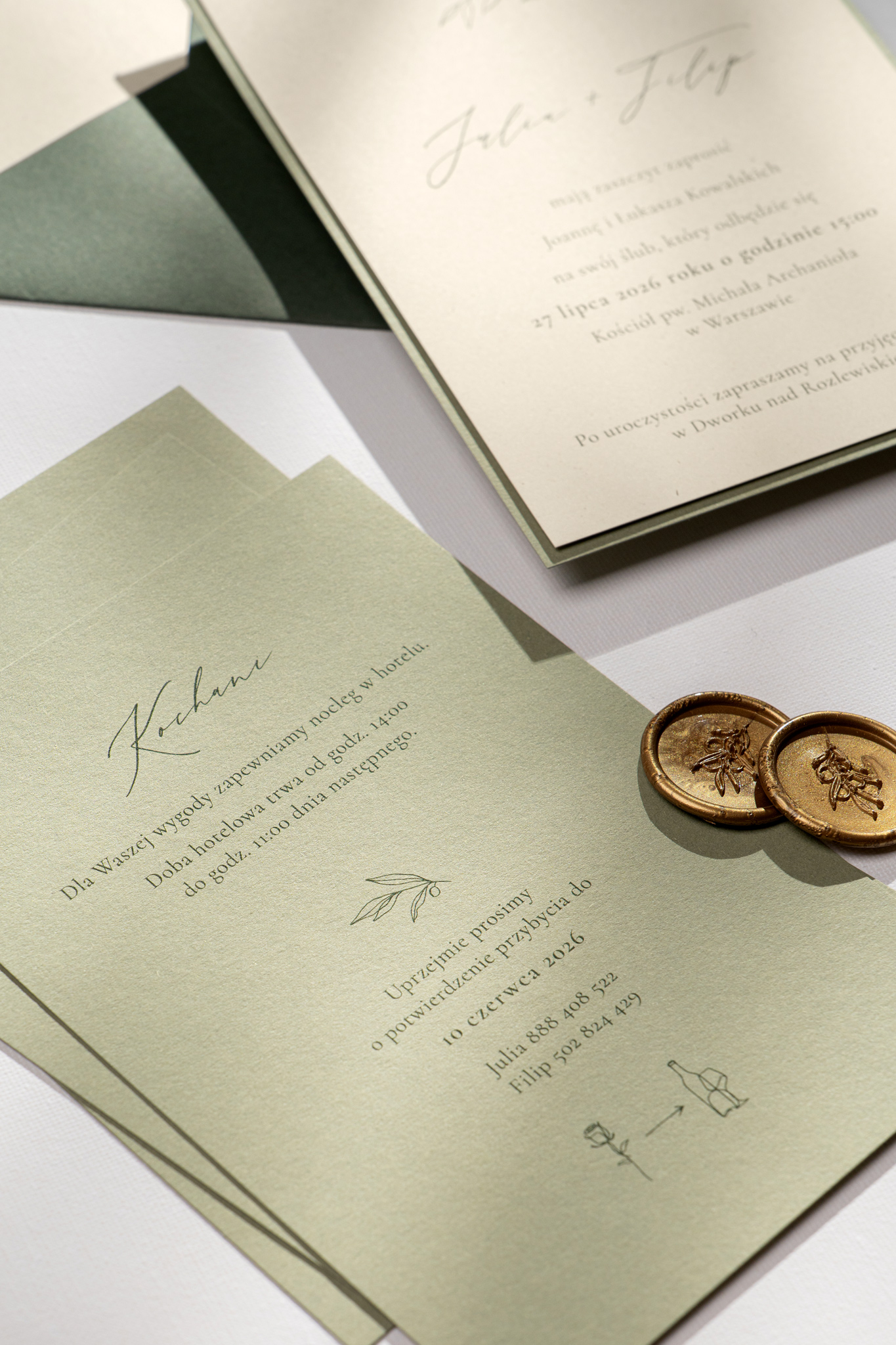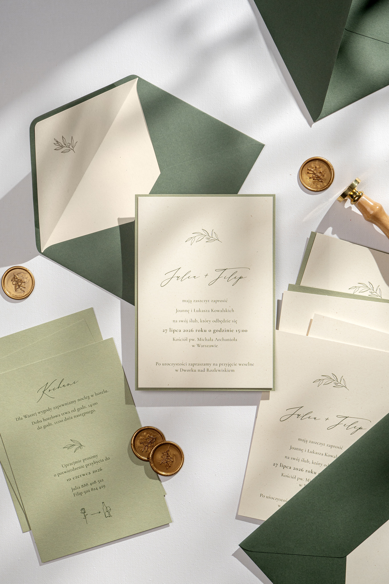 Dla Par, które pragną wzbogacić zaproszenie o wyjątkowe detale, dostępne są opcjonalne wklejki do wnętrza koperty (z papieru ecru) oraz złote stemple lakowe z motywem gałązki oliwnej.