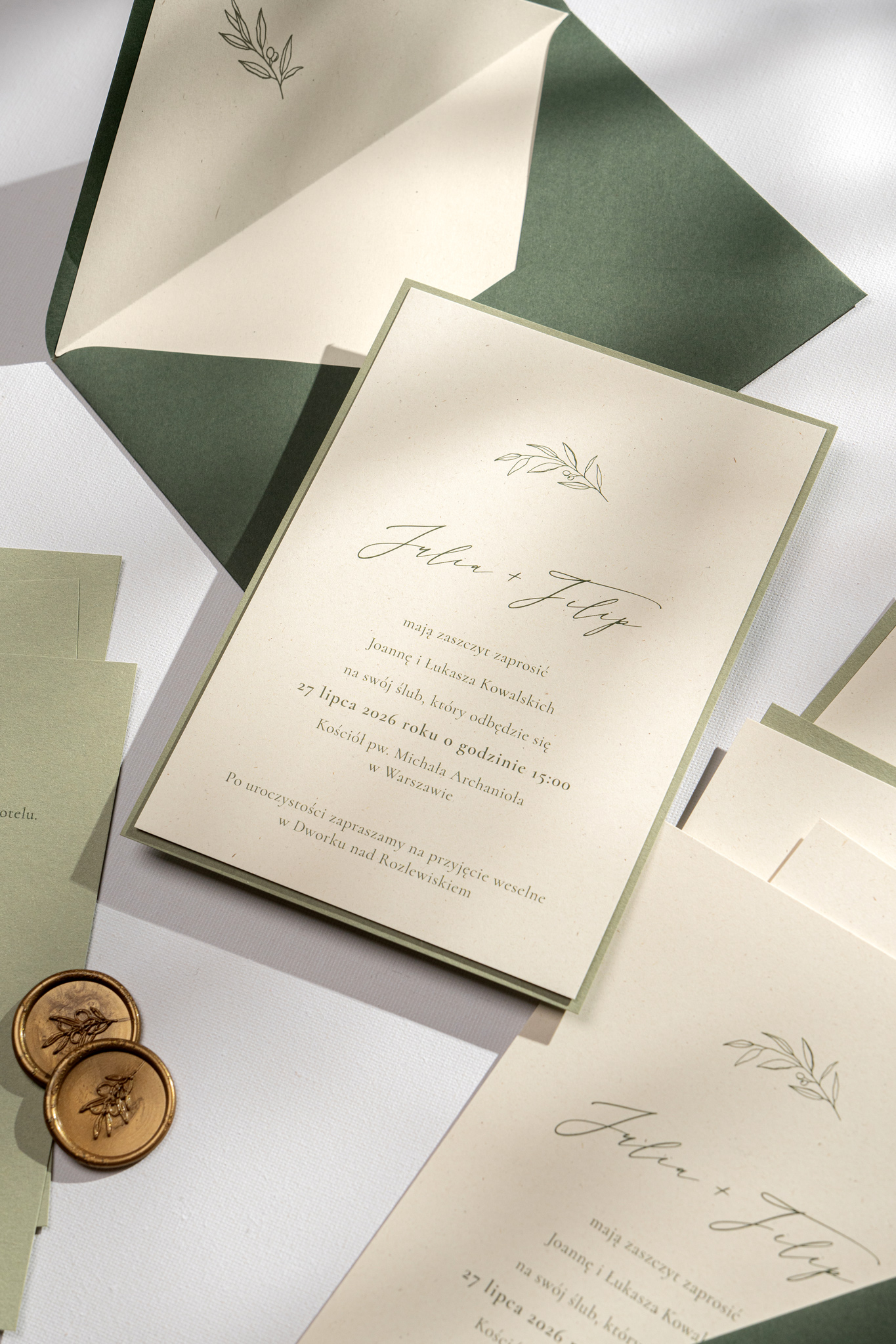 Inspirowane południowym ciepłem i lekkością włoskiej estetyki. Zestaw tworzą dwie karty: główna, wykonana z papieru w odcieniu ecru z charakterystycznymi roślinnymi wtrąceniami, oraz druga – w kolorze jasnej oliwki, utrzymana w równie naturalnym tonie. Obie harmonijnie łączą organiczne faktury z nowoczesną typografią.