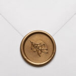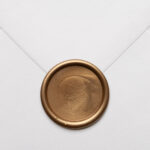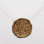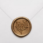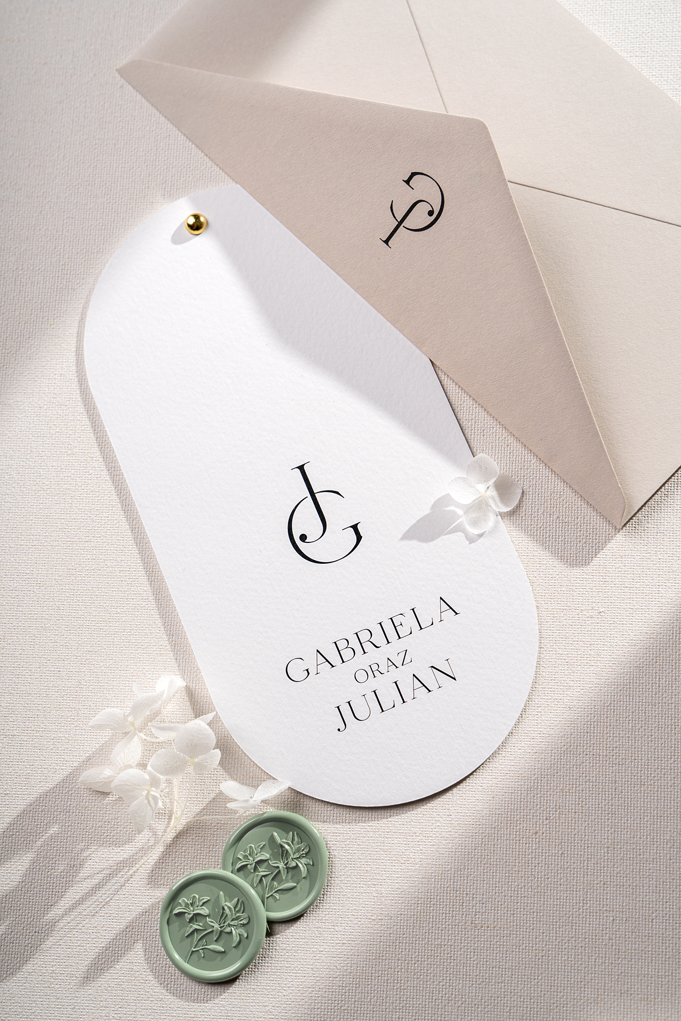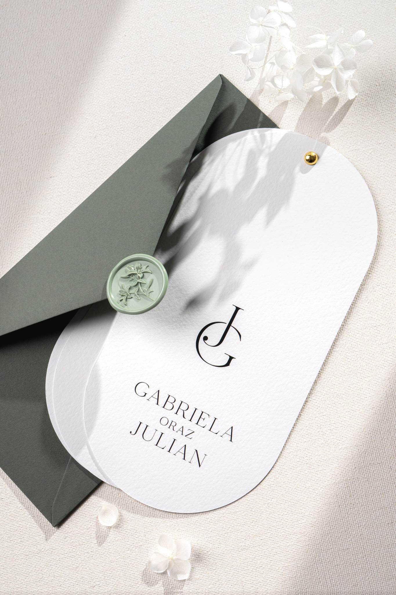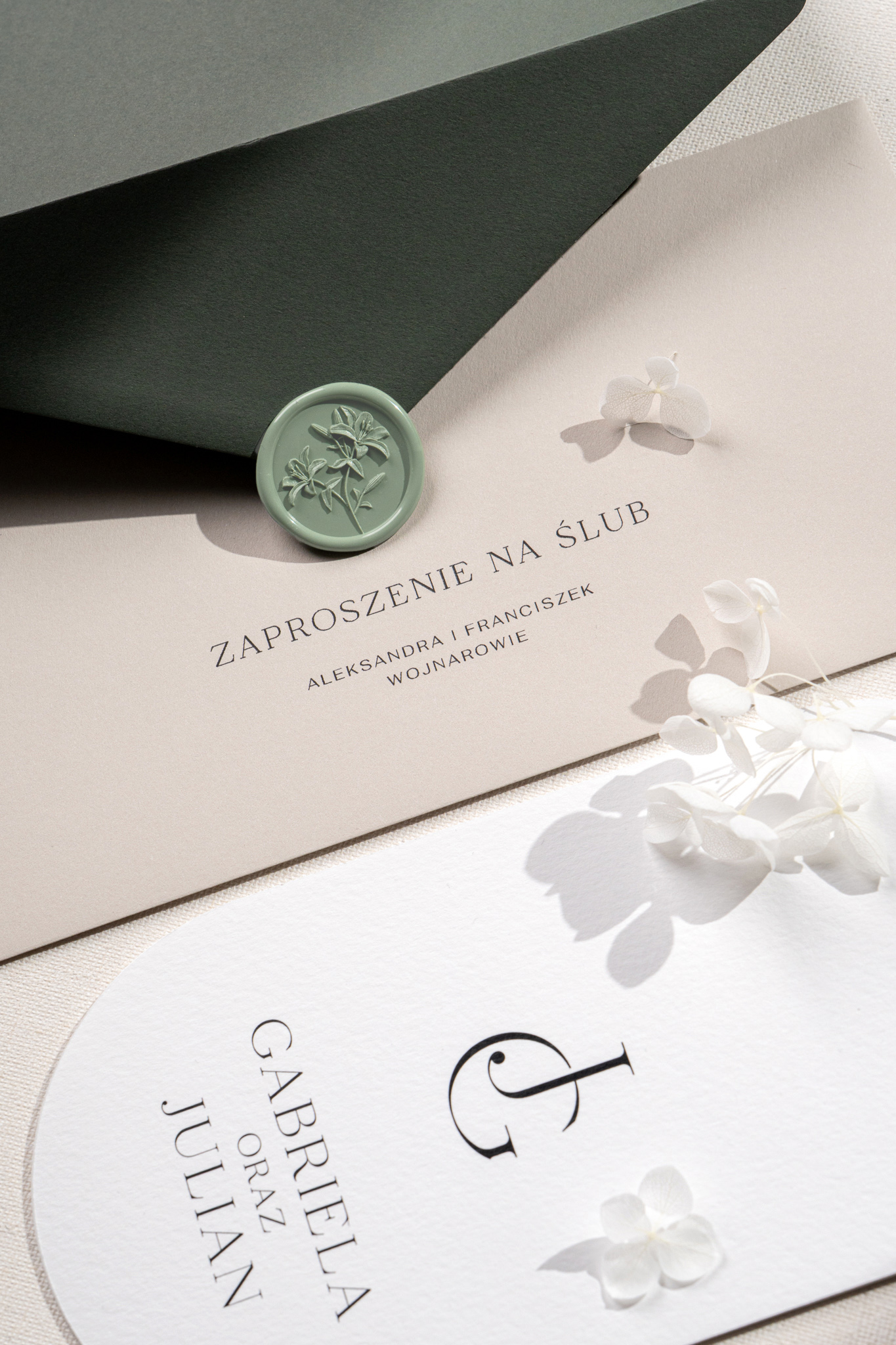 Zaproszenia spięte są subtelnym, złotym, ozdobnym nitem, a całość pięknie dopełniają eleganckie koperty w kolorze ciemnej zieleni lub kaszmirowego – grey beige. Ponadczasowym detalem są stemple lakowe, które mogą zdobić koperty – na zdjęciach w odcieniu sage green.