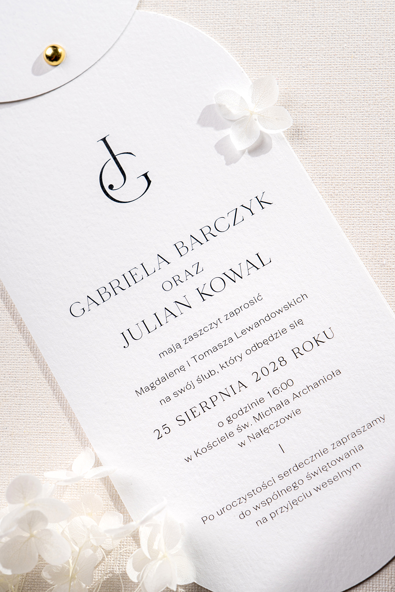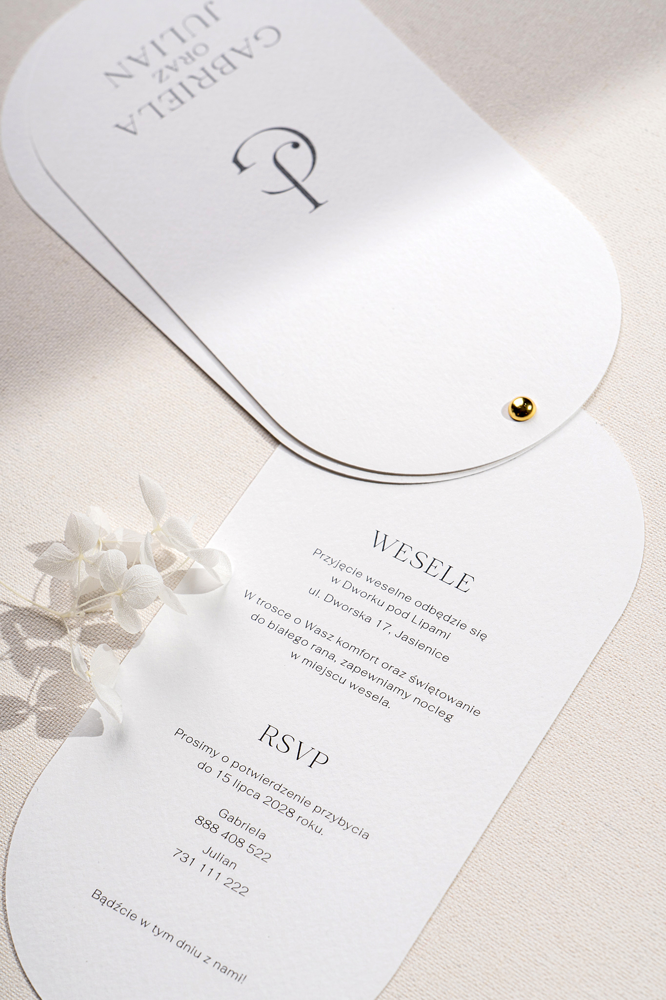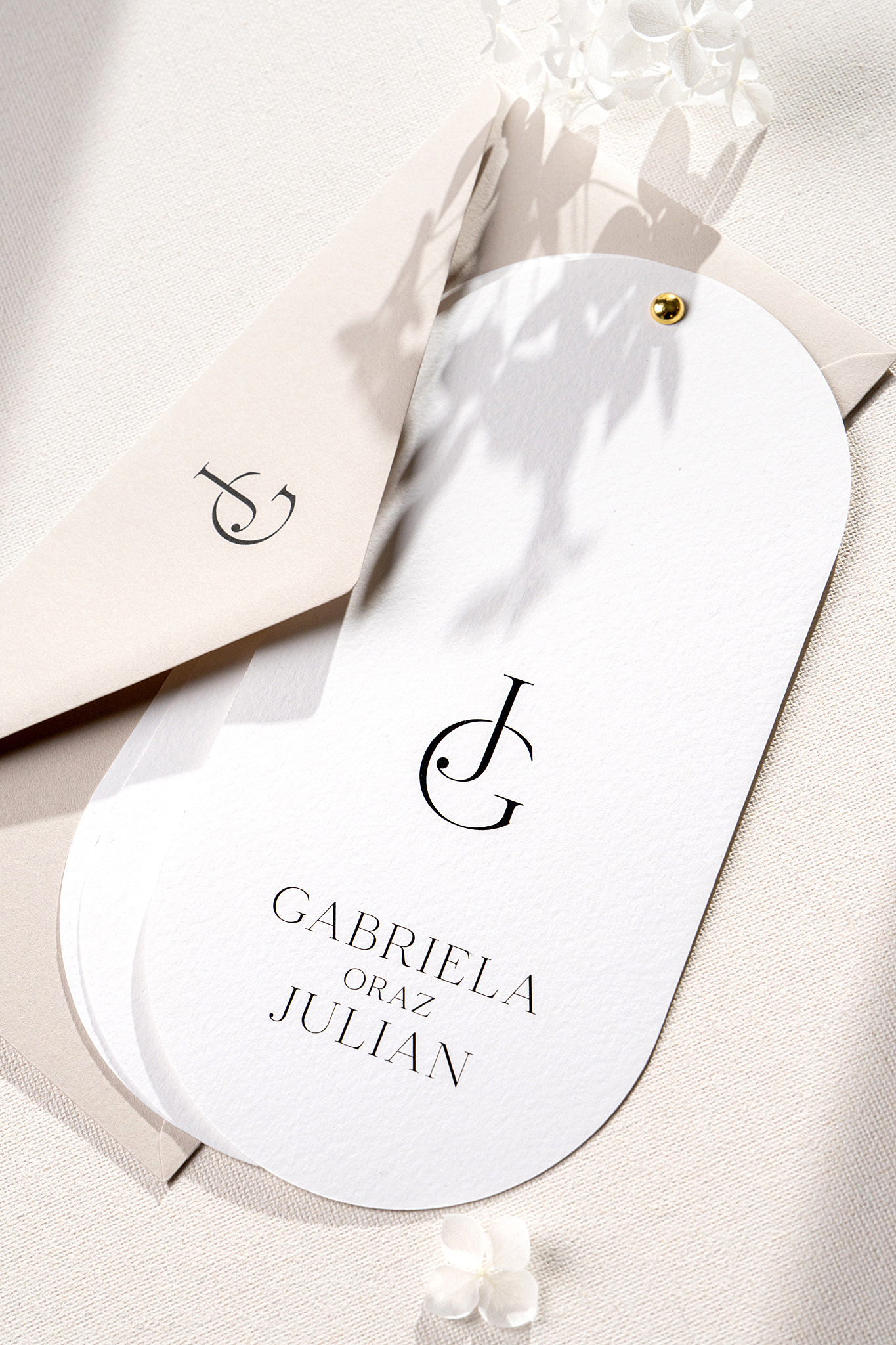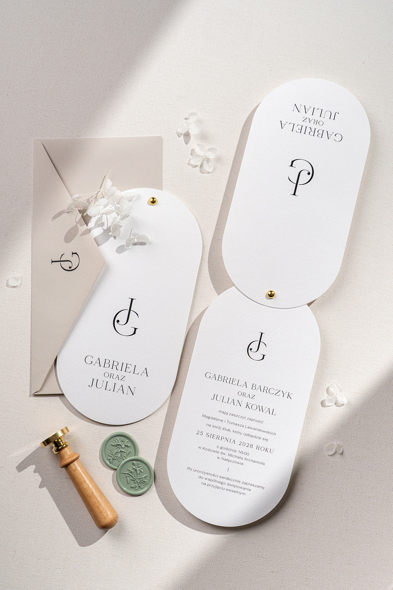 Każde zaproszenie składa się z trzech podłużnych, owalnych kart wykonanych z wysokiej jakości, naturalnego papieru o delikatnej, subtelnej fakturze przypominającej skórkę pomarańczy lub filc, w odcieniu naturalnej bieli – wyjątkowo szlachetnym.