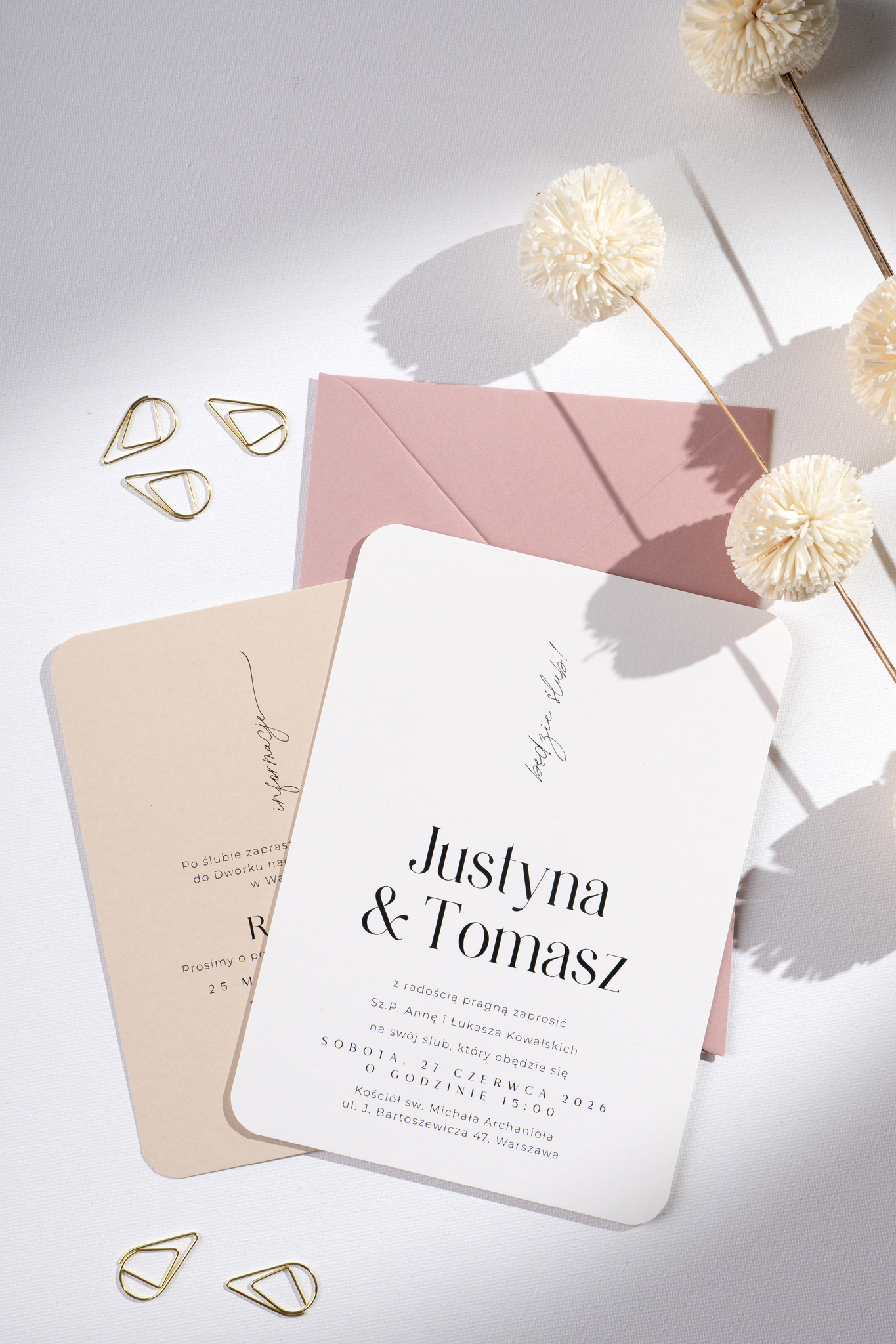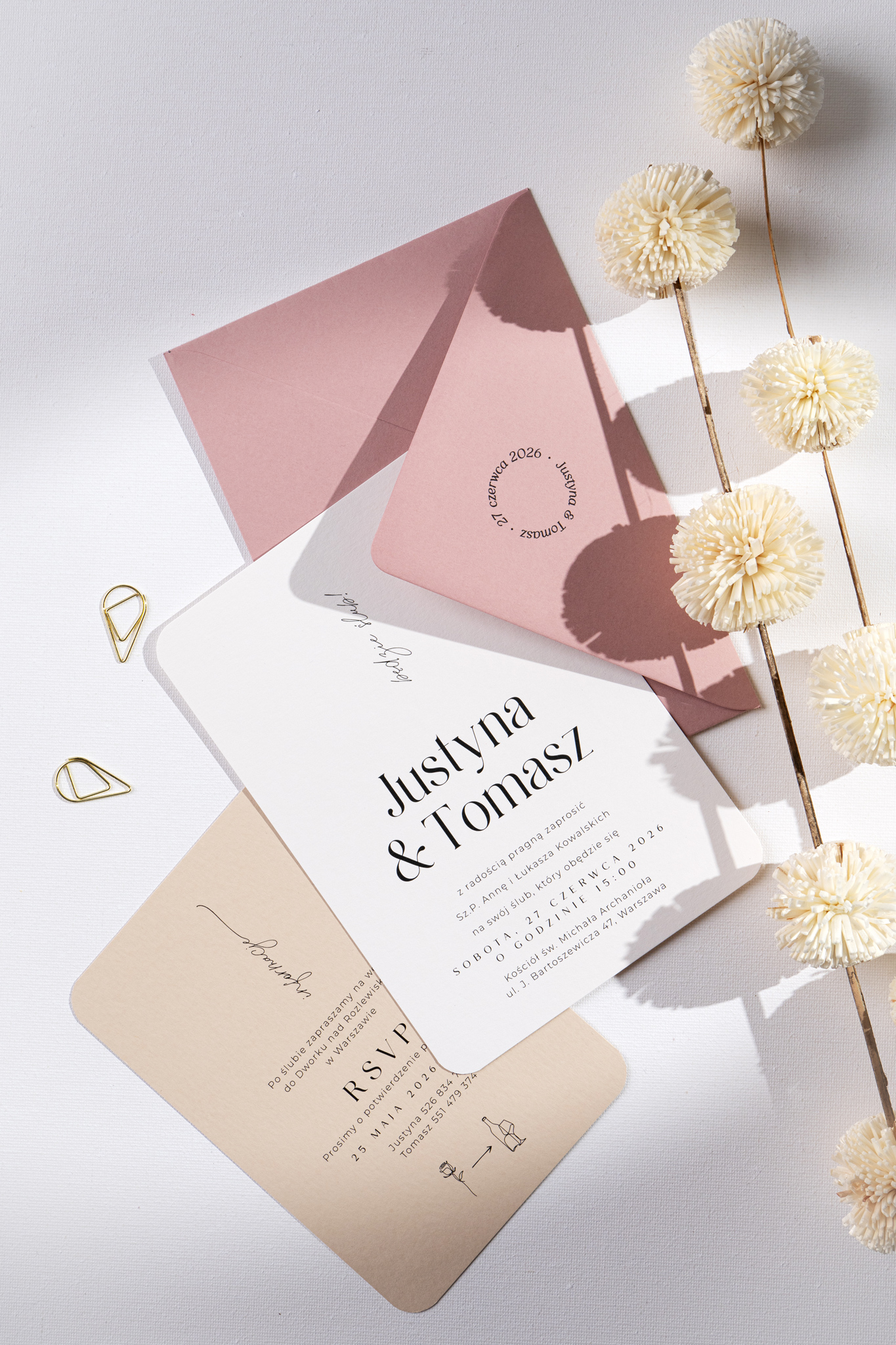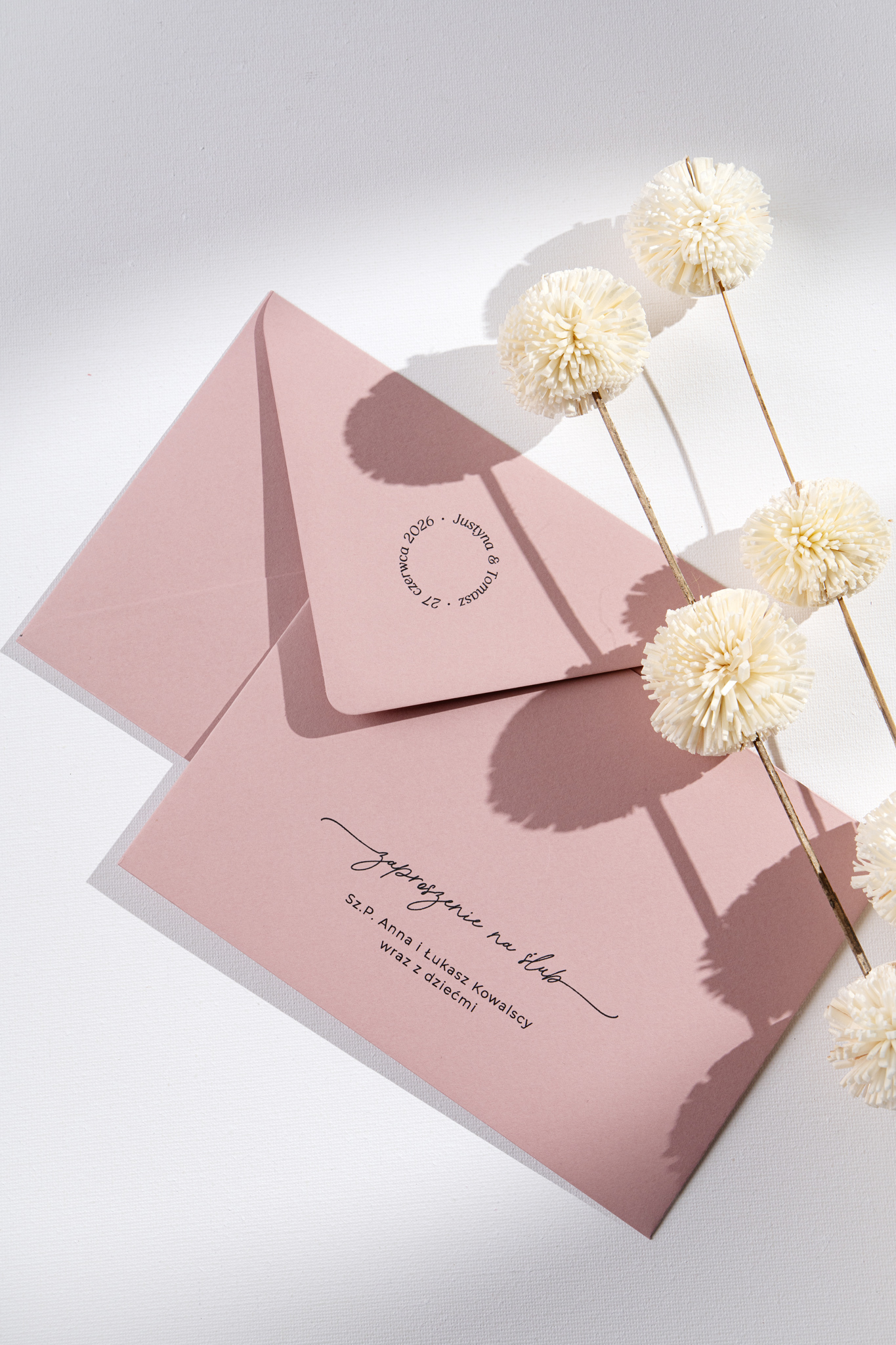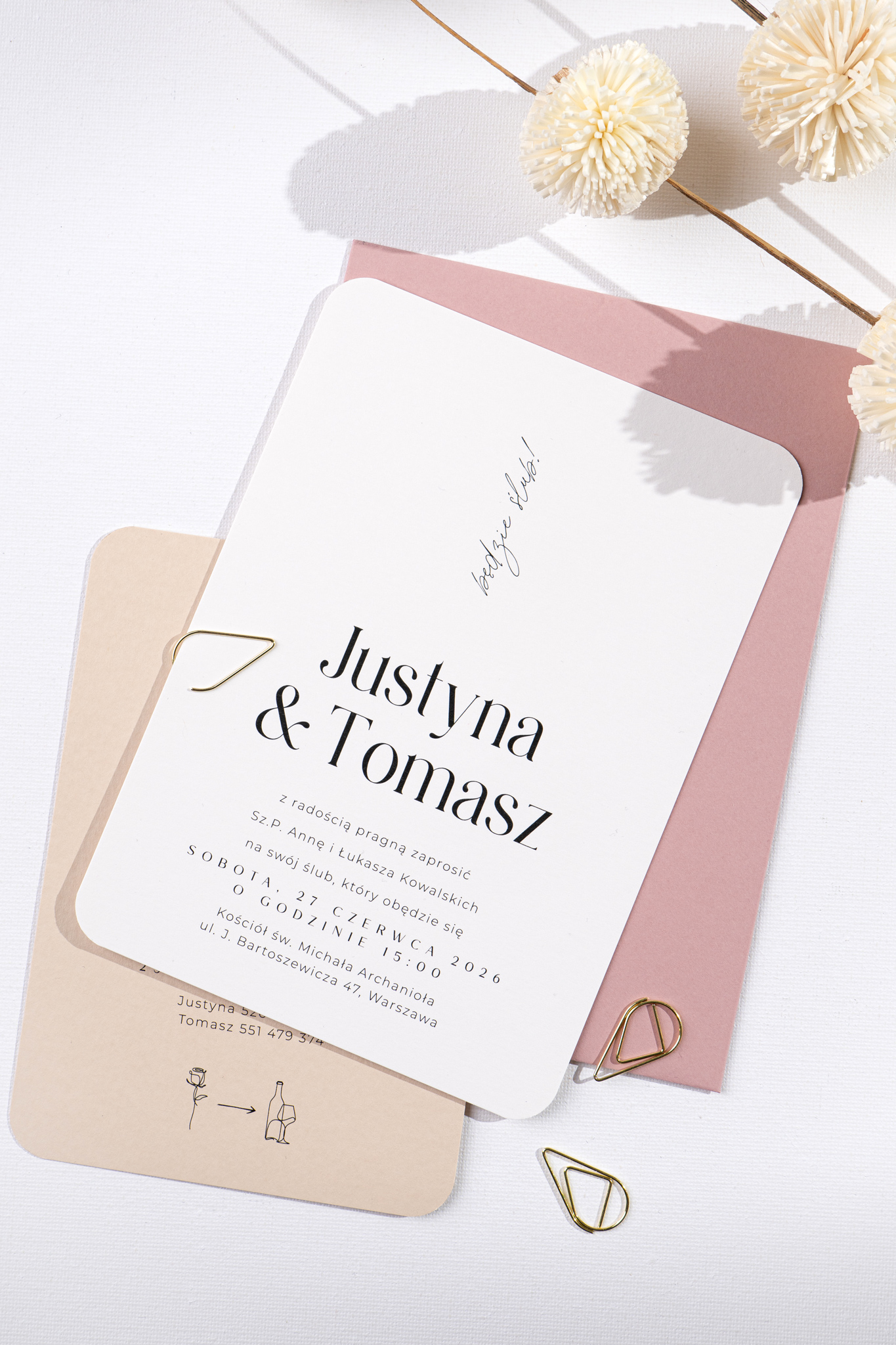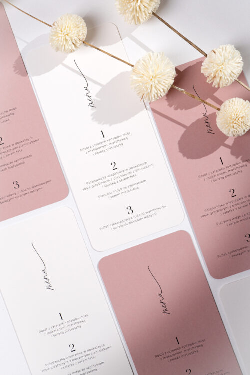 Delikatnie zaokrąglone rogi i współczesna typografia podkreślają nowoczesny charakter projektu. Całość dopełnia koperta w kolorze jasnego, brudnego różu – a dodatkową opcją jest nadruk na jej klapie, który może stać się eleganckim akcentem całej papeterii.