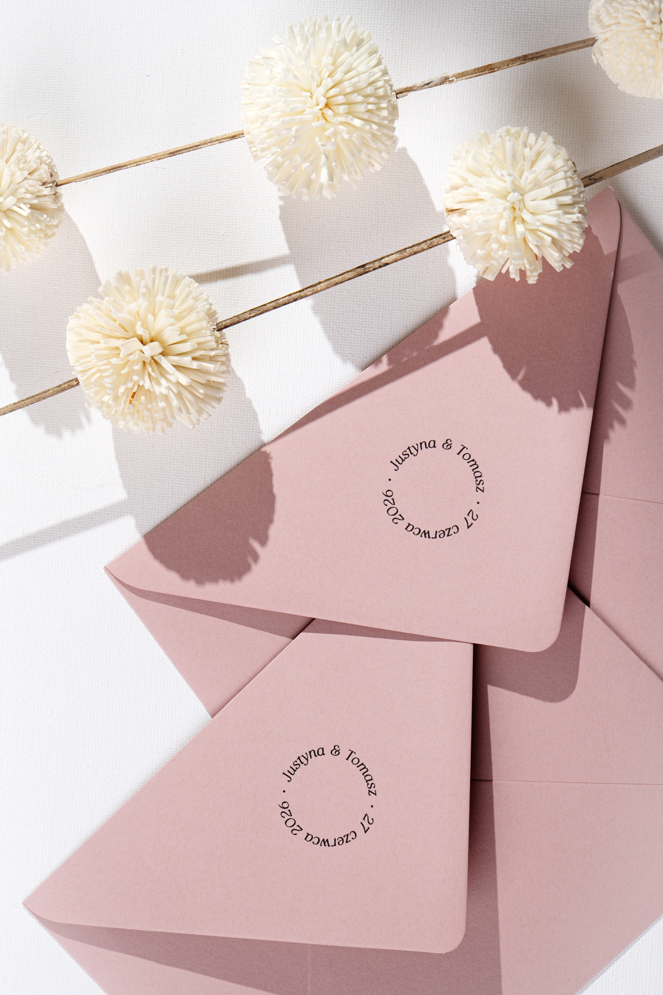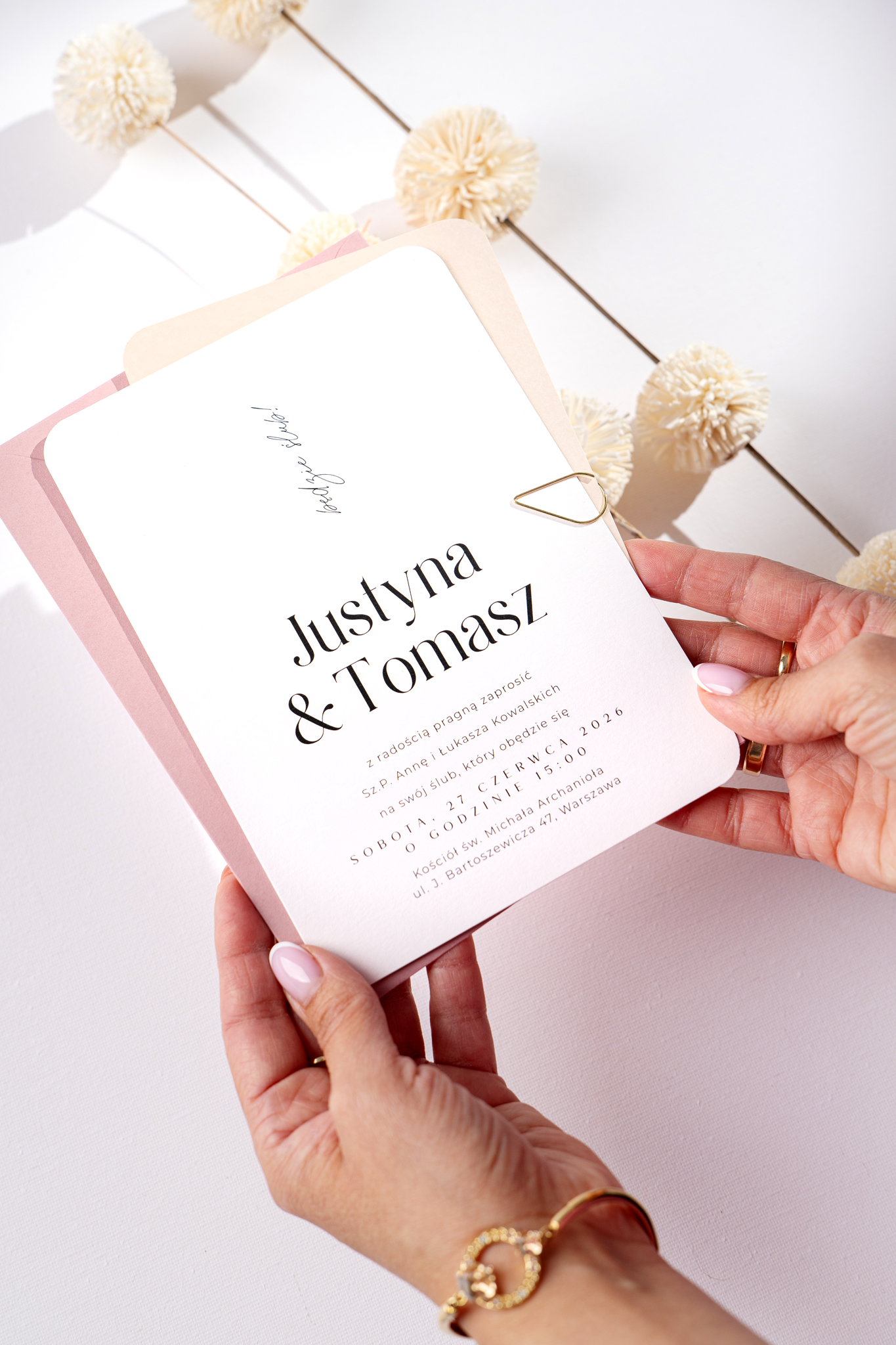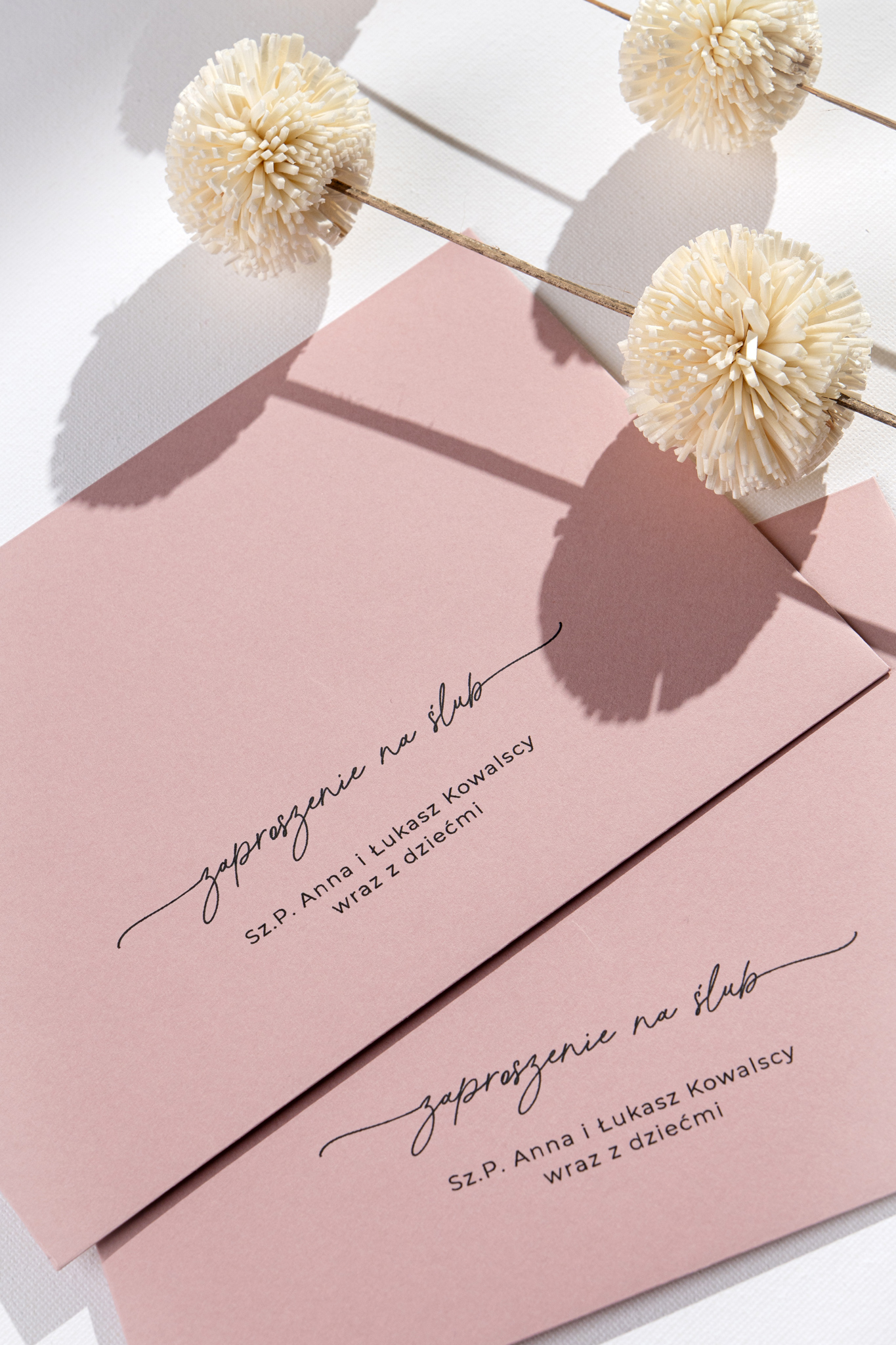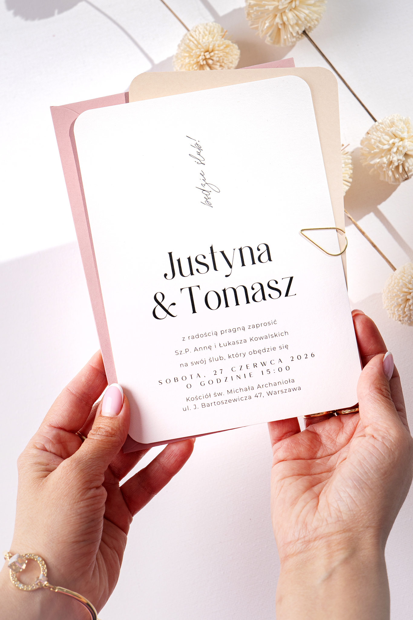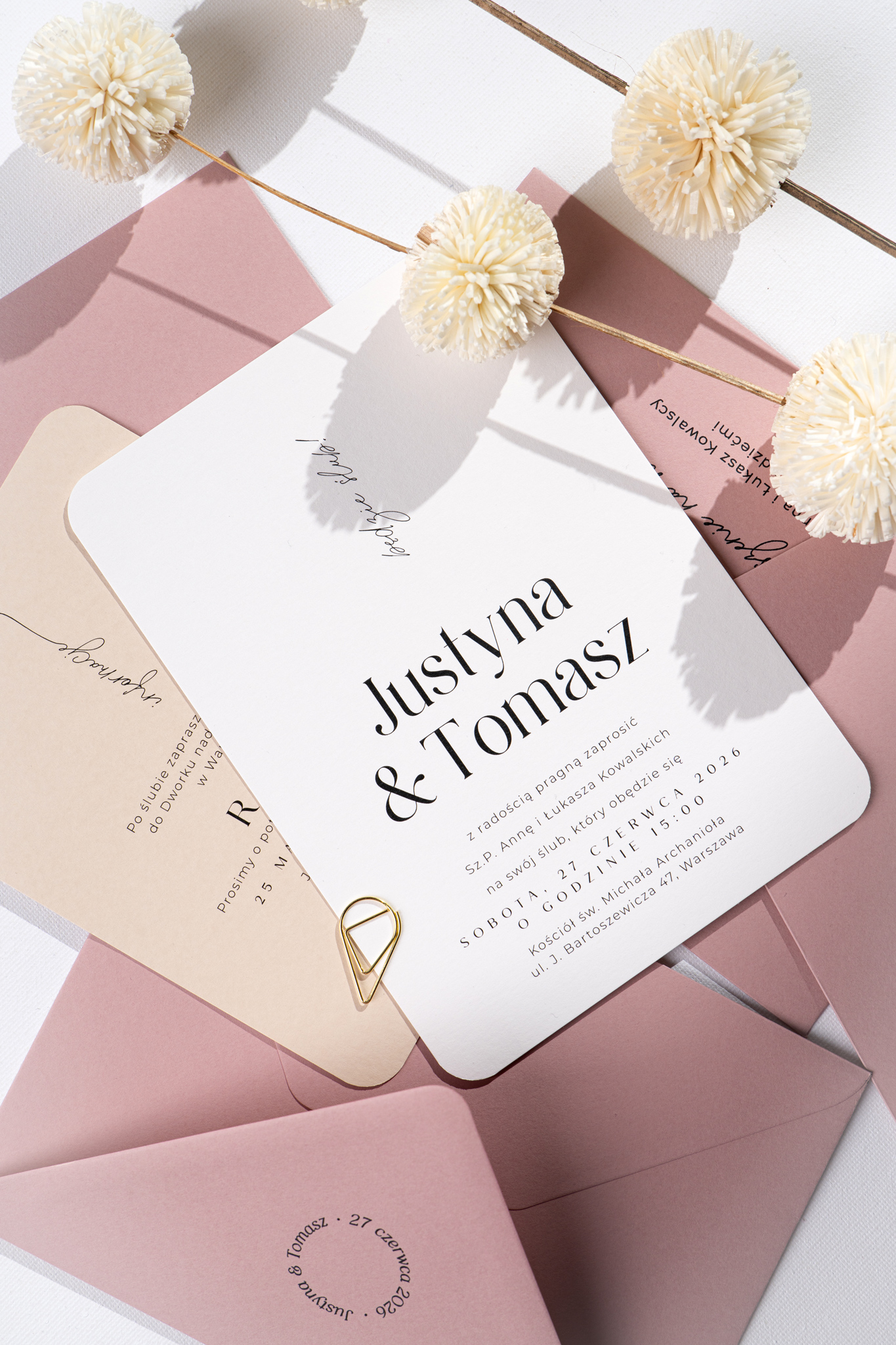 Delikatnie zaokrąglone rogi i współczesna typografia podkreślają nowoczesny charakter projektu. Całość dopełnia koperta w kolorze jasnego, brudnego różu – a dodatkową opcją jest nadruk na jej klapie, który może stać się eleganckim akcentem całej papeterii.