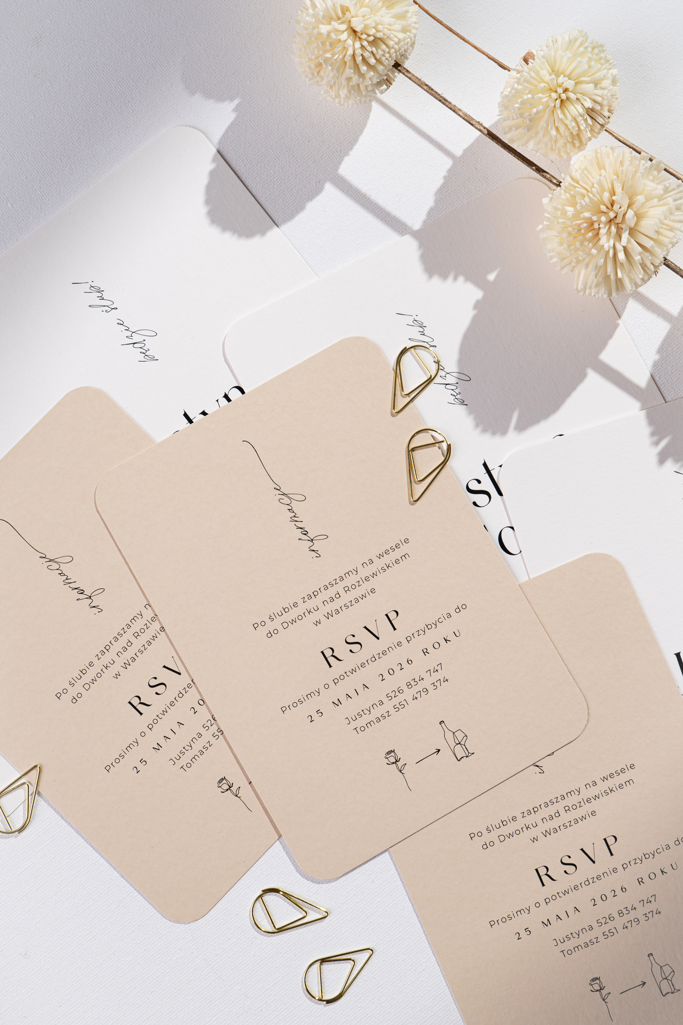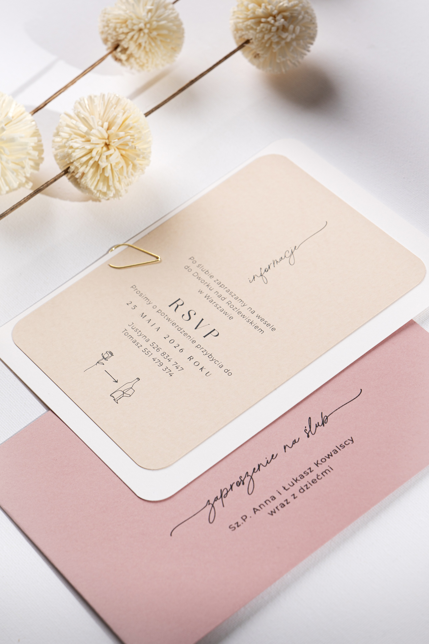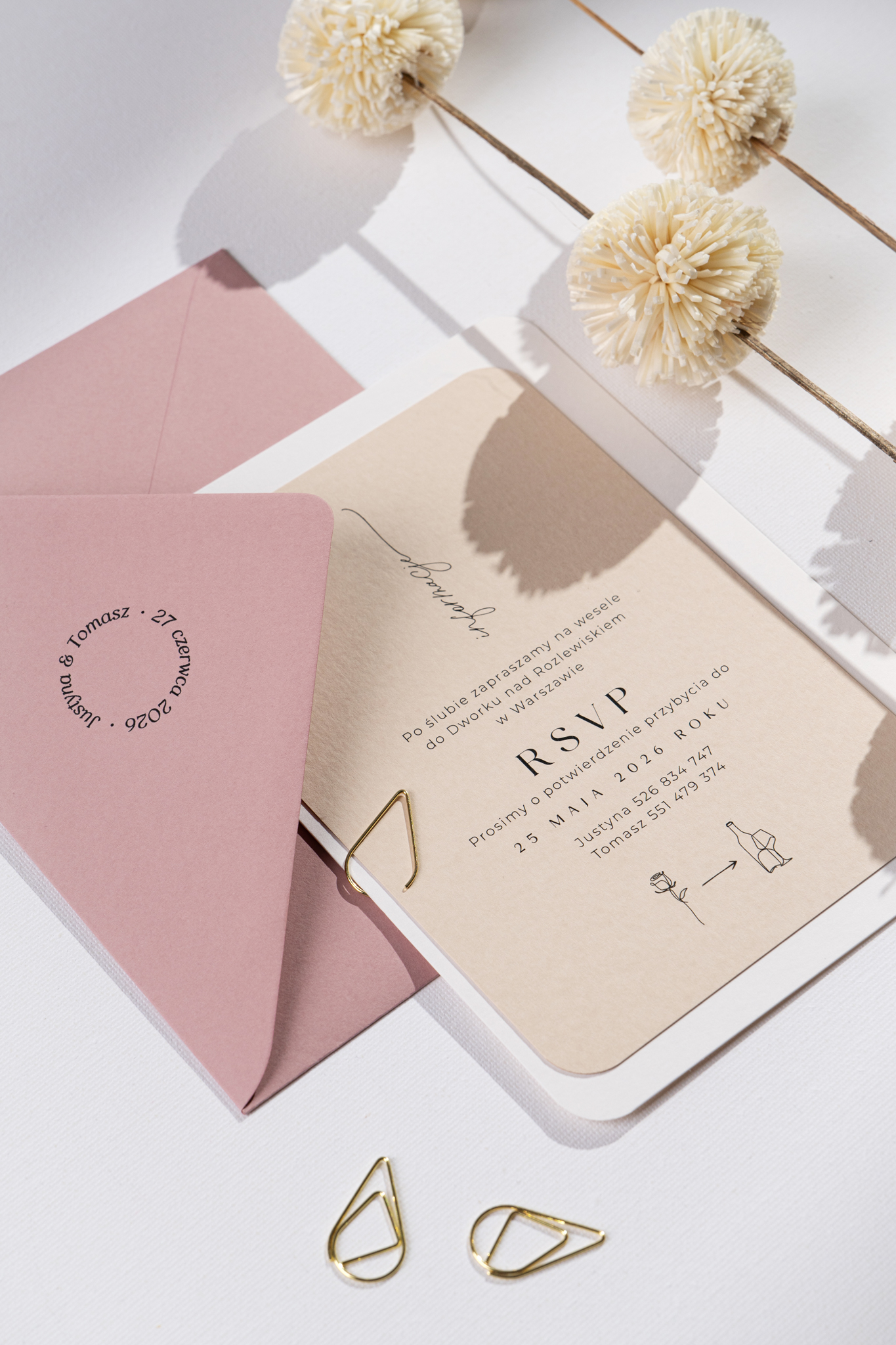 Zaproszenia ślubne Old Rose, czyli nowoczesna forma w romantycznej tonacji. Powstały dla Par, które kochają połączenie nowoczesnego minimalizmu z subtelną nutą romantyzmu. Zestaw składa się z dwóch kart – w kolorach beżu i złamanej bieli – wykonanych z wysokiej jakości, naturalnych papierów i spiętych ozdobnym, złotym spinaczem.