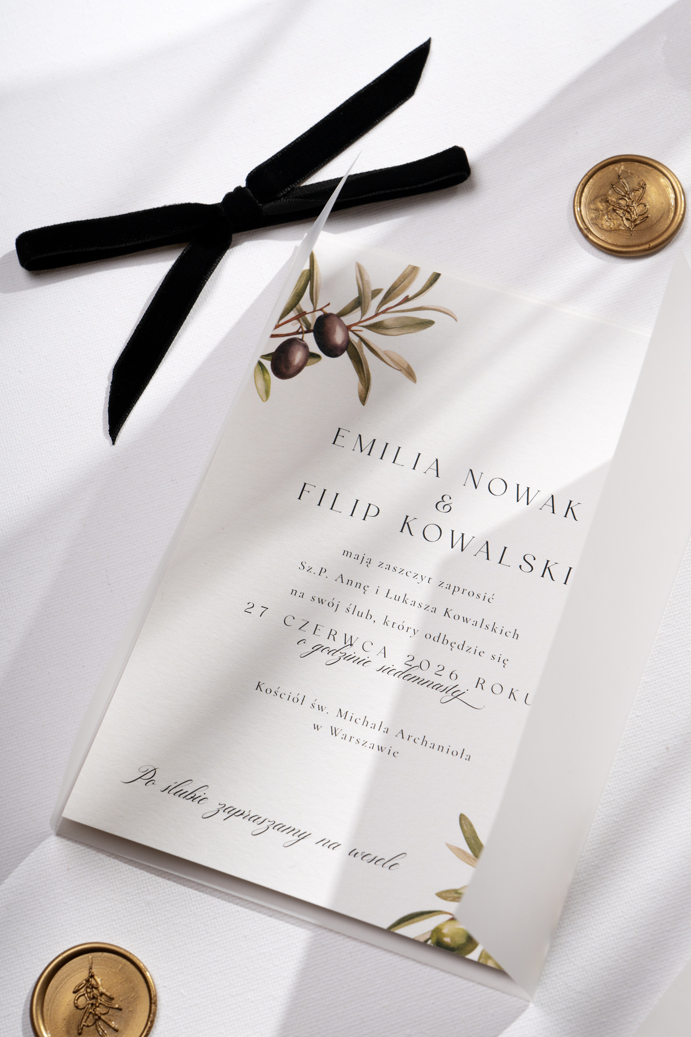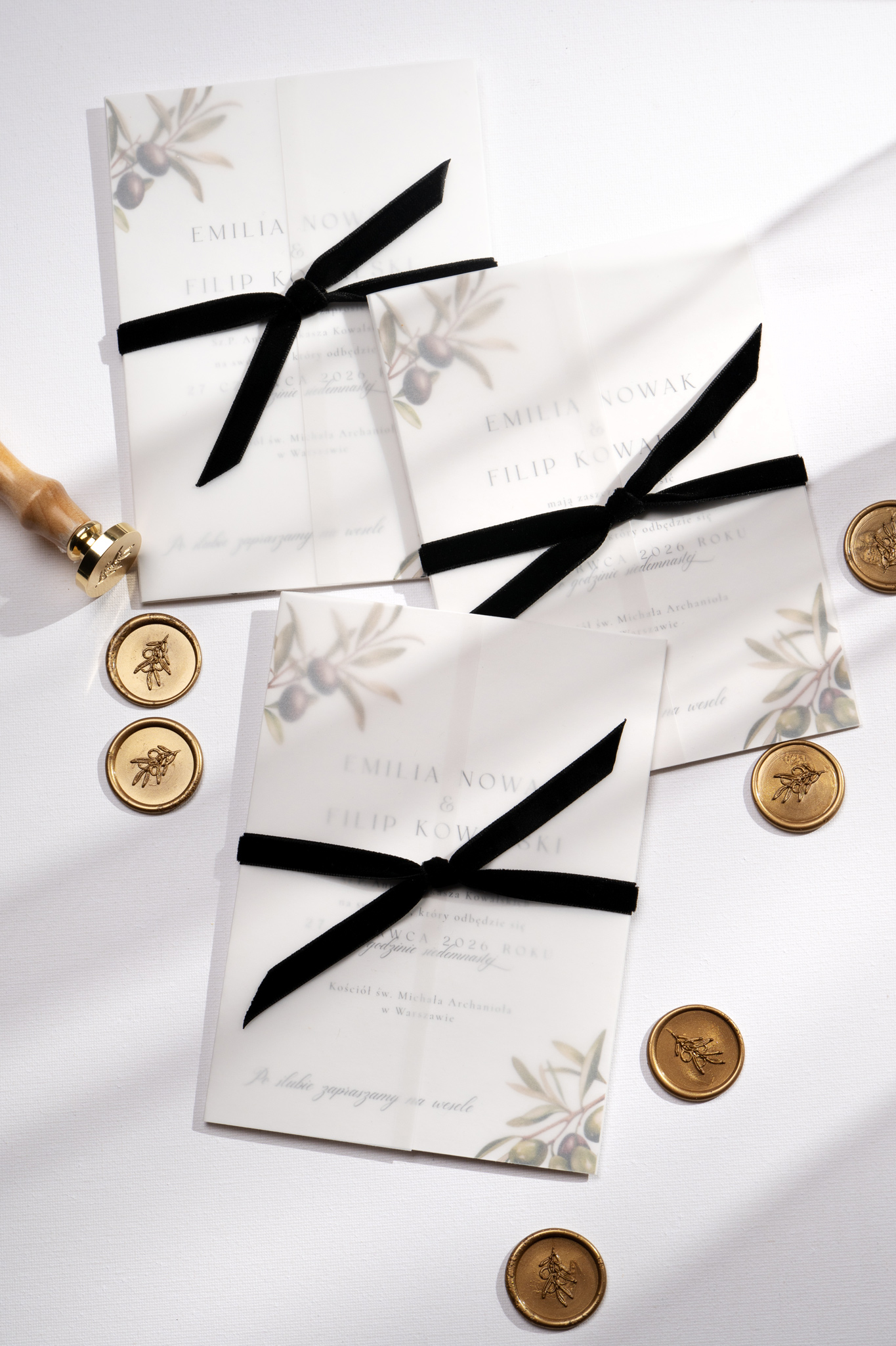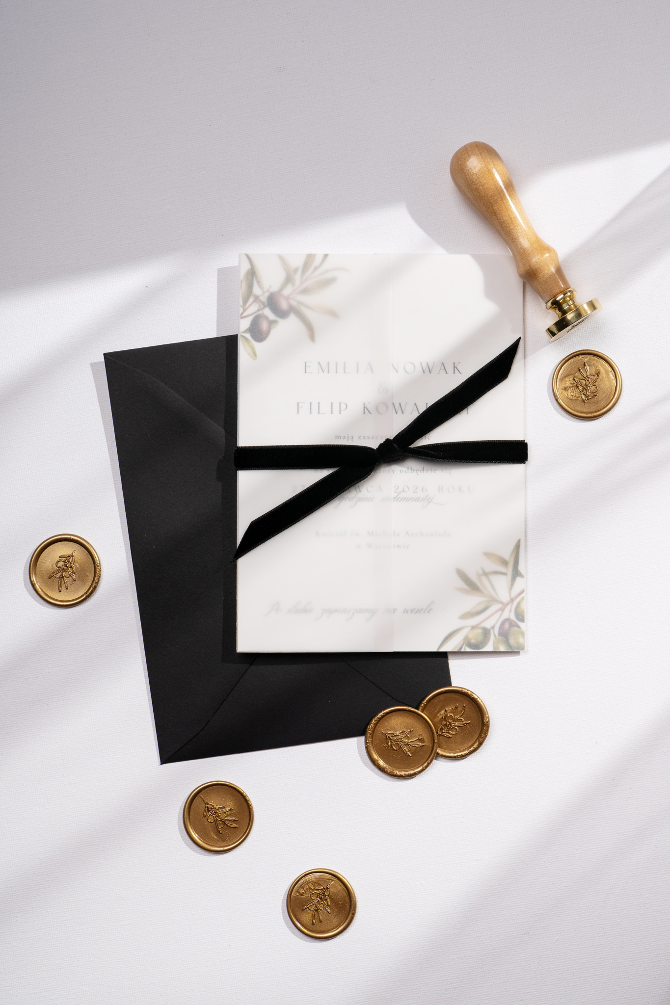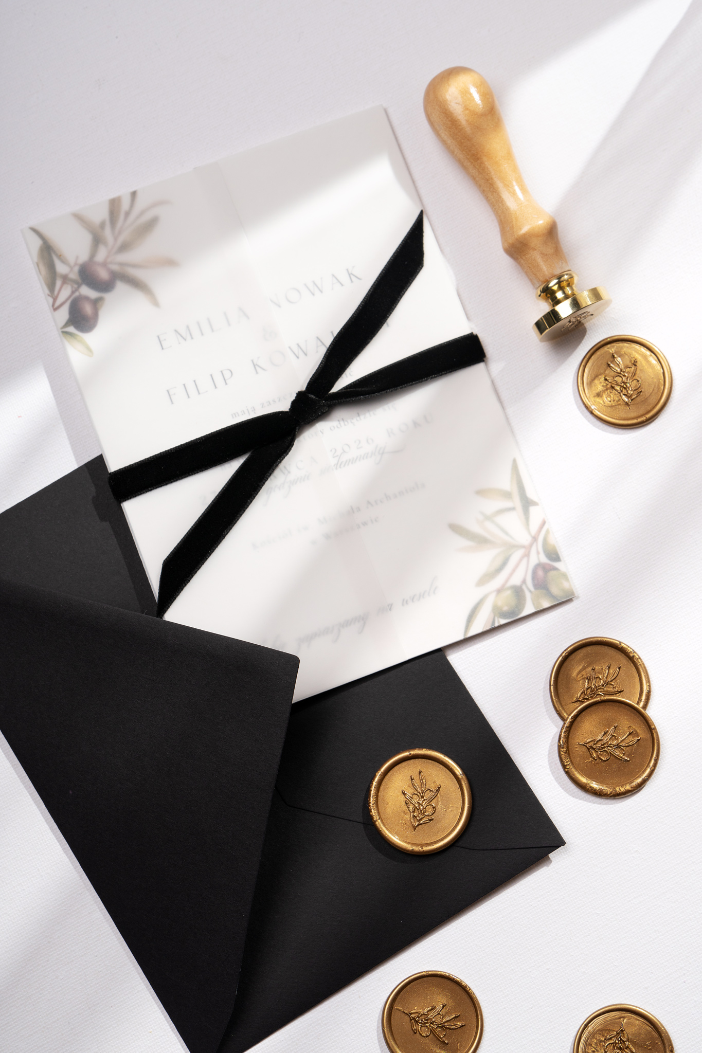 Zestaw składa się z dwóch kart z elegancką typografią, które dzięki czarnej kopercie zyskują nowoczesny i wyrazisty charakter. Dla Par pragnących dodać zaproszeniom niepowtarzalnego wykończenia dostępne są piękne dodatki takie jak transparentna obwoluta z kalki, czarna welurowa tasiemka oraz złoty stempel lakowy z motywem oliwki.