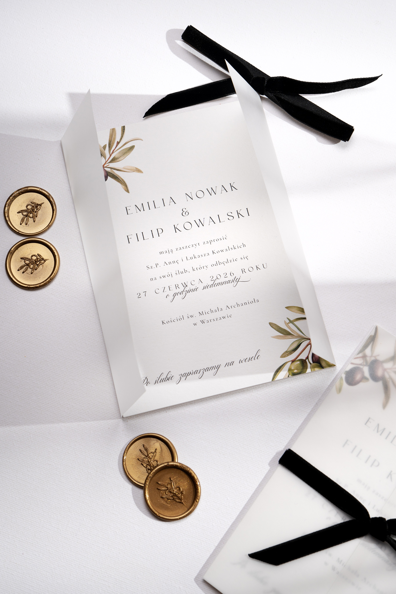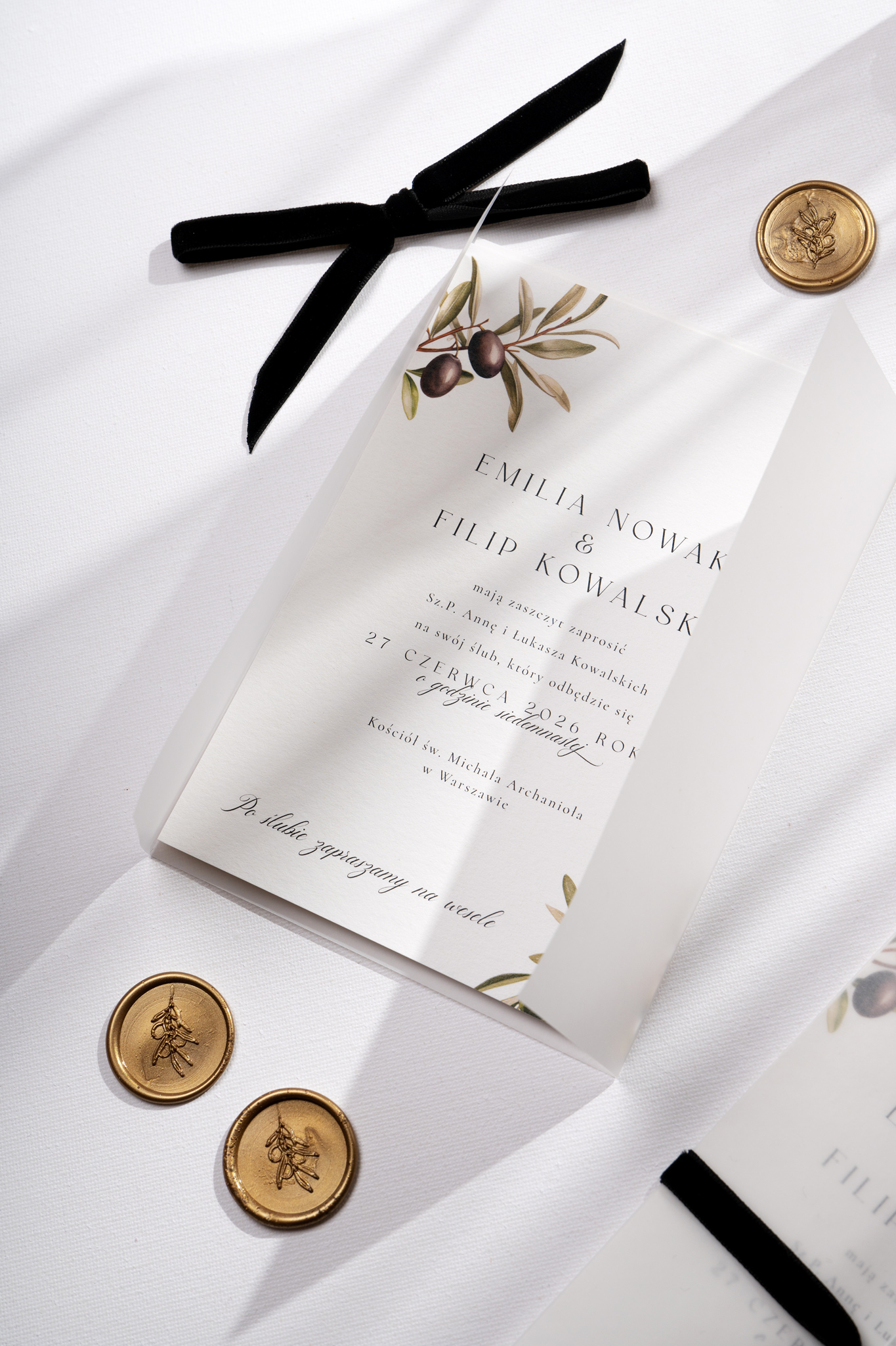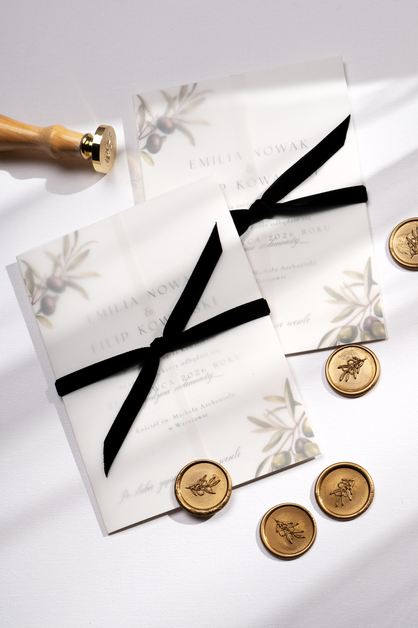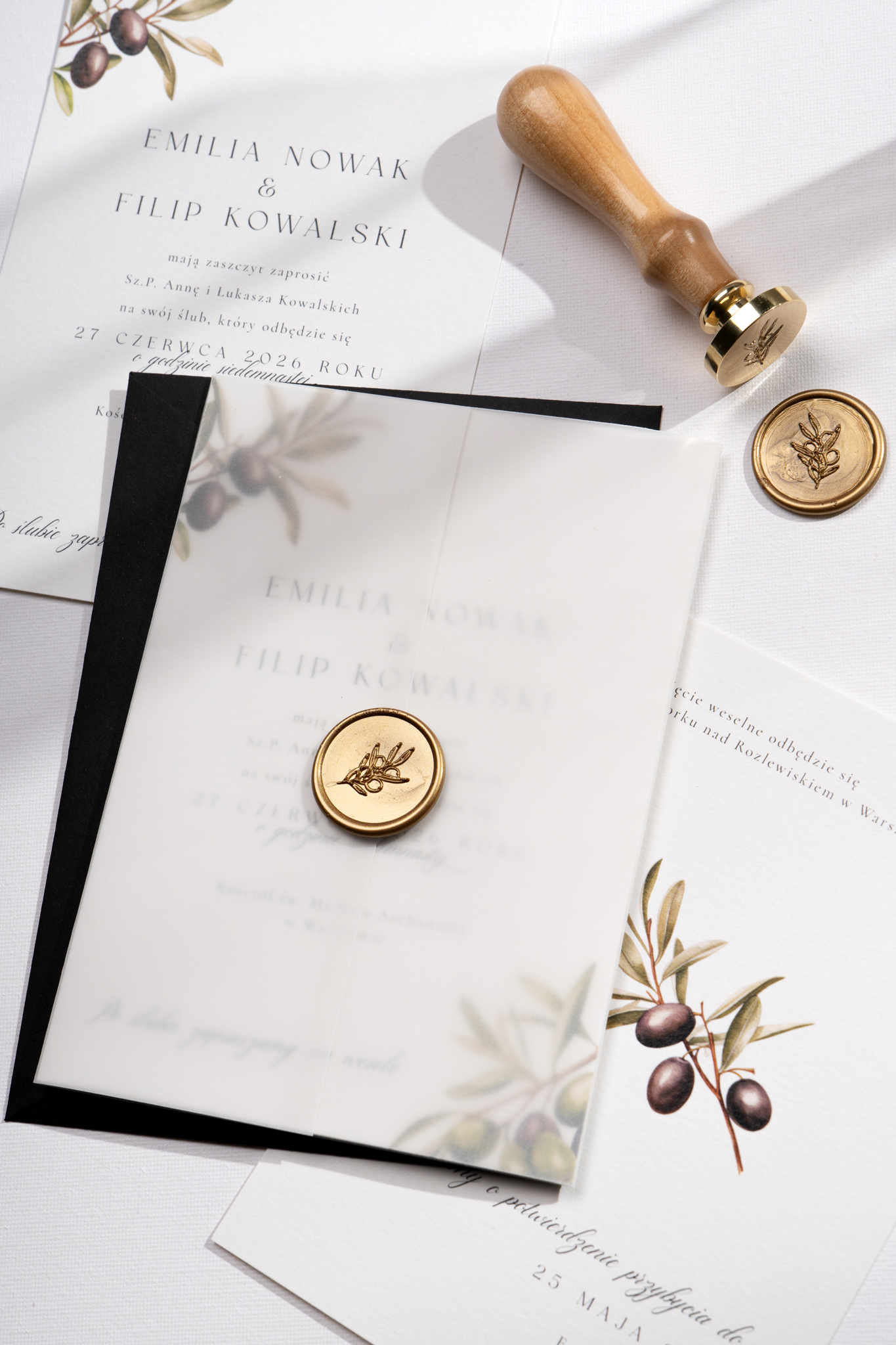 Zestaw składa się z dwóch kart z elegancką typografią, które dzięki czarnej kopercie zyskują nowoczesny i wyrazisty charakter. Dla Par pragnących dodać zaproszeniom niepowtarzalnego wykończenia dostępne są piękne dodatki takie jak transparentna obwoluta z kalki, czarna welurowa tasiemka oraz złoty stempel lakowy z motywem oliwki.