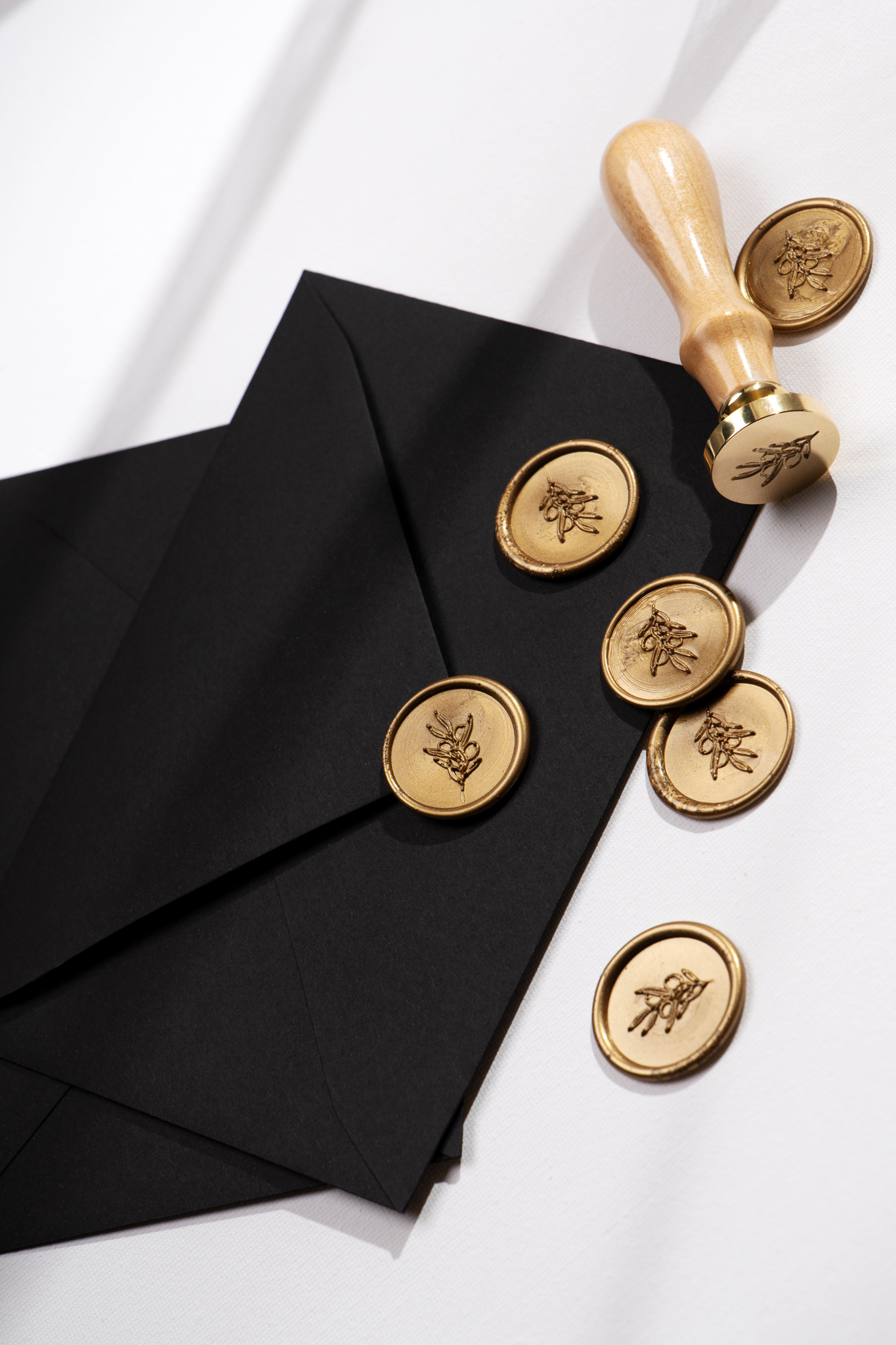 Stemple lakowe dołączamy osobno – każdy ma pod spodem dwustronnie klejące kółeczko, dzięki czemu łatwo go samodzielnie przykleić do zaproszenia.