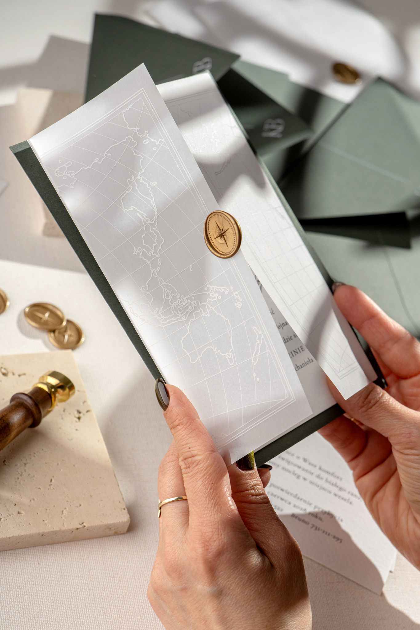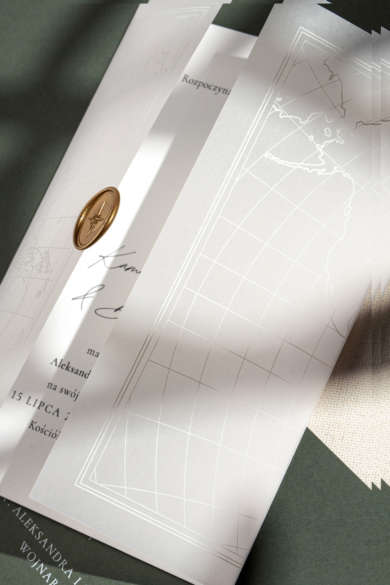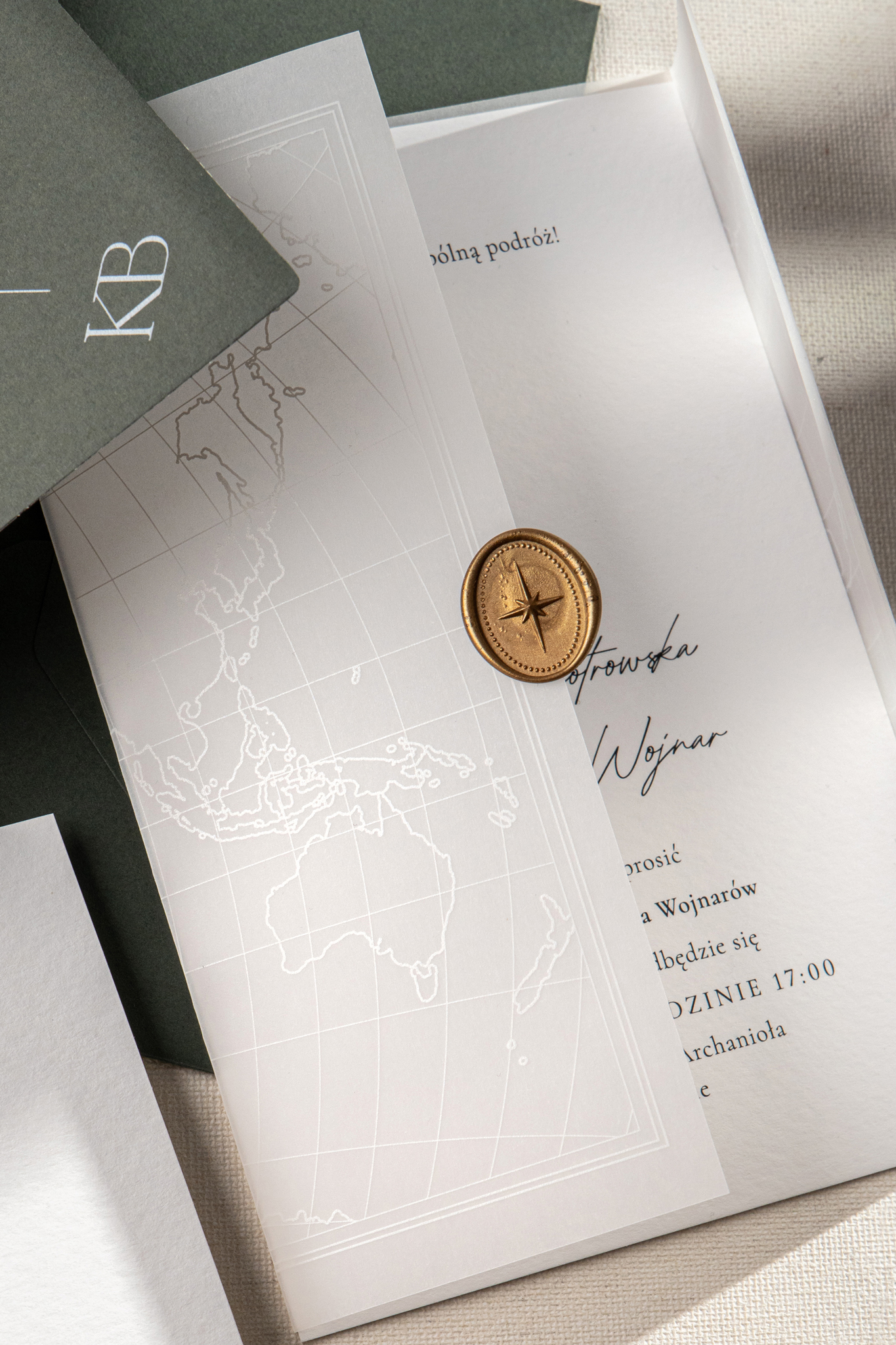 Obwoluta zamykana jest złotym, mini stemplem lakowym z symbolem gwiazdy północy – eleganckim detalem o symbolicznym znaczeniu. Zaproszenia pięknie dopełnia koperta w kolorze ciemnej zieleni. Kolorystykę możemy jednak oczywiście dopasować do Waszych preferencji – wystarczy się z nami skontaktować.