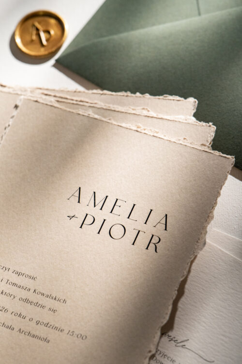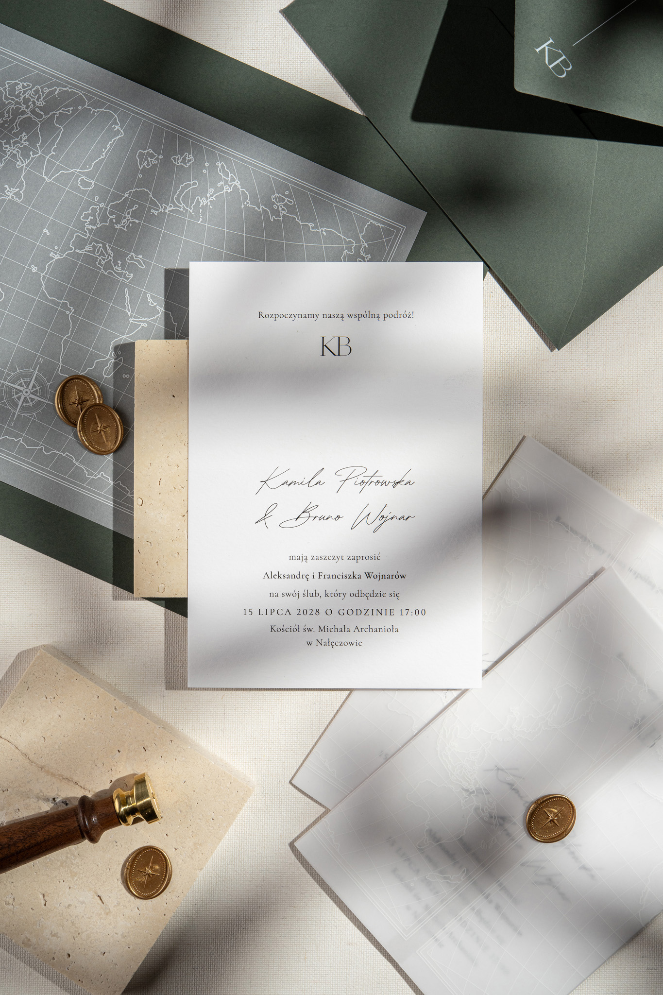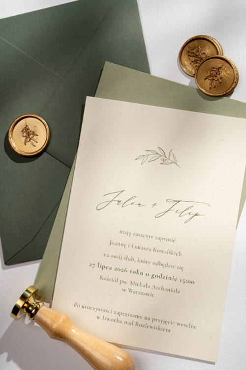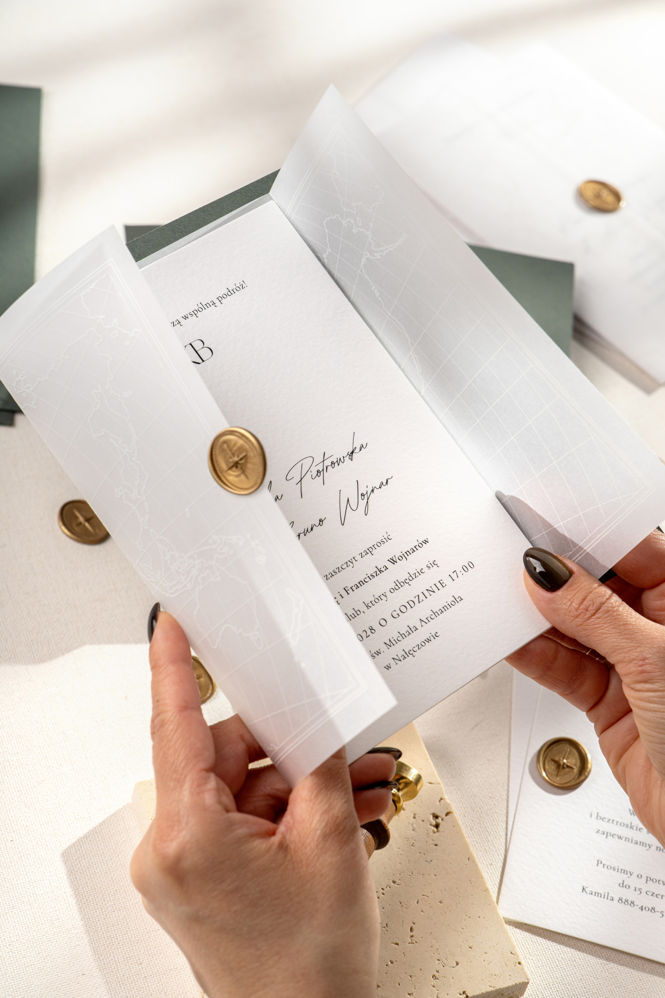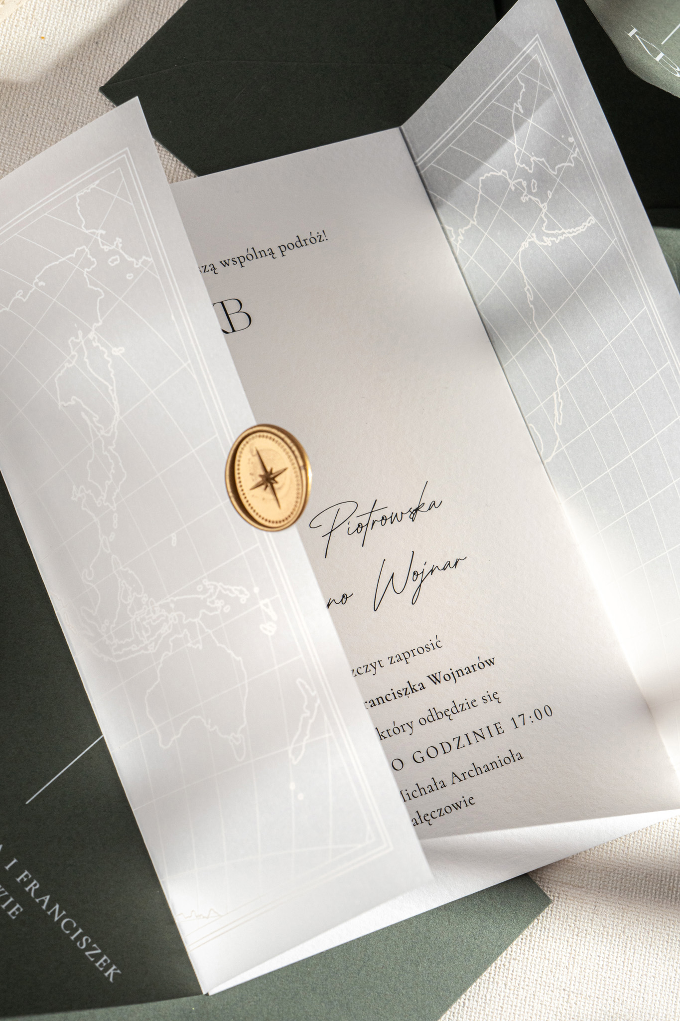 Obwoluta zamykana jest złotym, mini stemplem lakowym z symbolem gwiazdy północy – eleganckim detalem o symbolicznym znaczeniu. Zaproszenia pięknie dopełnia koperta w kolorze ciemnej zieleni. Kolorystykę możemy jednak oczywiście dopasować do Waszych preferencji – wystarczy się z nami skontaktować.