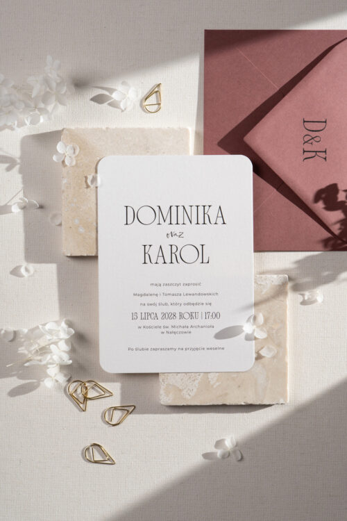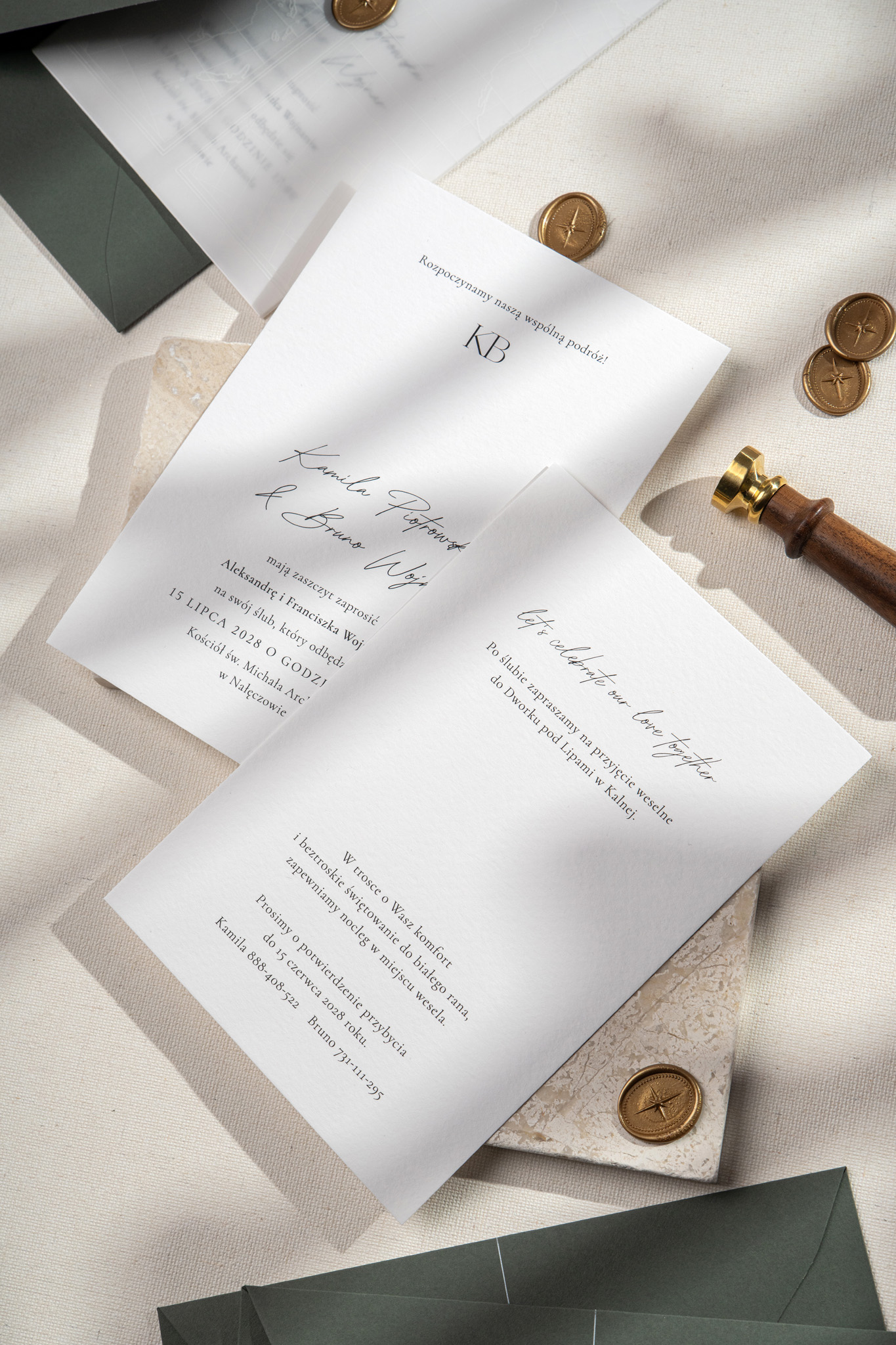 Zaproszenie składa się z dwóch kart wykonanych z wysokiej jakości, fakturowanego papieru w odcieniu naturalnej bieli. Szlachetna struktura papieru podkreśla elegancję projektu i doskonale współgra z nowoczesną typografią. Osobistym akcentem są inicjały pary młodej, które nadają całości indywidualnego charakteru.