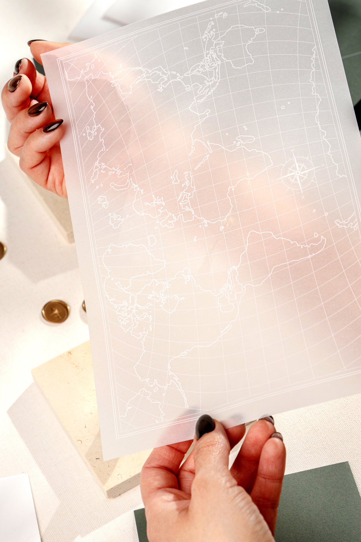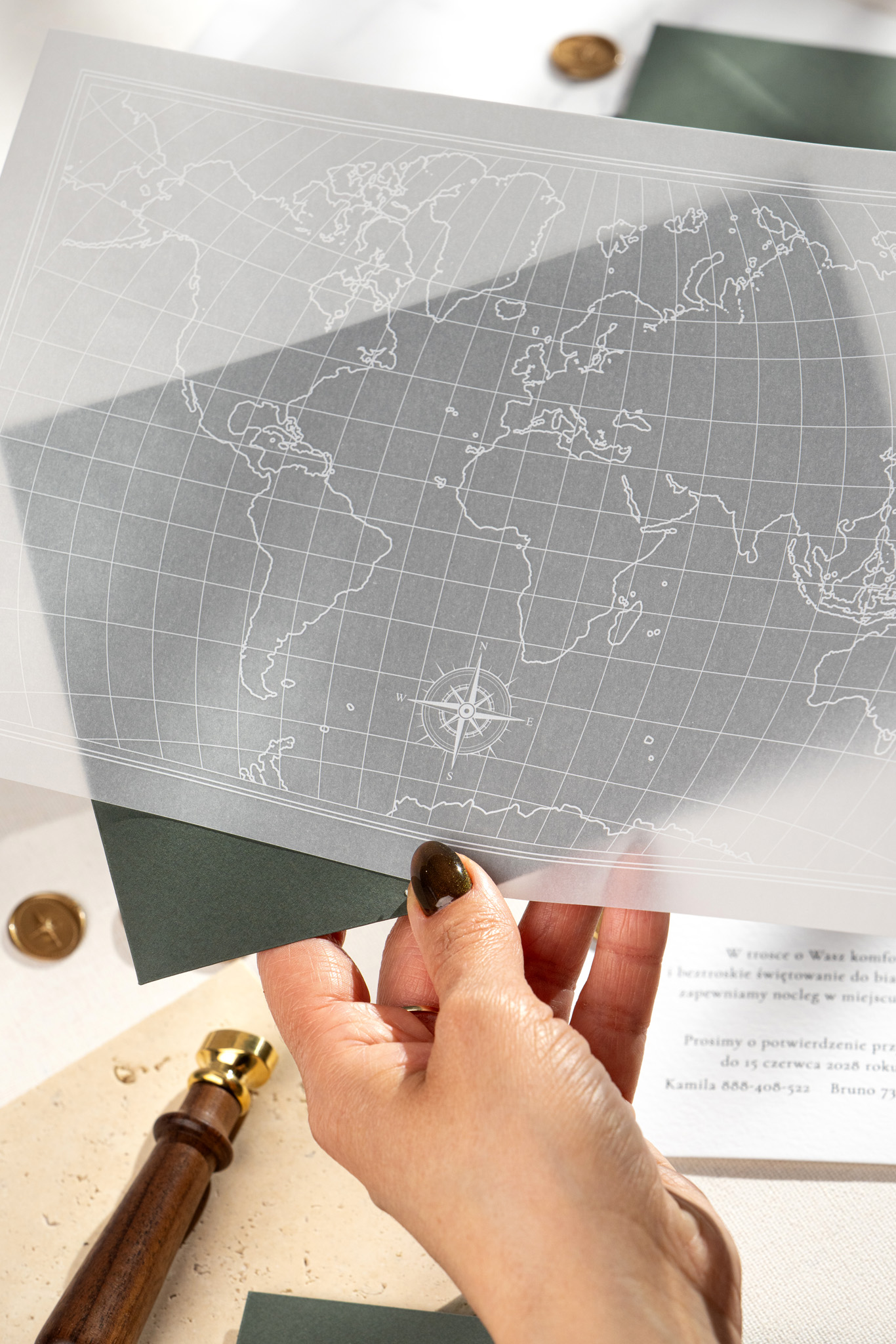 Głównym elementem wyróżniającym kolekcję jest półtransparentna obwoluta z kalki. Nadrukowana subtelnie konturowa mapa świata stanowi delikatny, podróżniczy motyw, który nie dominuje projektu, a jedynie go dopełnia.