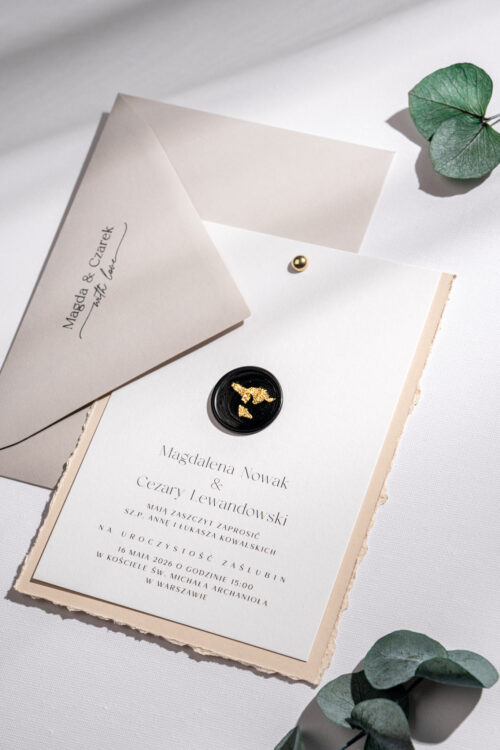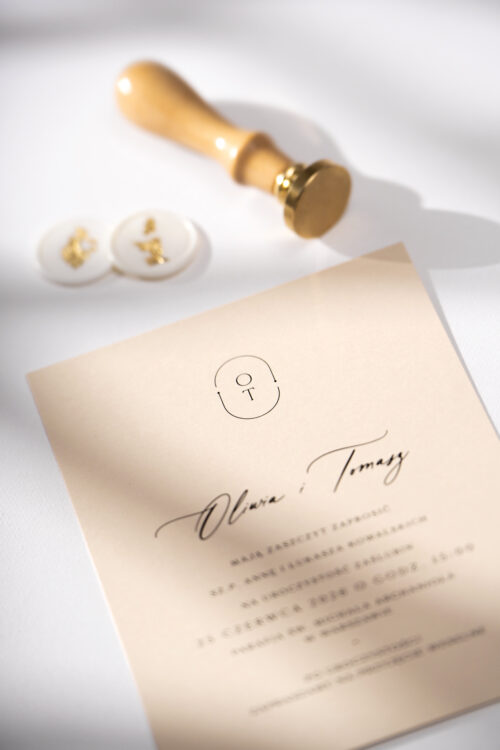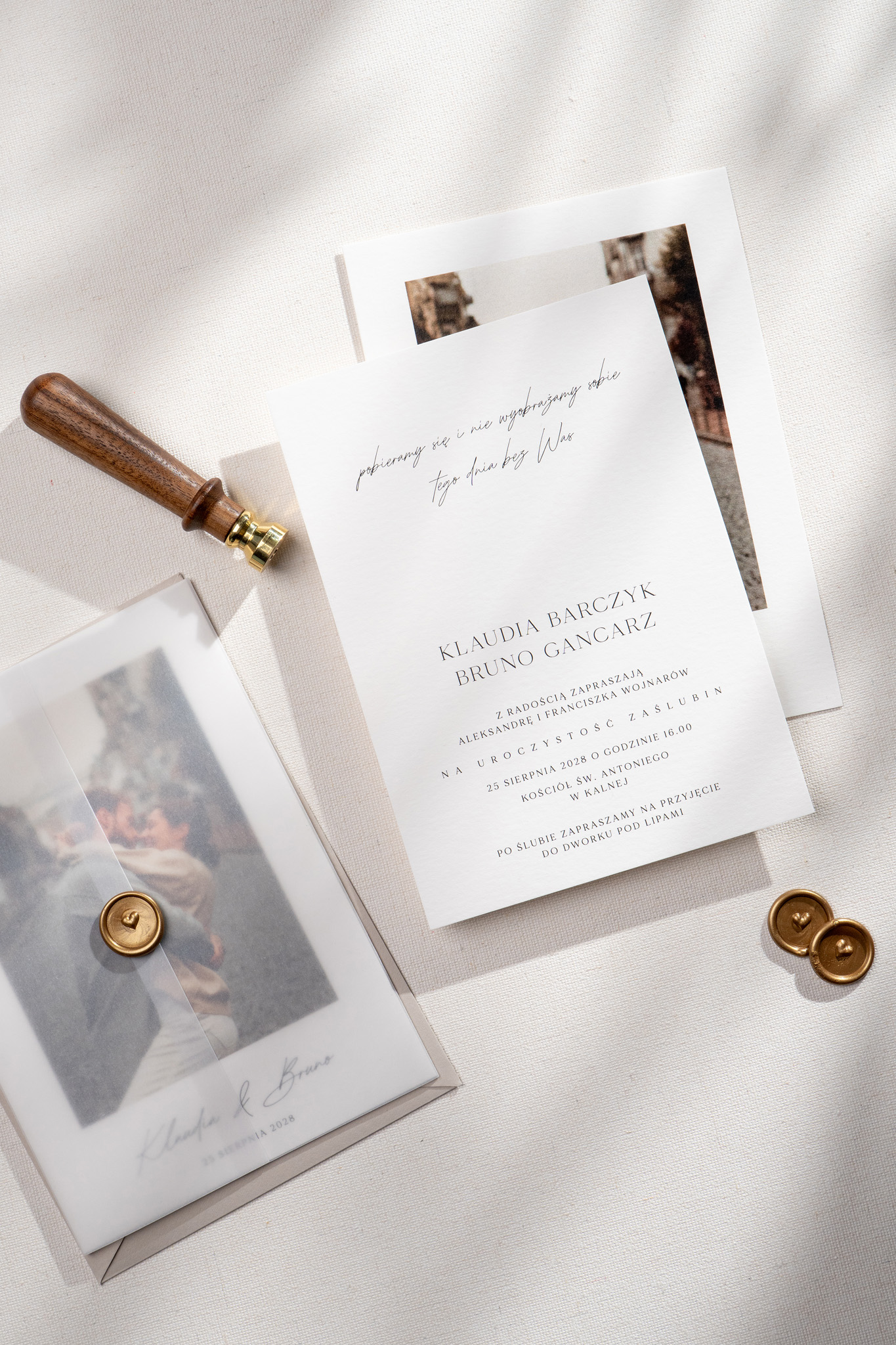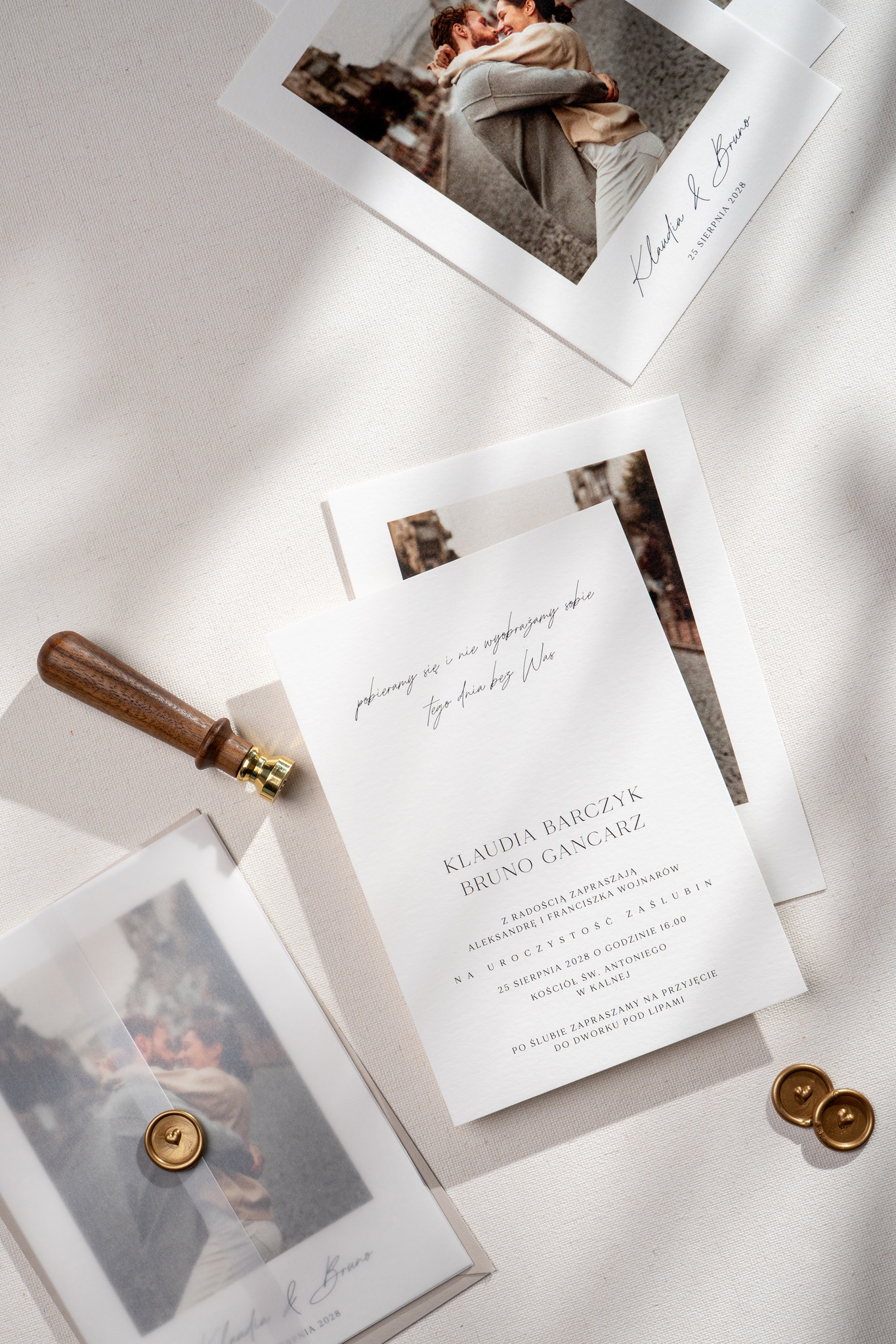 Treść zaproszenia rozmieszczona została na głównej karcie oraz z tyłu zdjęcia – utrzymana w nowoczesnej typografii i modnych fontach, które podkreślają współczesny, a zarazem romantyczny styl projektu. Obie karty spaja delikatna obwoluta z półprzezroczystej kalki, zamknięta złotym mini stemplem lakowym z motywem serduszka – detalem, który dodaje całości uroku i wyjątkowości. Stemple umieścić można również na kopertach.