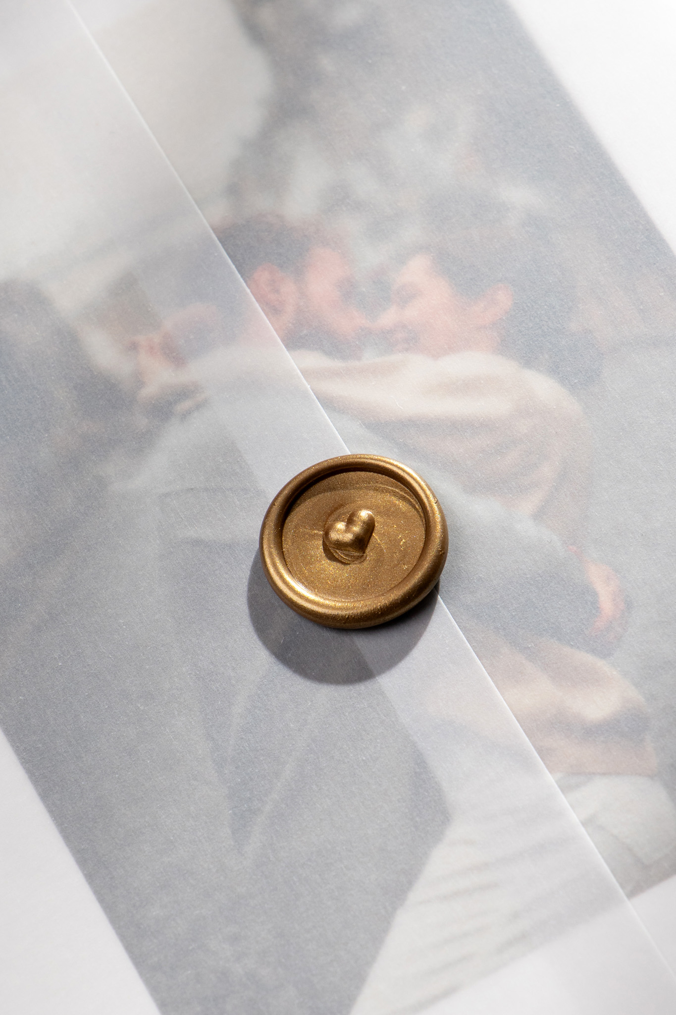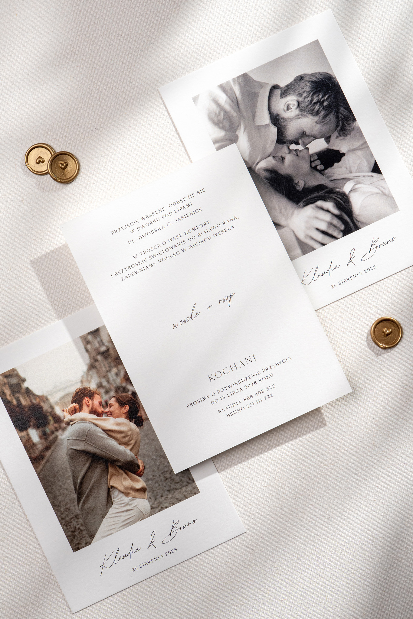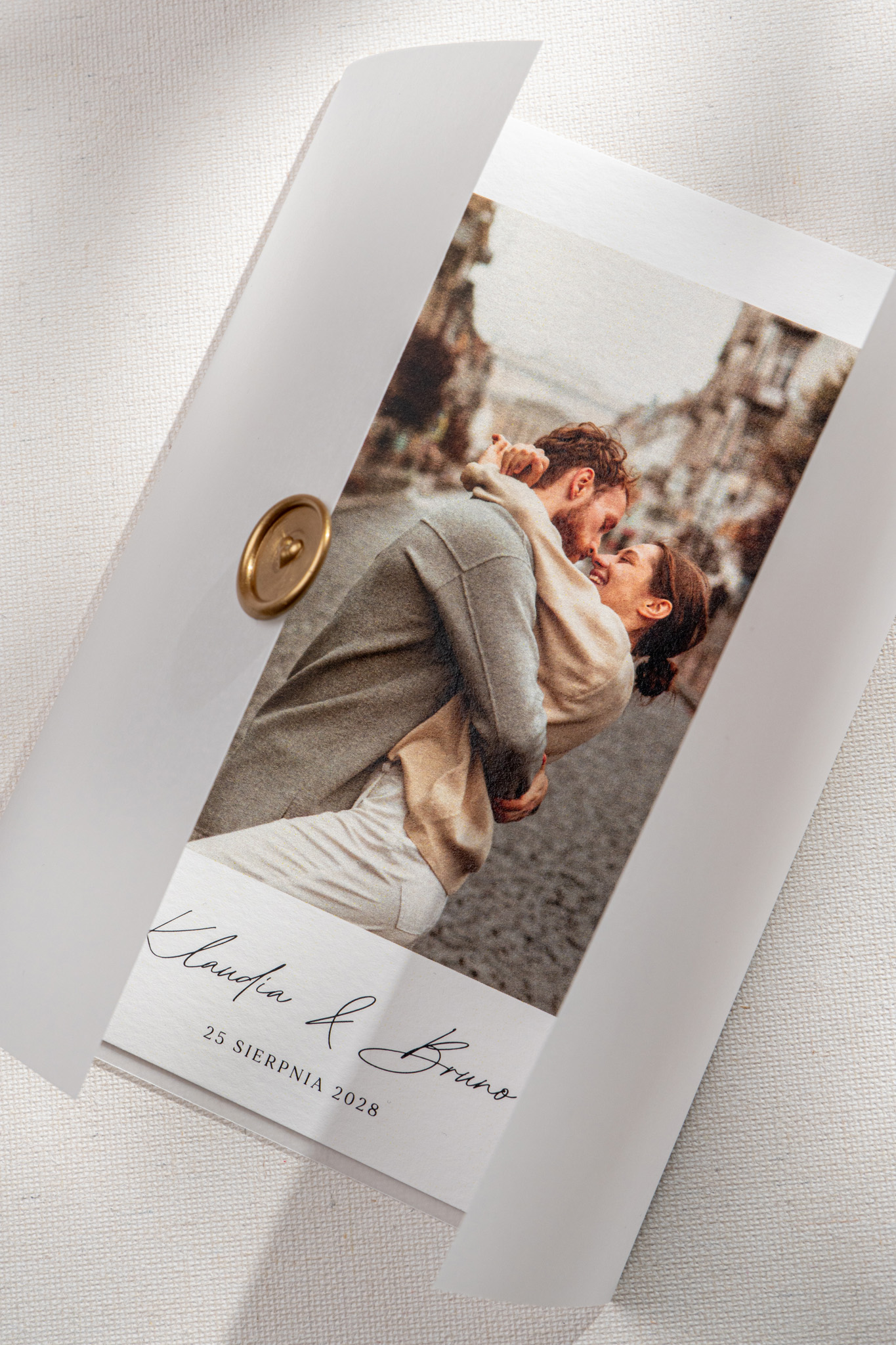 Treść zaproszenia rozmieszczona została na głównej karcie oraz z tyłu zdjęcia – utrzymana w nowoczesnej typografii i modnych fontach, które podkreślają współczesny, a zarazem romantyczny styl projektu. Obie karty spaja delikatna obwoluta z półprzezroczystej kalki, zamknięta złotym mini stemplem lakowym z motywem serduszka – detalem, który dodaje całości uroku i wyjątkowości. Stemple umieścić można również na kopertach.
