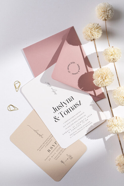Całość uzupełnia elegancka koperta dostępna w trzech kolorach: grey beige, off white (o subtelnej fakturze) oraz ciemnym, brudnym różu. Istnieje również możliwość dopasowania kolorystyki do indywidualnych preferencji lub charakteru przyjęcia. Zaproszenie stworzone z myślą o tych, którzy cenią minimalistyczne formy, nowoczesny design i osobiste akcenty. To nie tylko zapowiedź wyjątkowego dnia, ale także pełna emocji pamiątka, którą bliscy zachowają na lata.