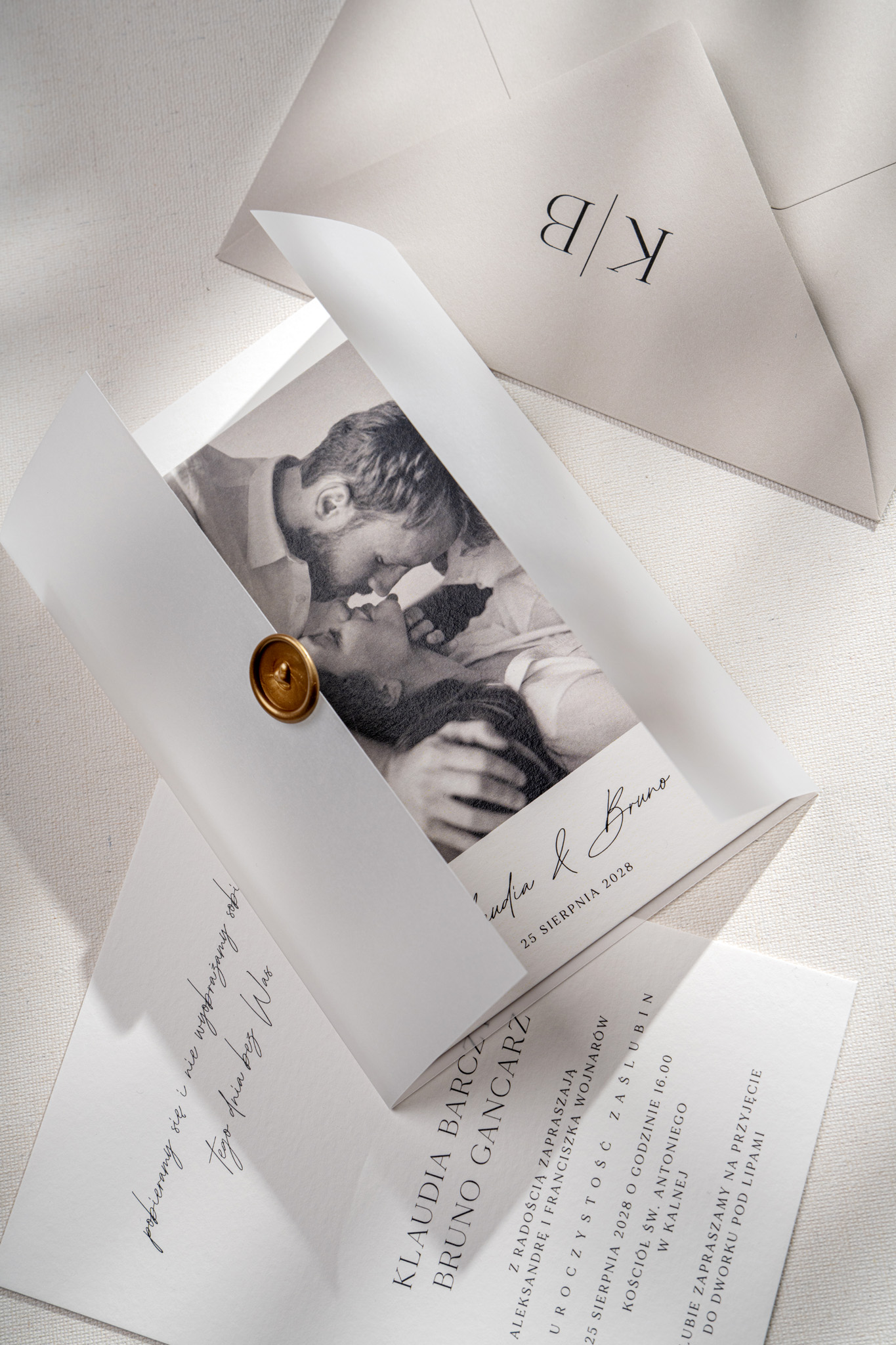 Wersja podstawowa: zaproszenie ze zdjęciem (dwie karty), koperta + stempel lakowy