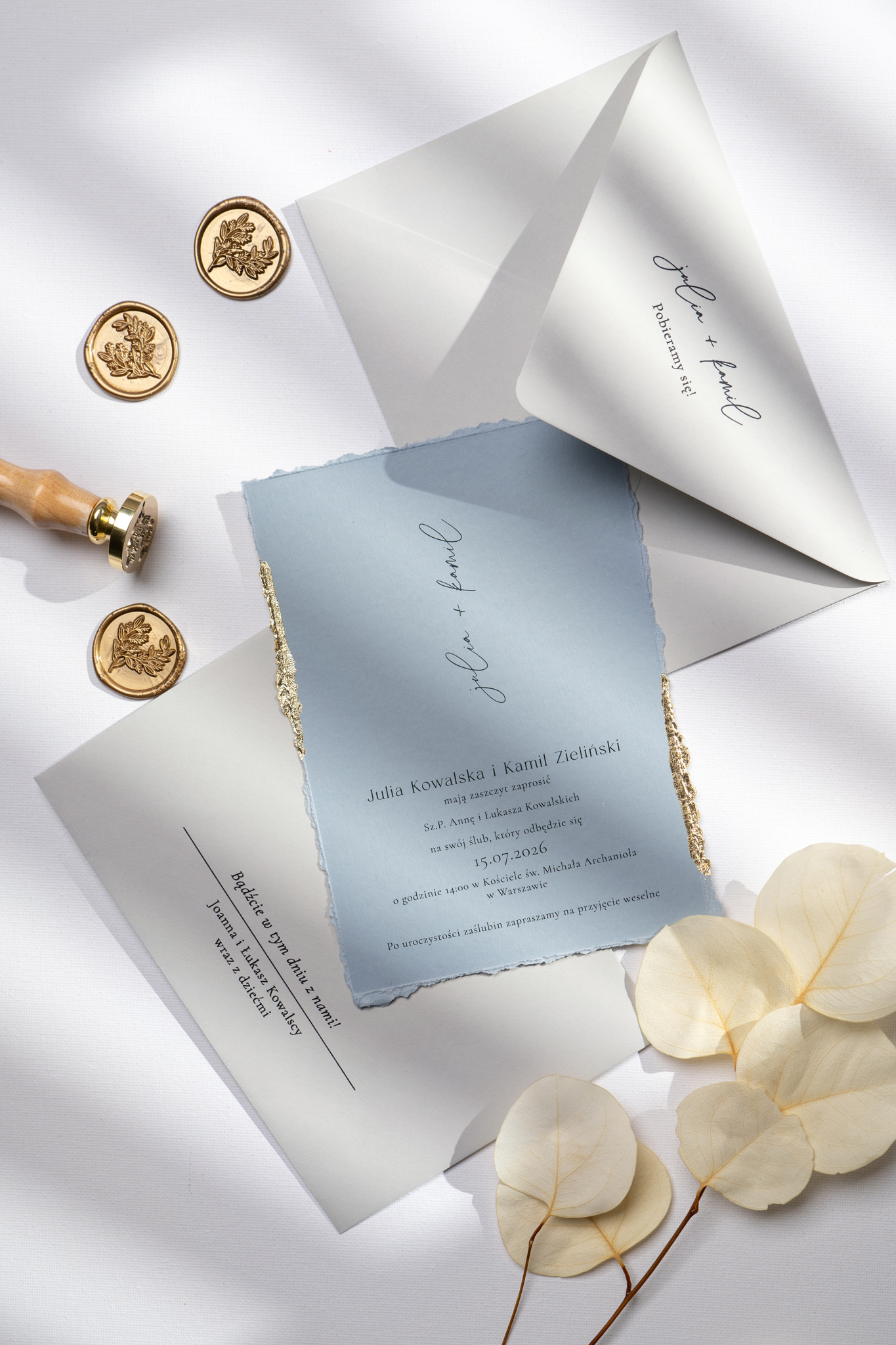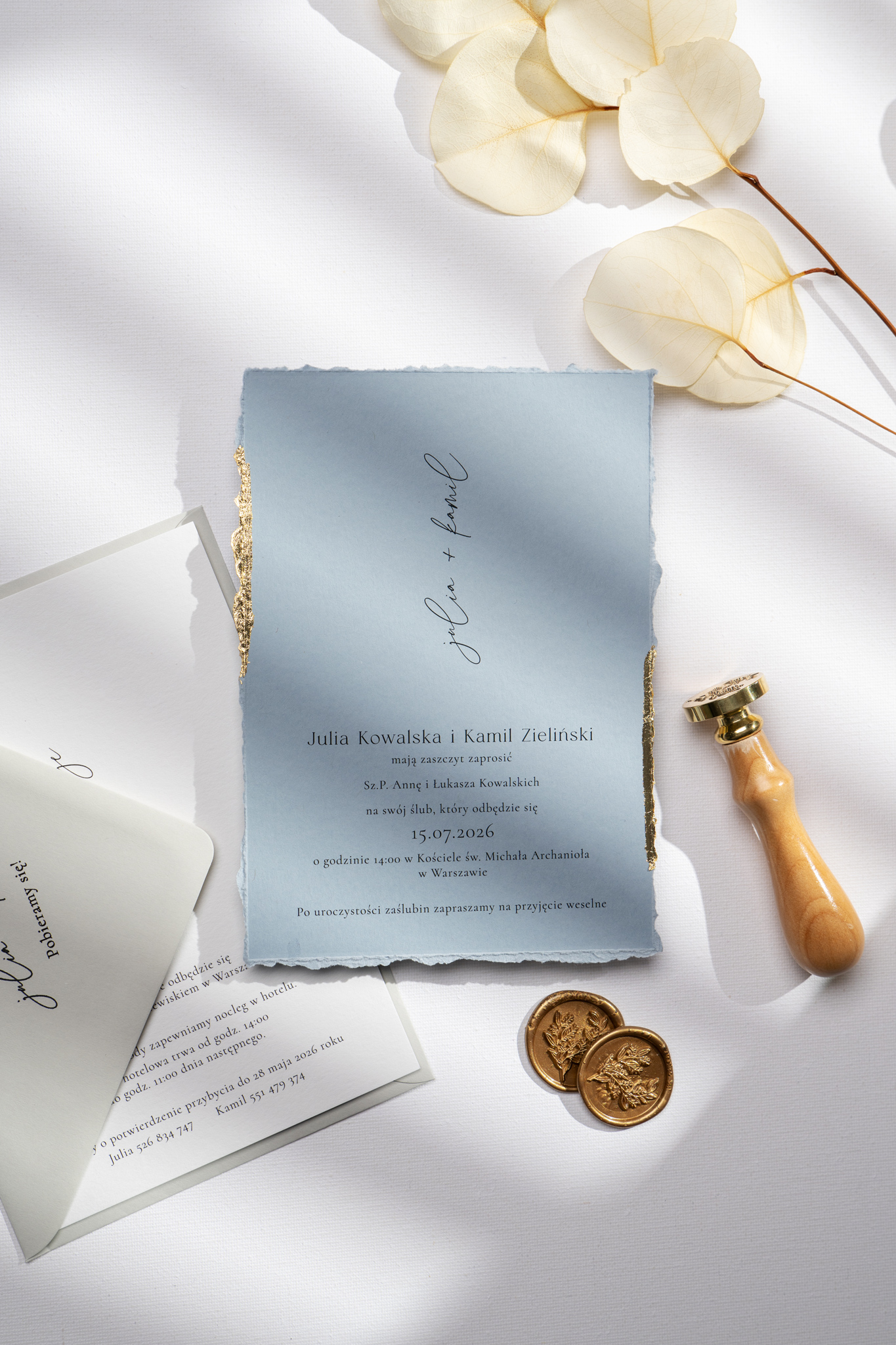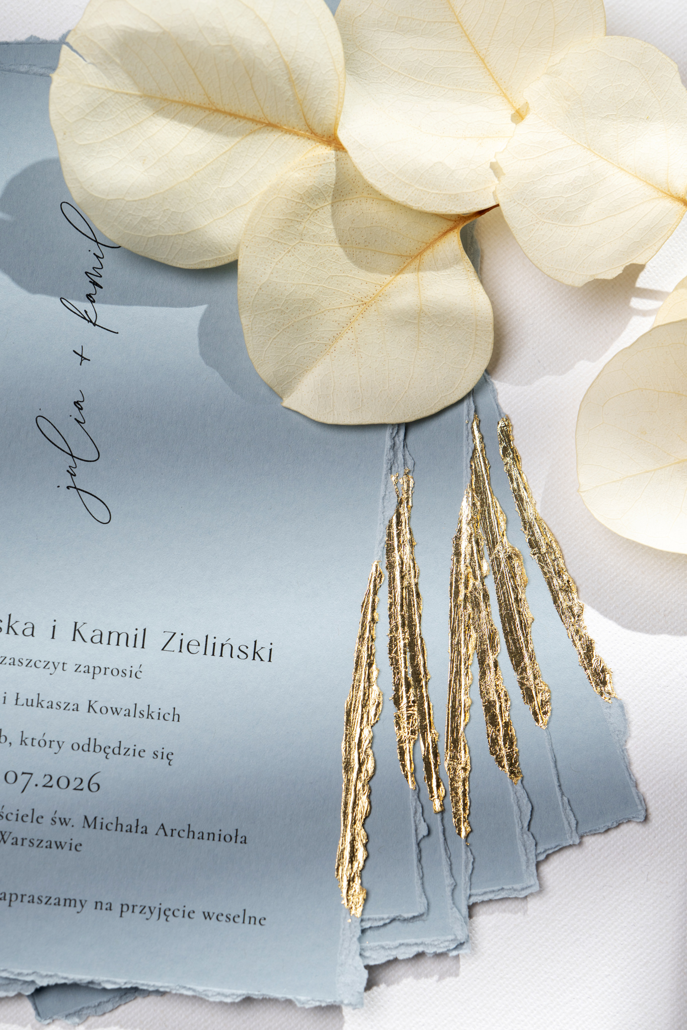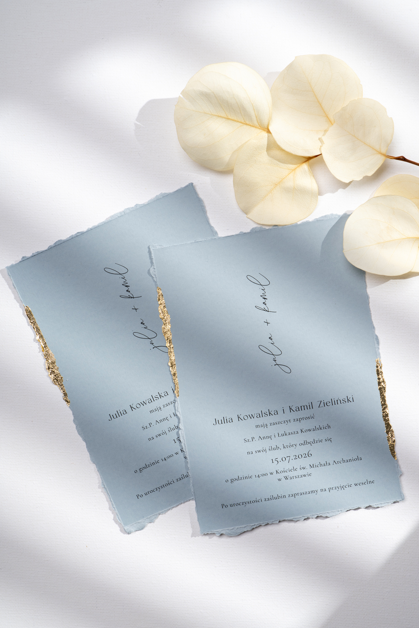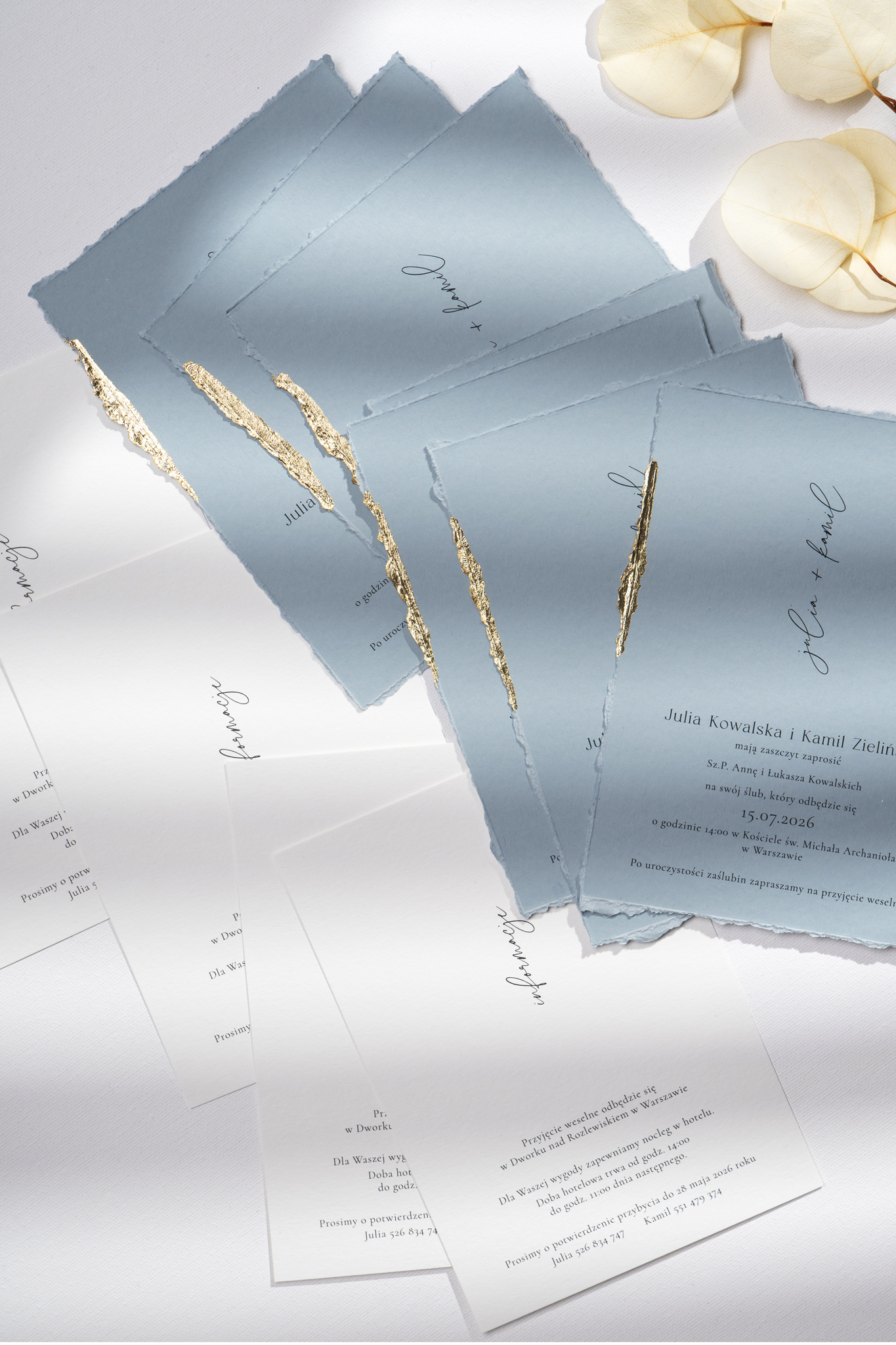 Stworzone z myślą o Parach, które cenią jakość, subtelność i staranne wykończenie. Zestaw składa się z dwóch kart: główna – w odcieniu dusty blue – wykonana jest z barwionego w masie papieru z rwanymi brzegami i złoceniem naniesionym ręcznie na dwóch krawędziach. Towarzyszy jej śmietankowa karta informacyjna, wykonana z bawełnianego papieru.