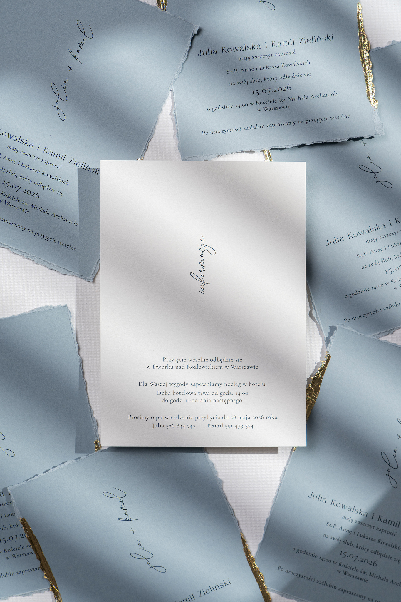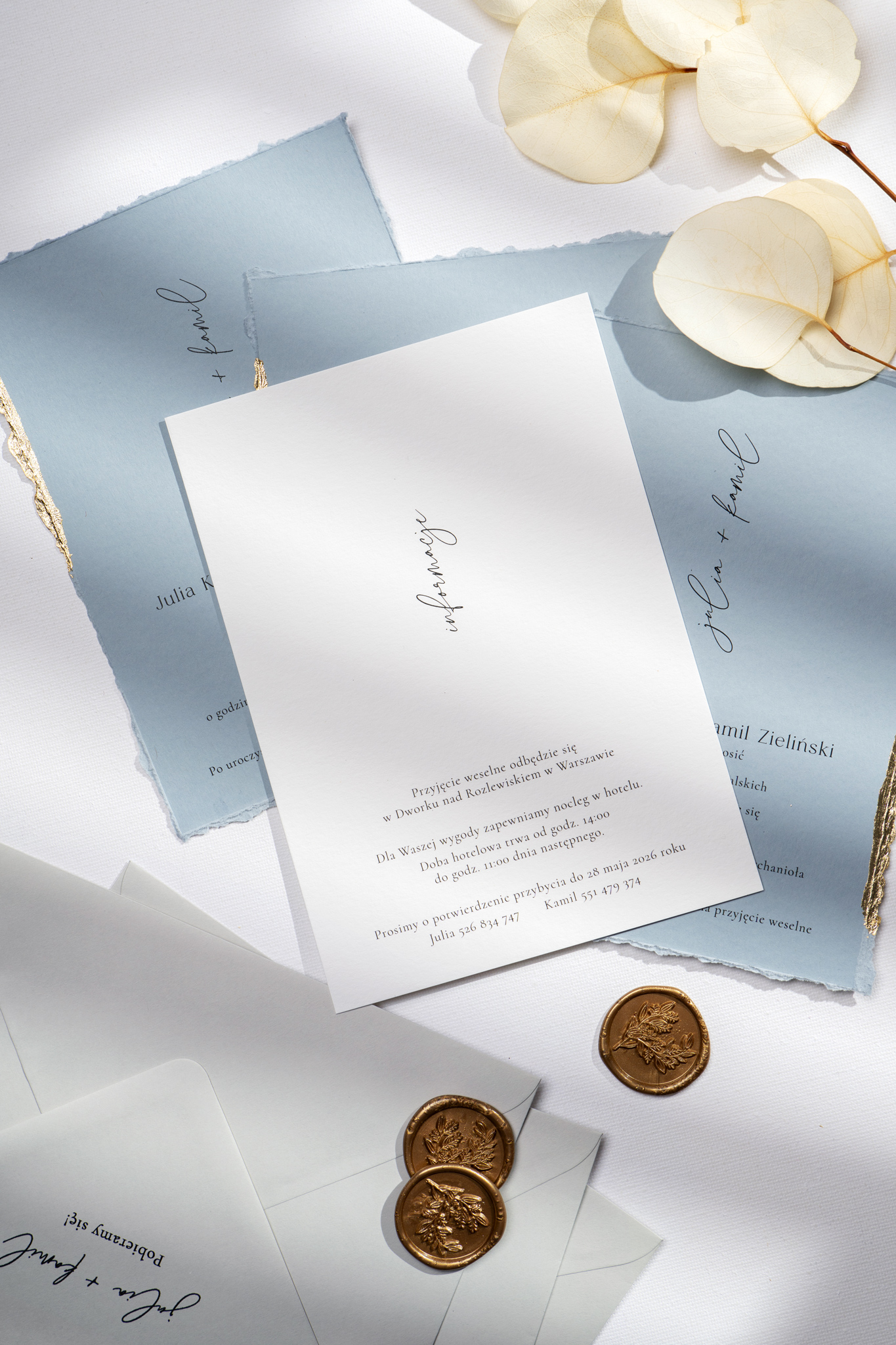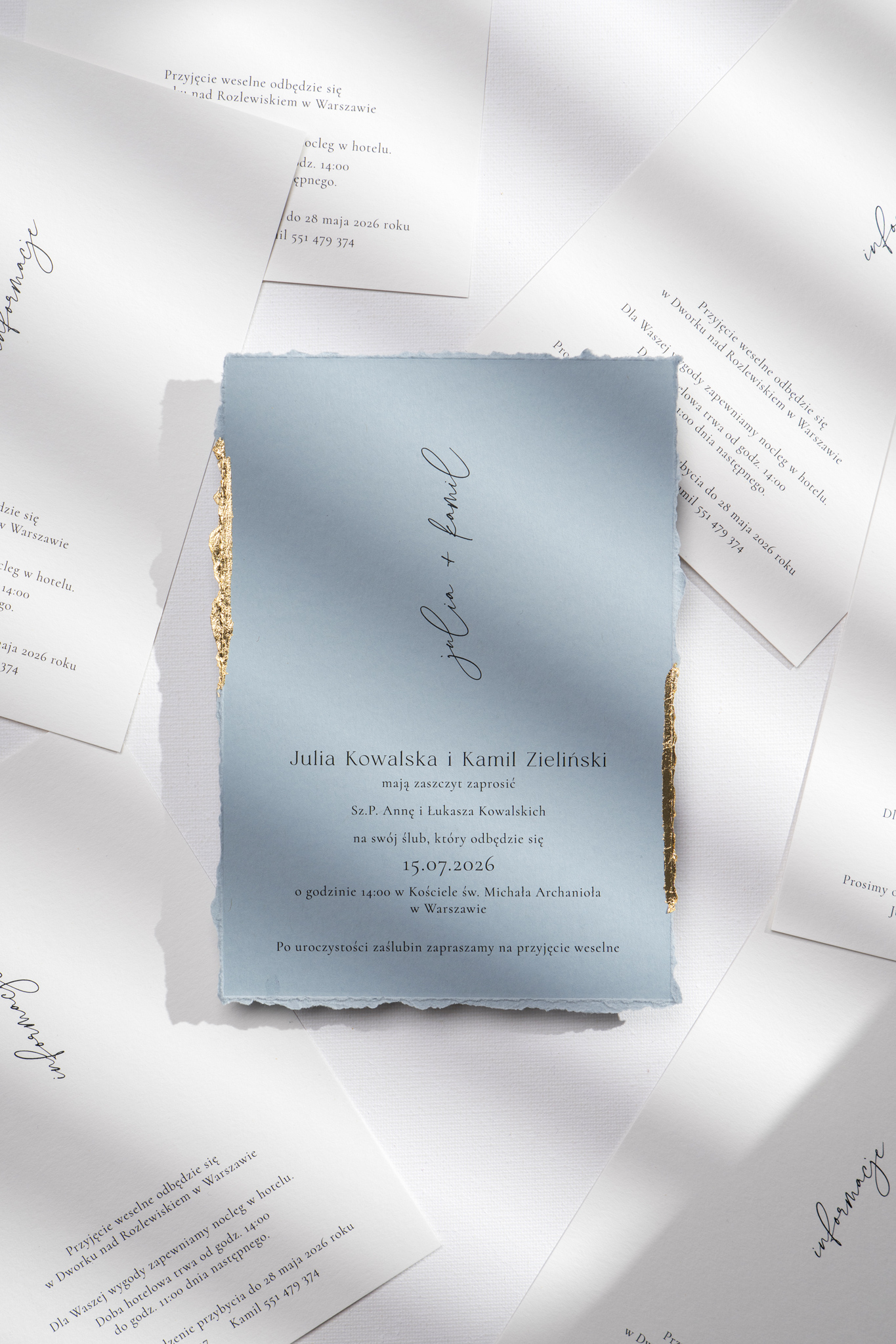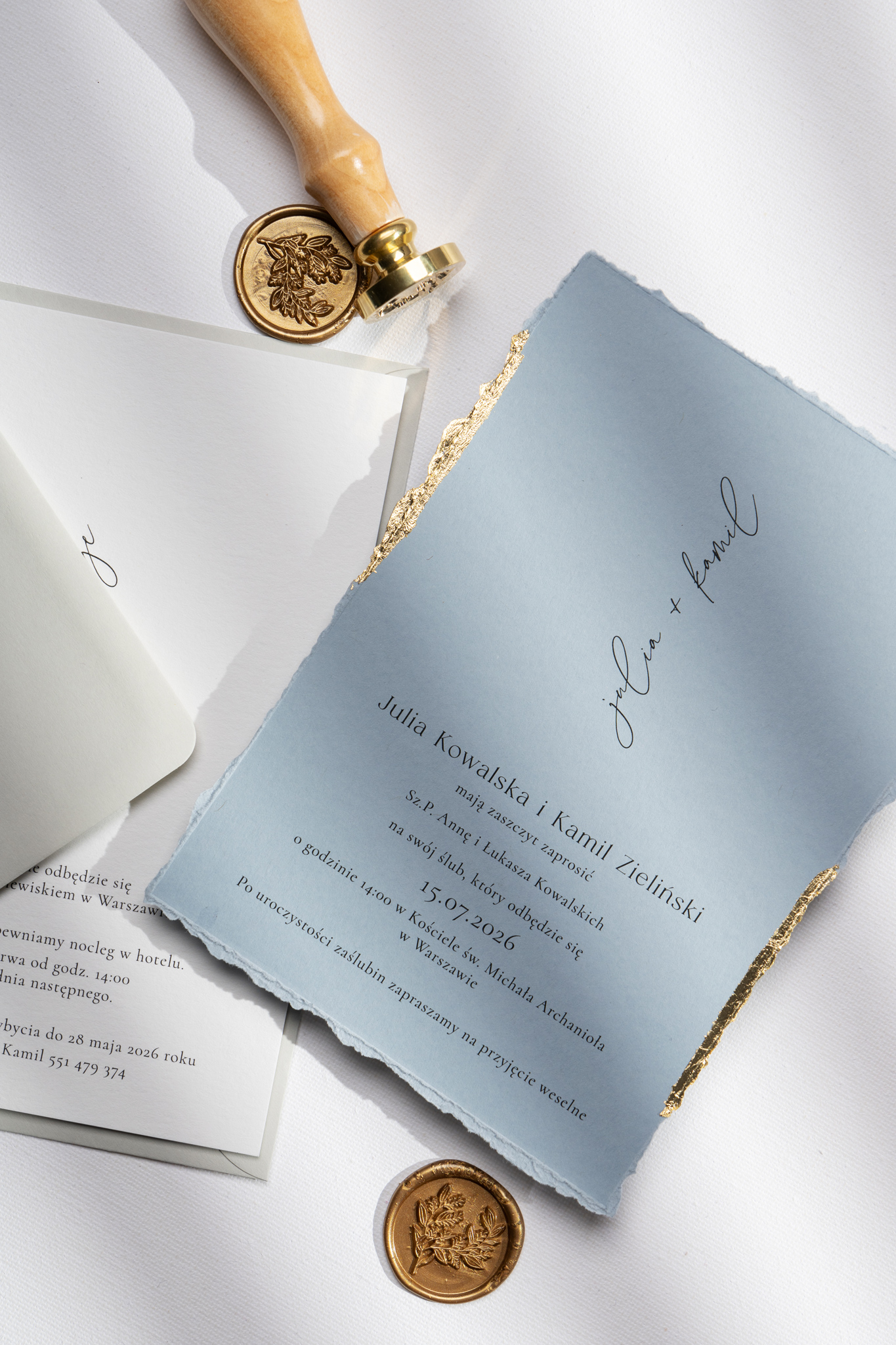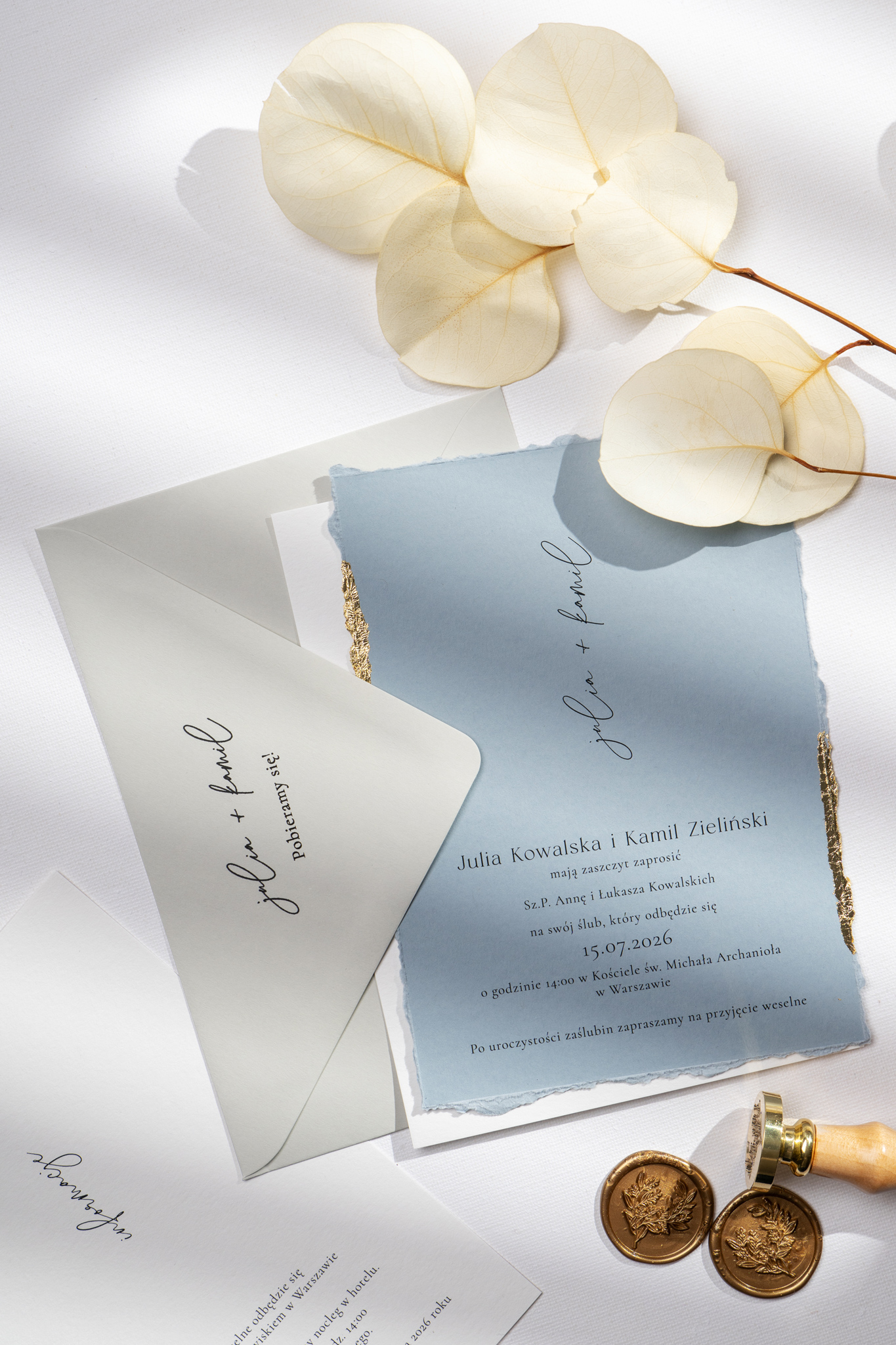 Stworzone z myślą o Parach, które cenią jakość, subtelność i staranne wykończenie. Zestaw składa się z dwóch kart: główna – w odcieniu dusty blue – wykonana jest z barwionego w masie papieru z rwanymi brzegami i złoceniem naniesionym ręcznie na dwóch krawędziach. Towarzyszy jej śmietankowa karta informacyjna, wykonana z bawełnianego papieru.