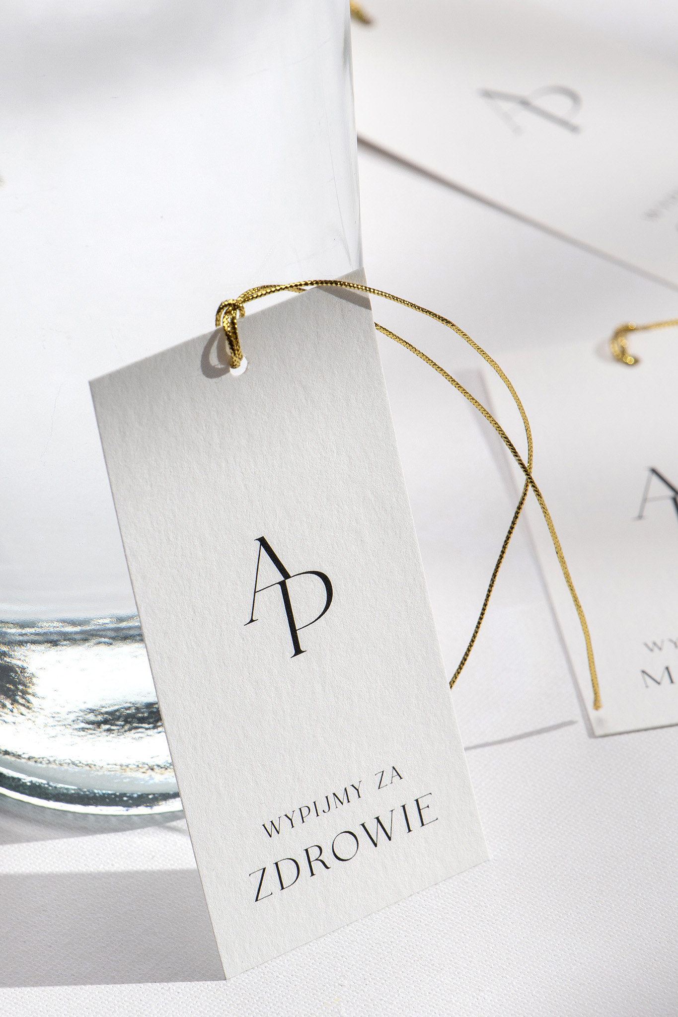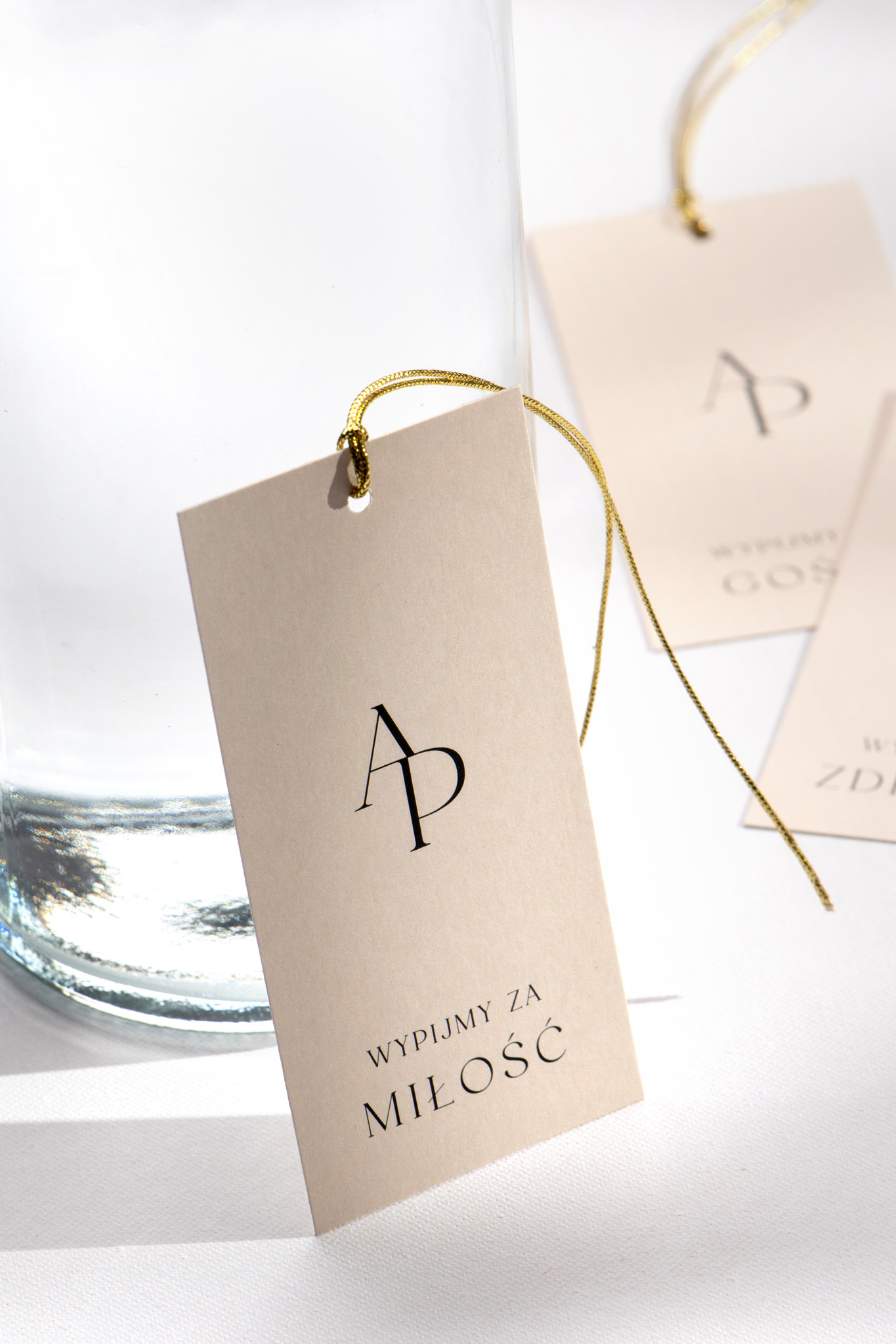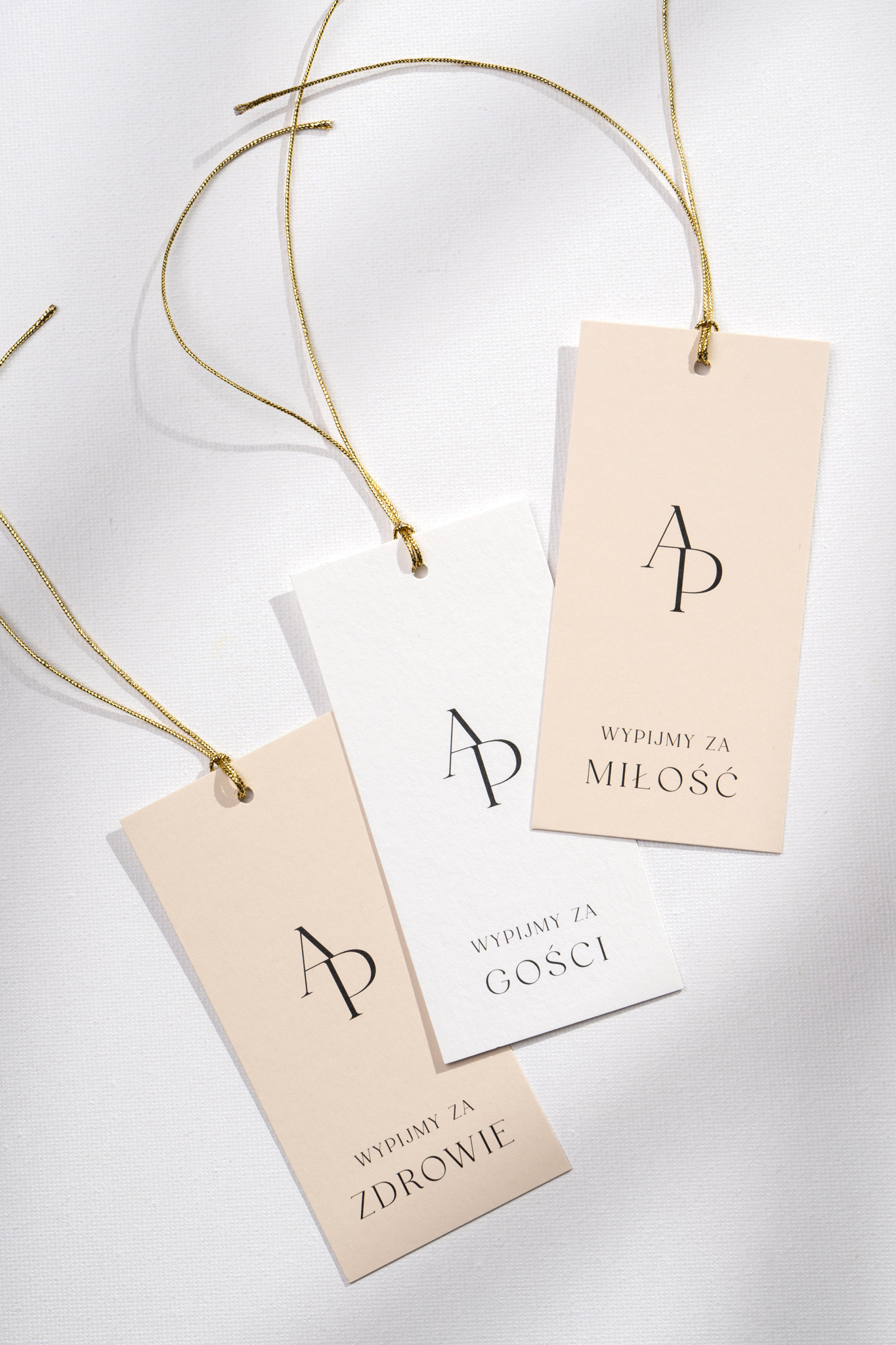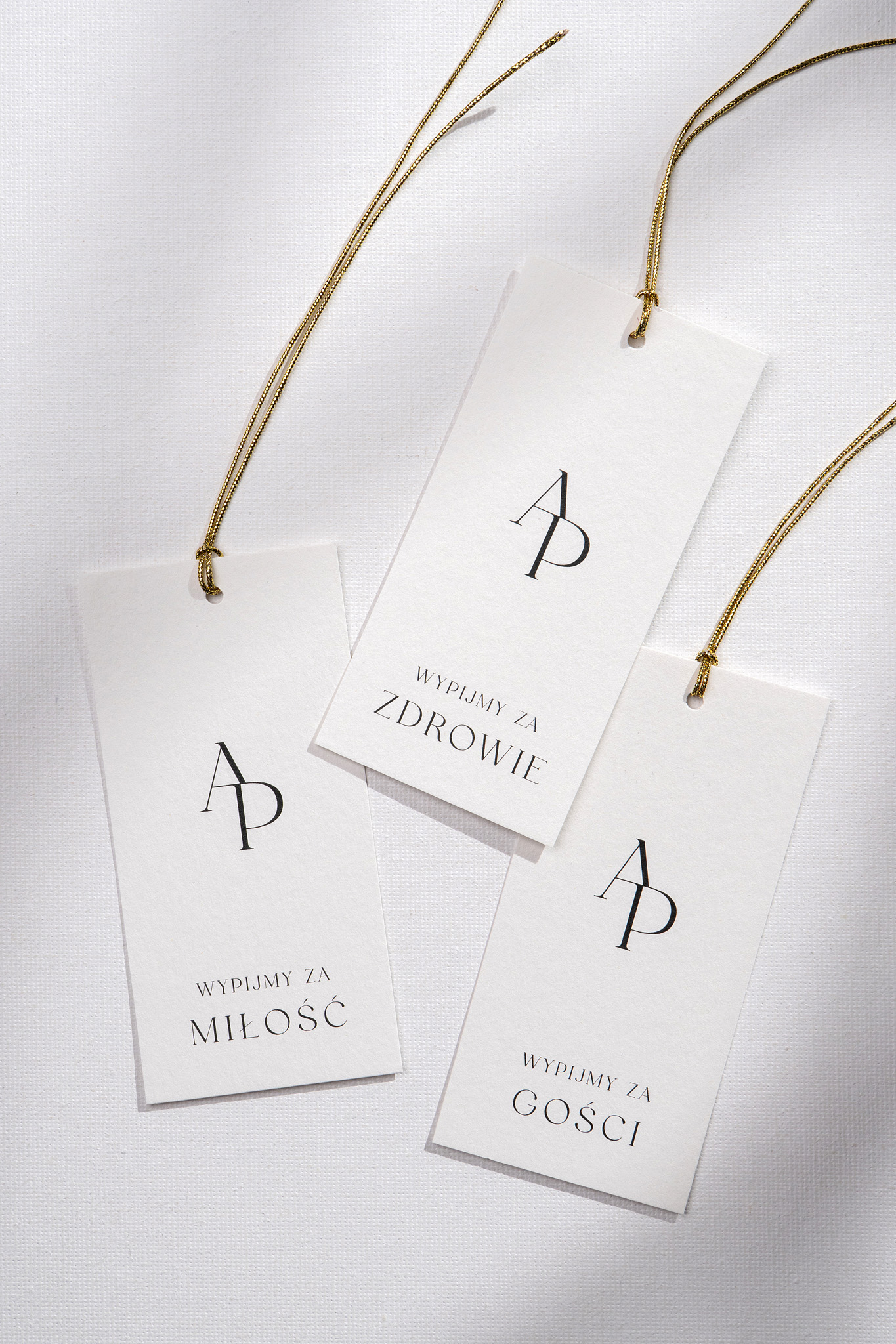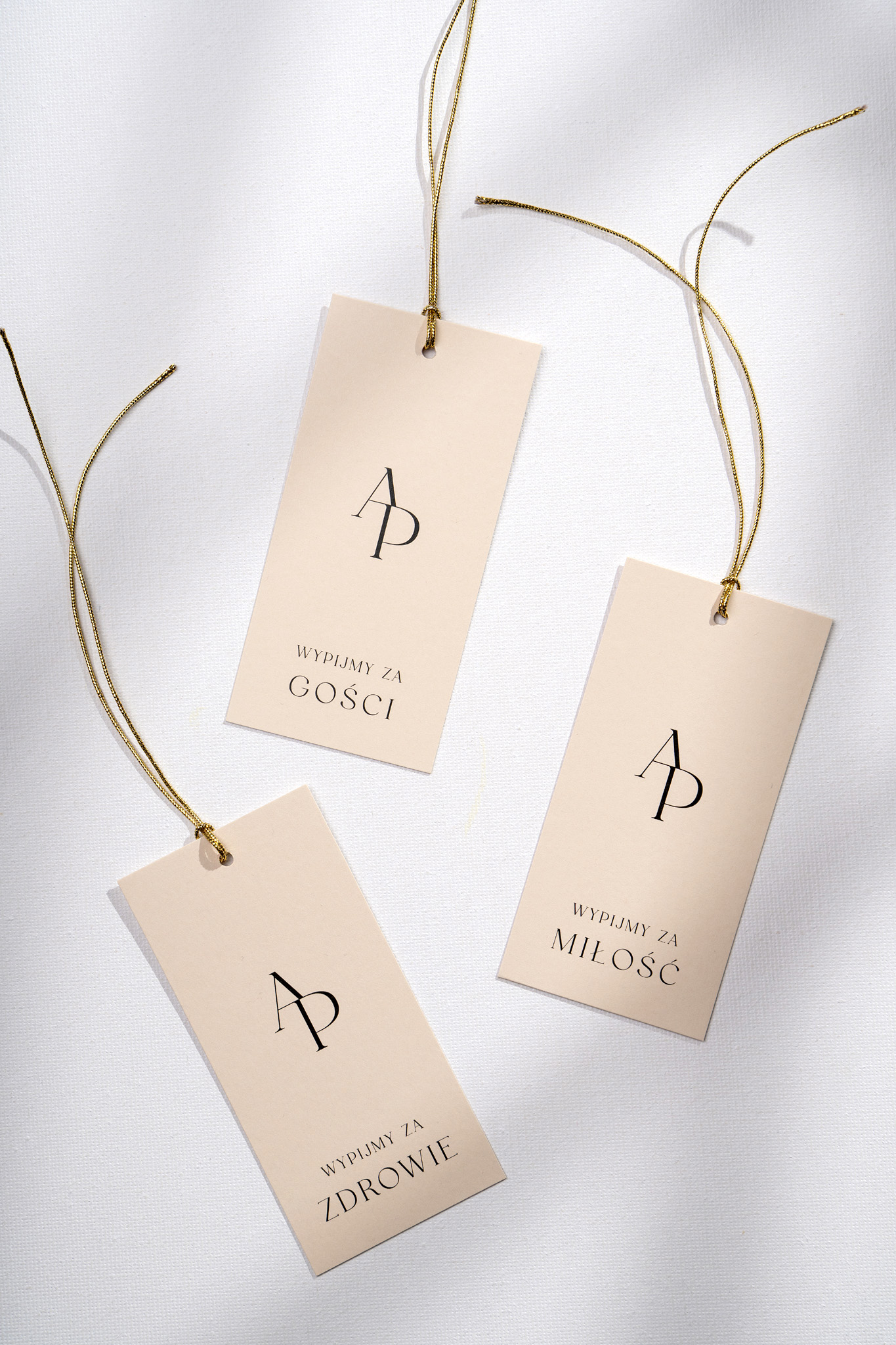 Złoty sznureczek dodaje im subtelnego blasku, a monogram Pary Młodej nadaje wyjątkowego, indywidualnego charakteru. Idealne, by dodać ślubnym butelkom stylowego i spójnego z resztą dekoracji wykończenia.
